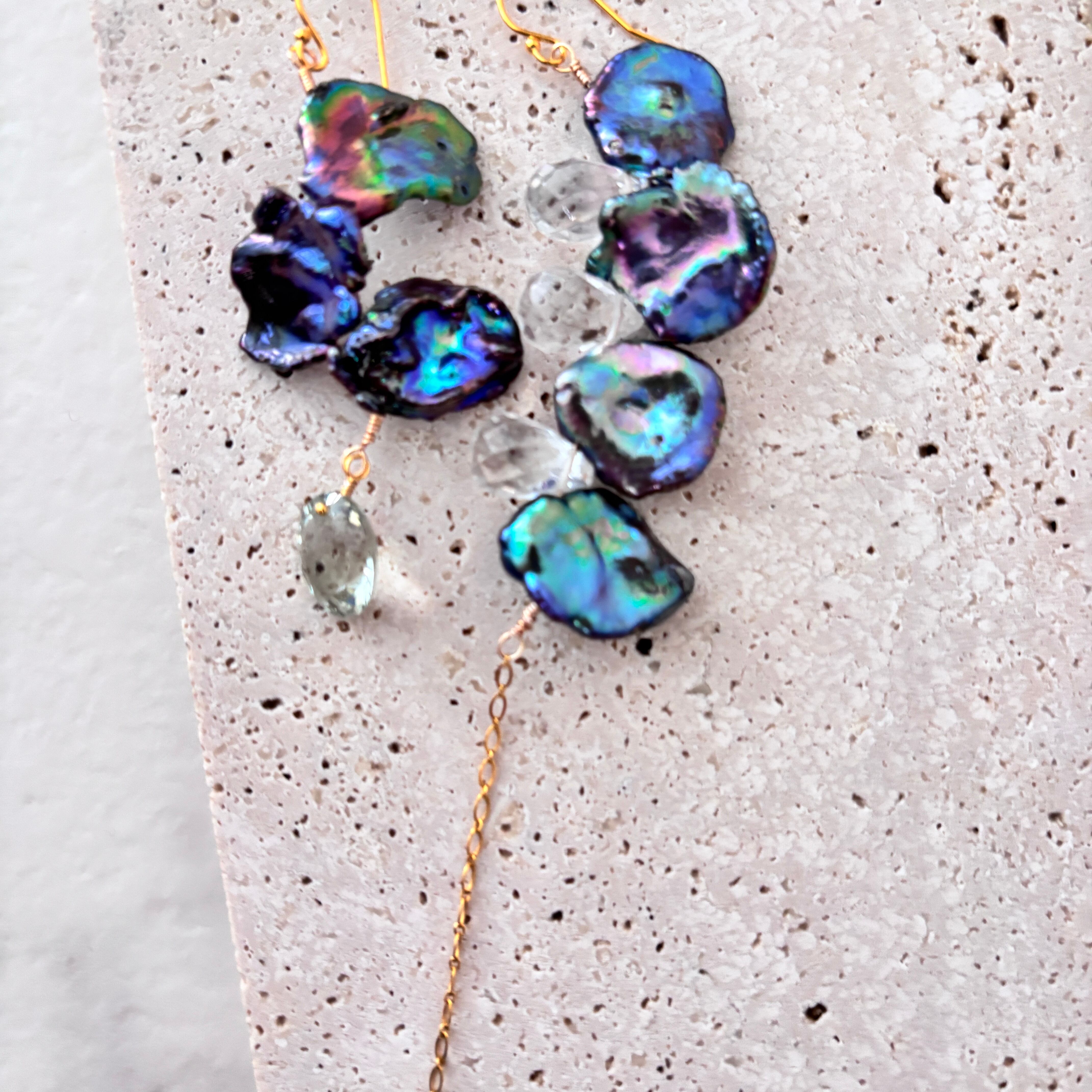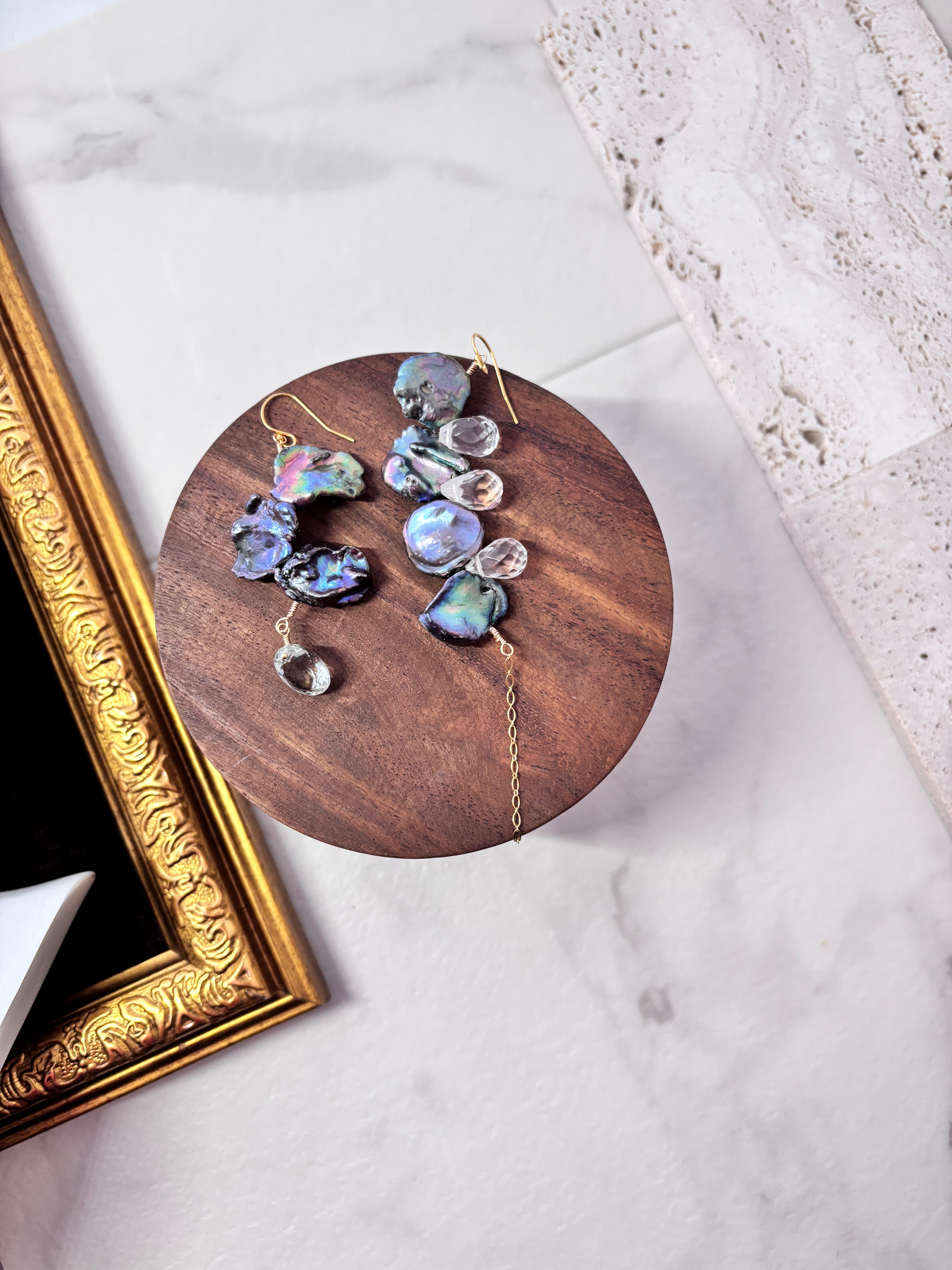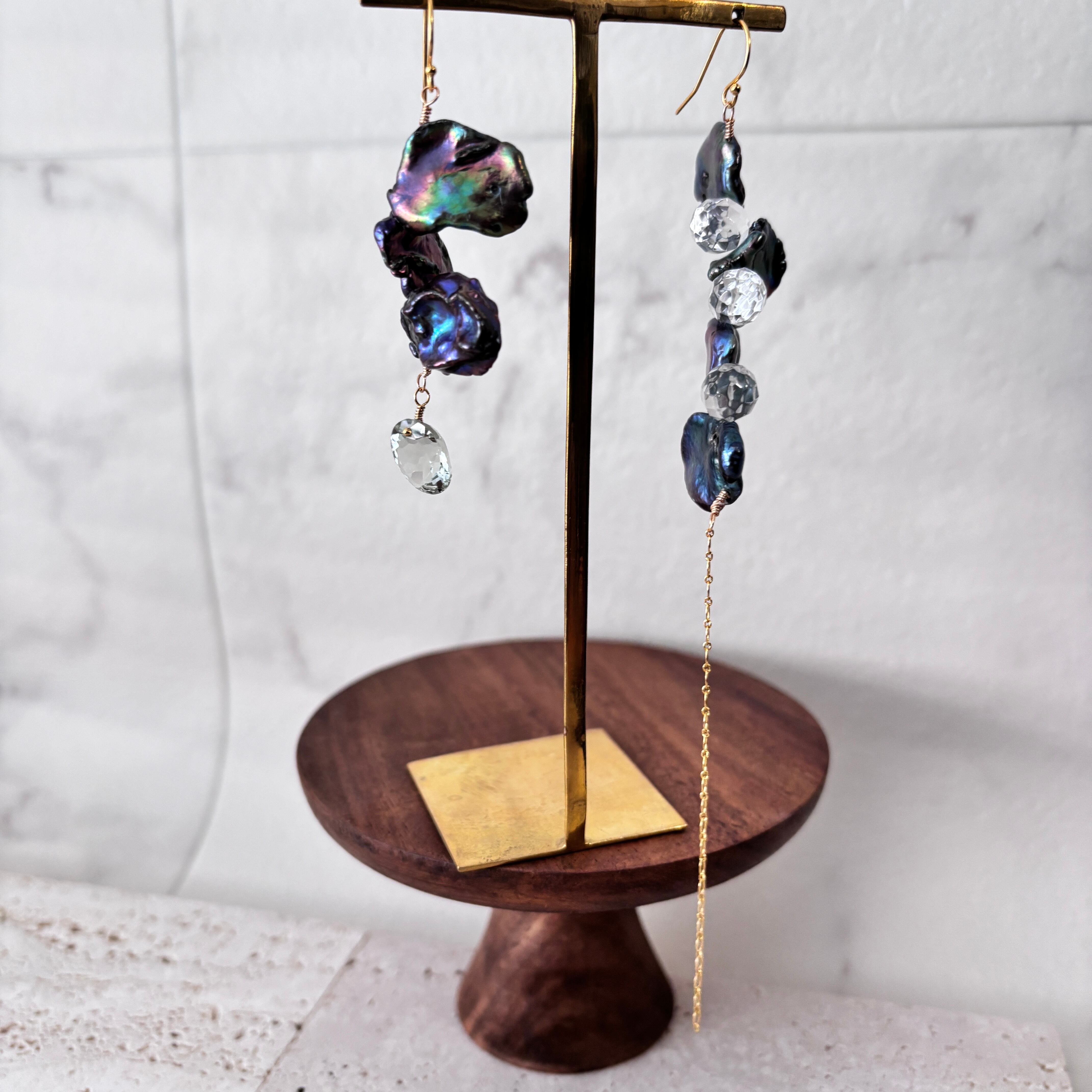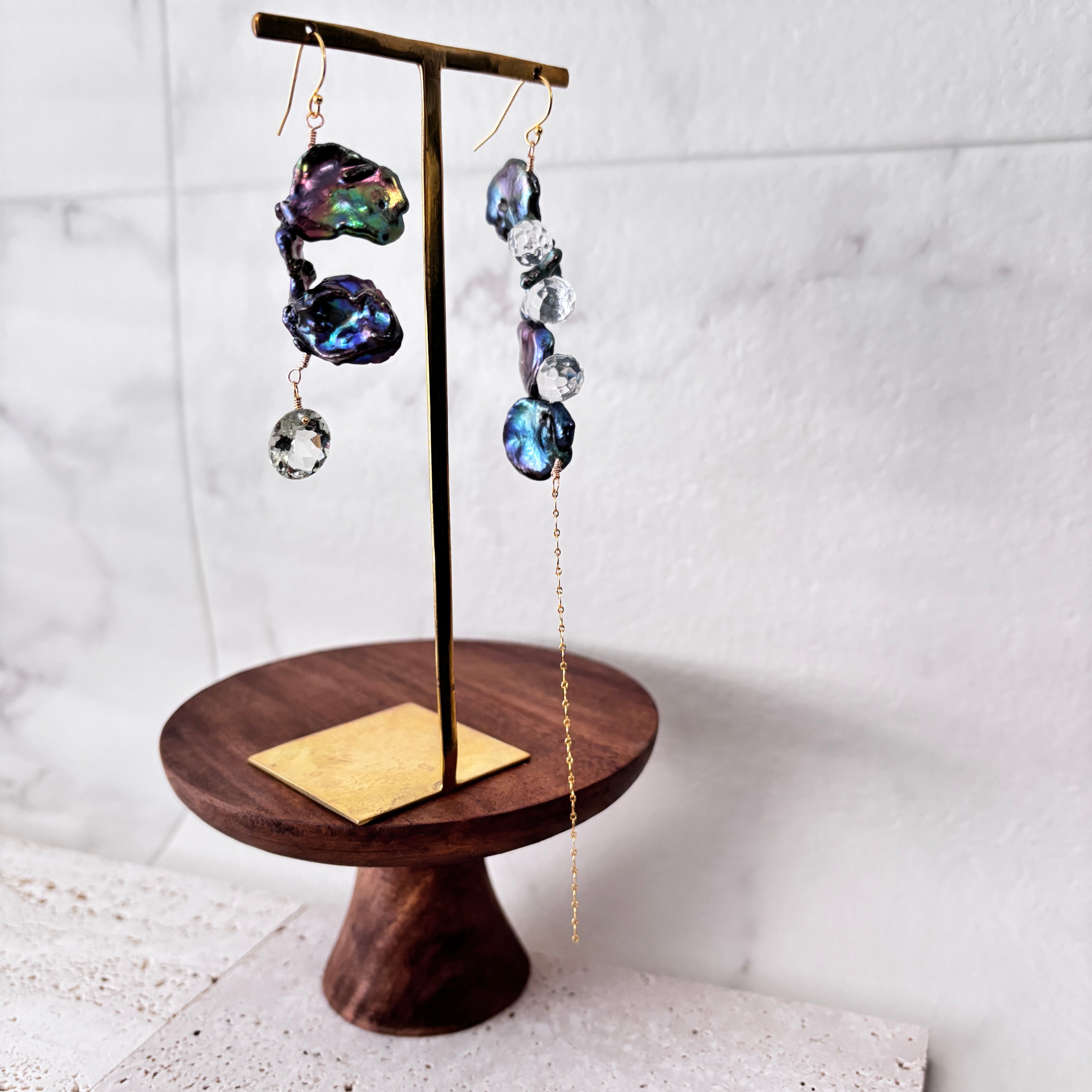 このデザインピアスは、淡水パールやカット水晶、グリーンクォーツを使用した特別な1点物です。それぞれ異なるカタチやカラーのパーツが組み合わさり、オリジナルデザインのアシンメトリーなスタイルが魅力。特別な日のお出かけから普段使いまで、耳元を華やかに彩り、あなたの個性を一層引き立てるお手伝いができれば嬉しいです。