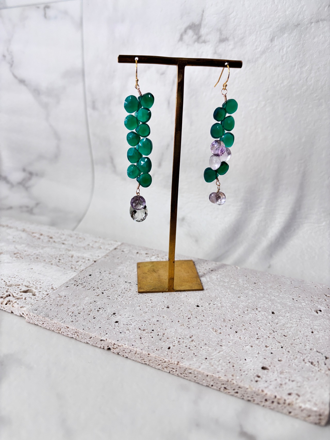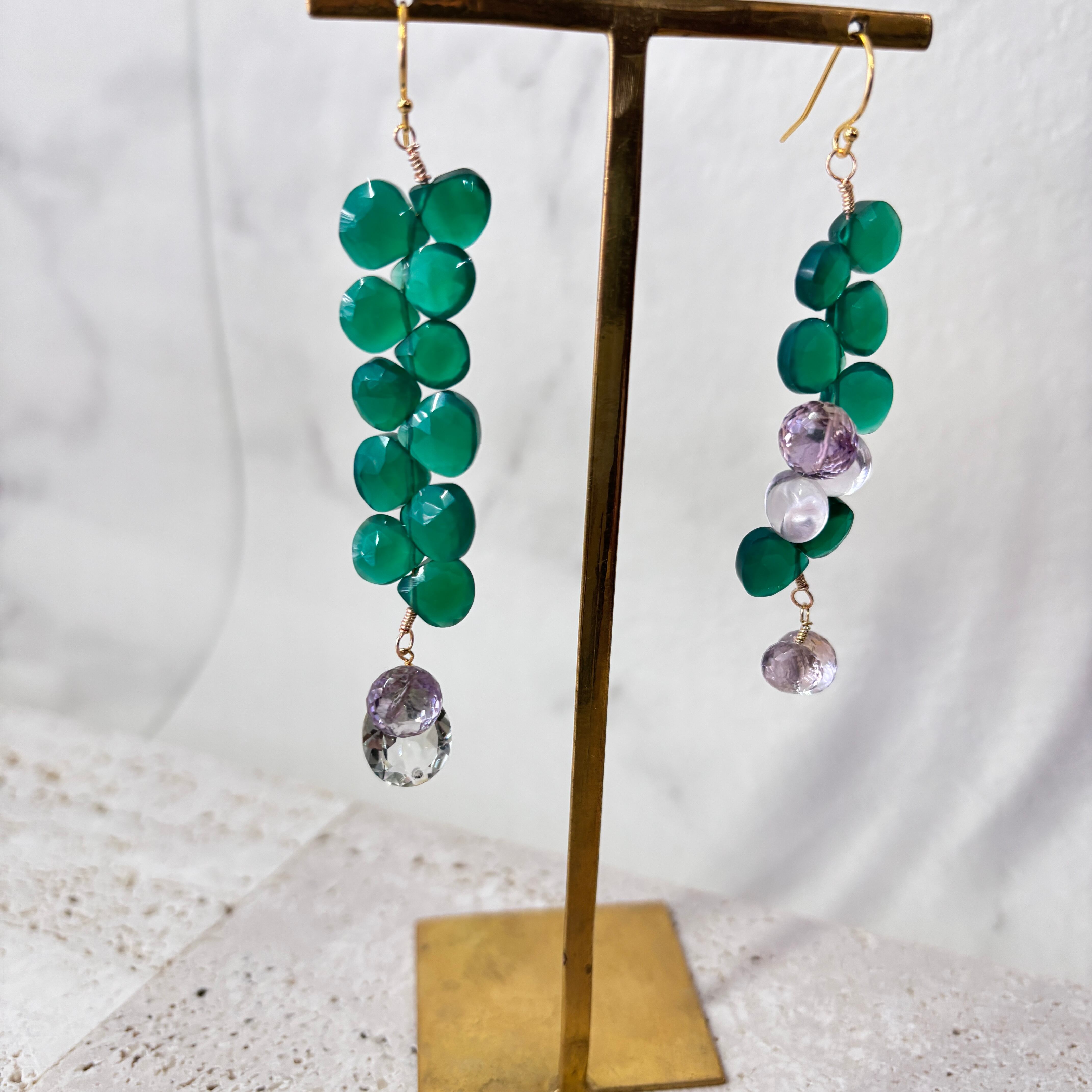 このデザインピアスは、カット天然グリーンカルセドニーとアメシストの美しいコントラストが魅力の1点物です。オリジナルデザインのアシンメトリーなスタイルで、普段使いから特別な日のお出かけまで、耳元を鮮やかに演出し、あなたの個性を引き立てるお手伝いができれば嬉しいです。