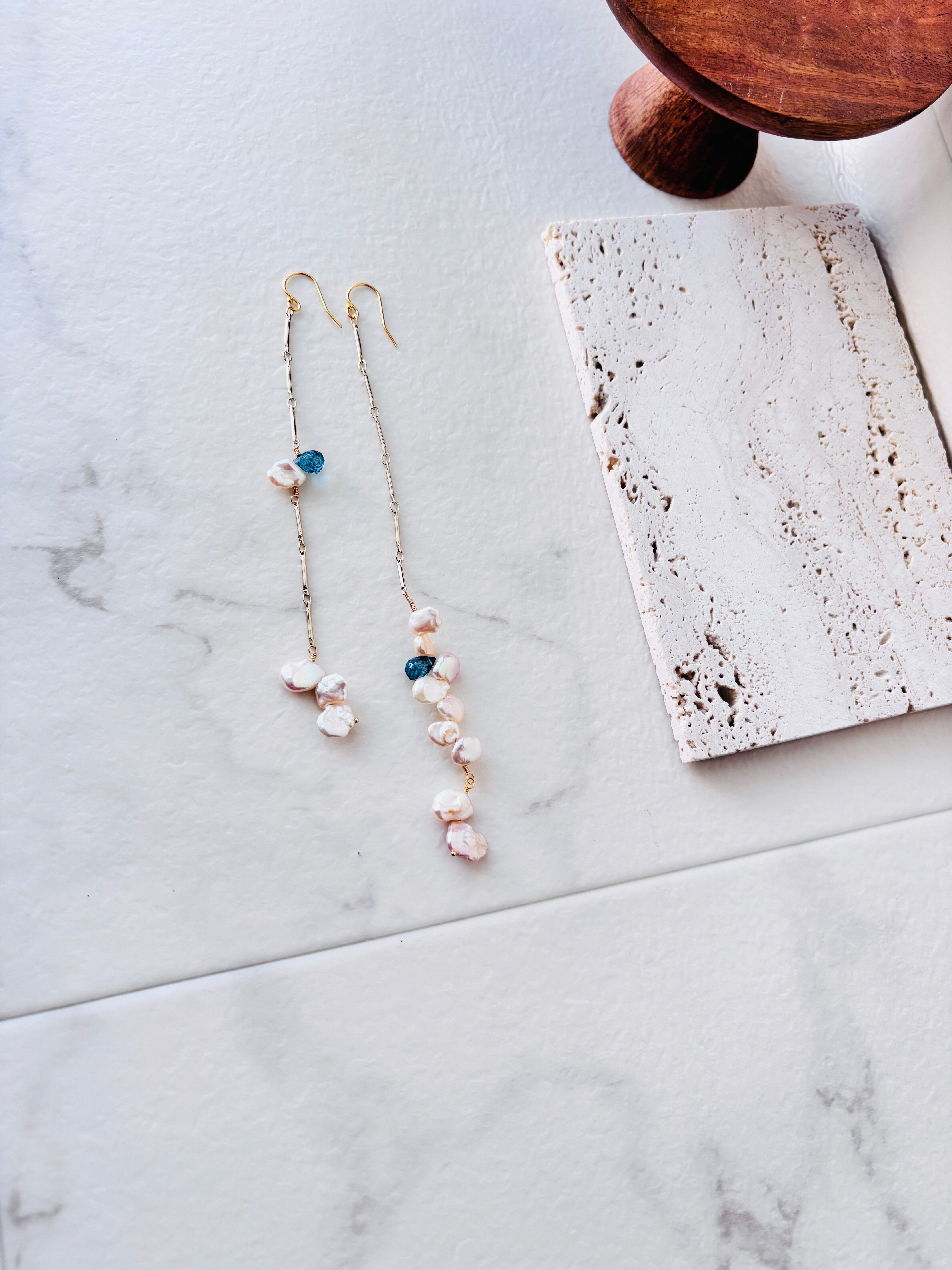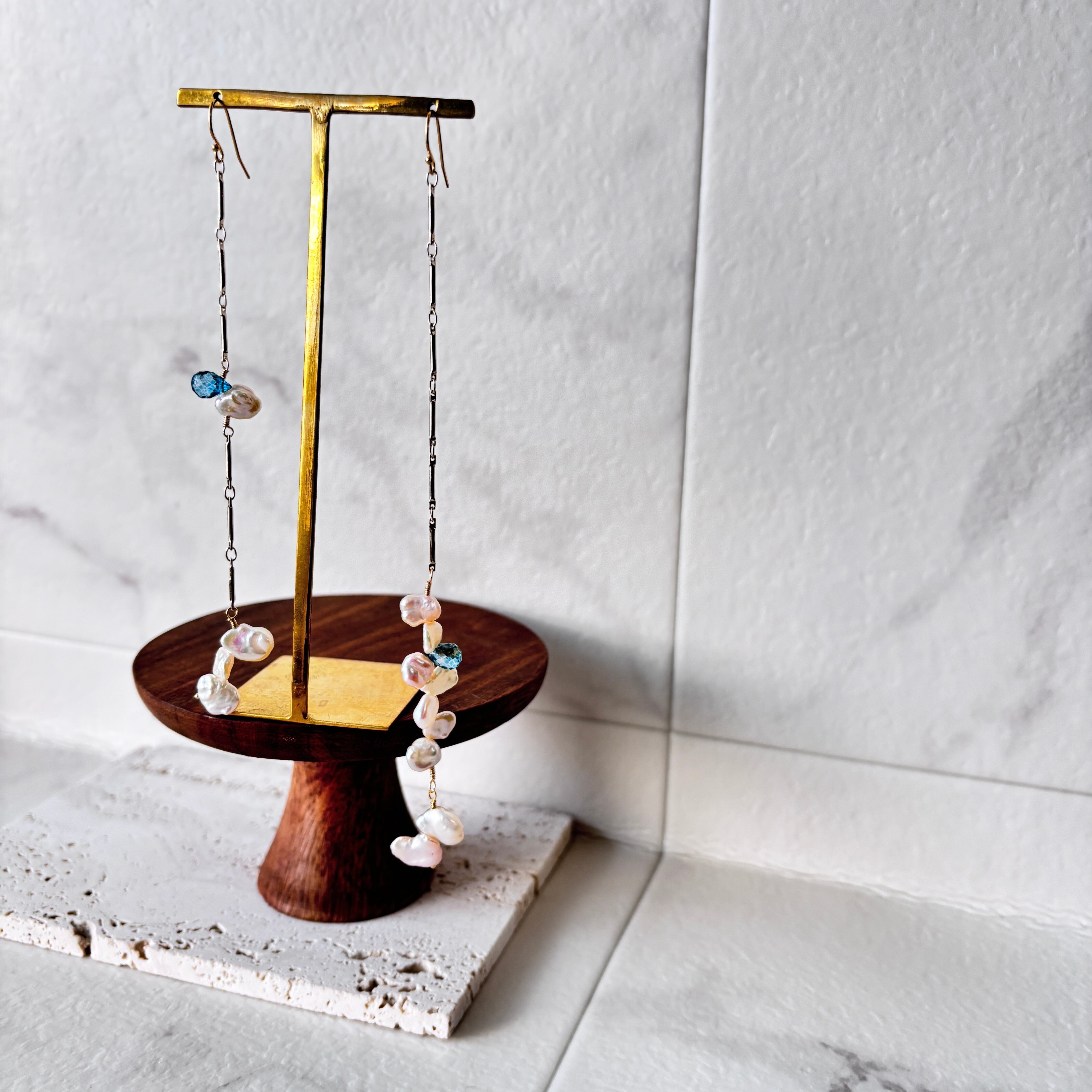 このデザインピアスは、ブルートパーズと淡水パールを贅沢に使用した特別な1点物です。オリジナルデザインのロングスタイルは、どんな装いにも映える華やかさを演出し、あなたの個性を引き立てます。特別な日や日常使いのどちらにもぴったりで、耳元で揺れる美しい輝きが印象に残ります。