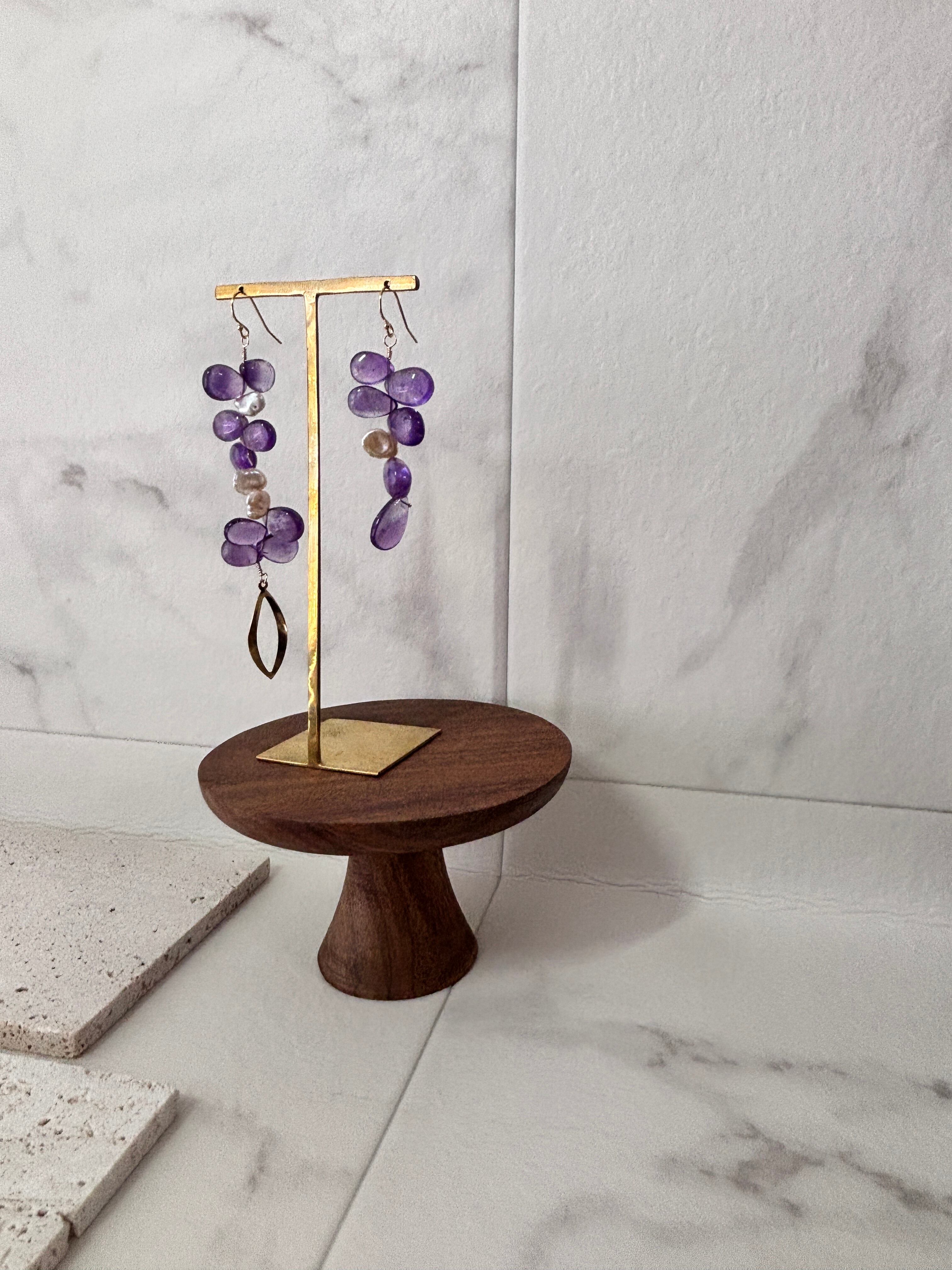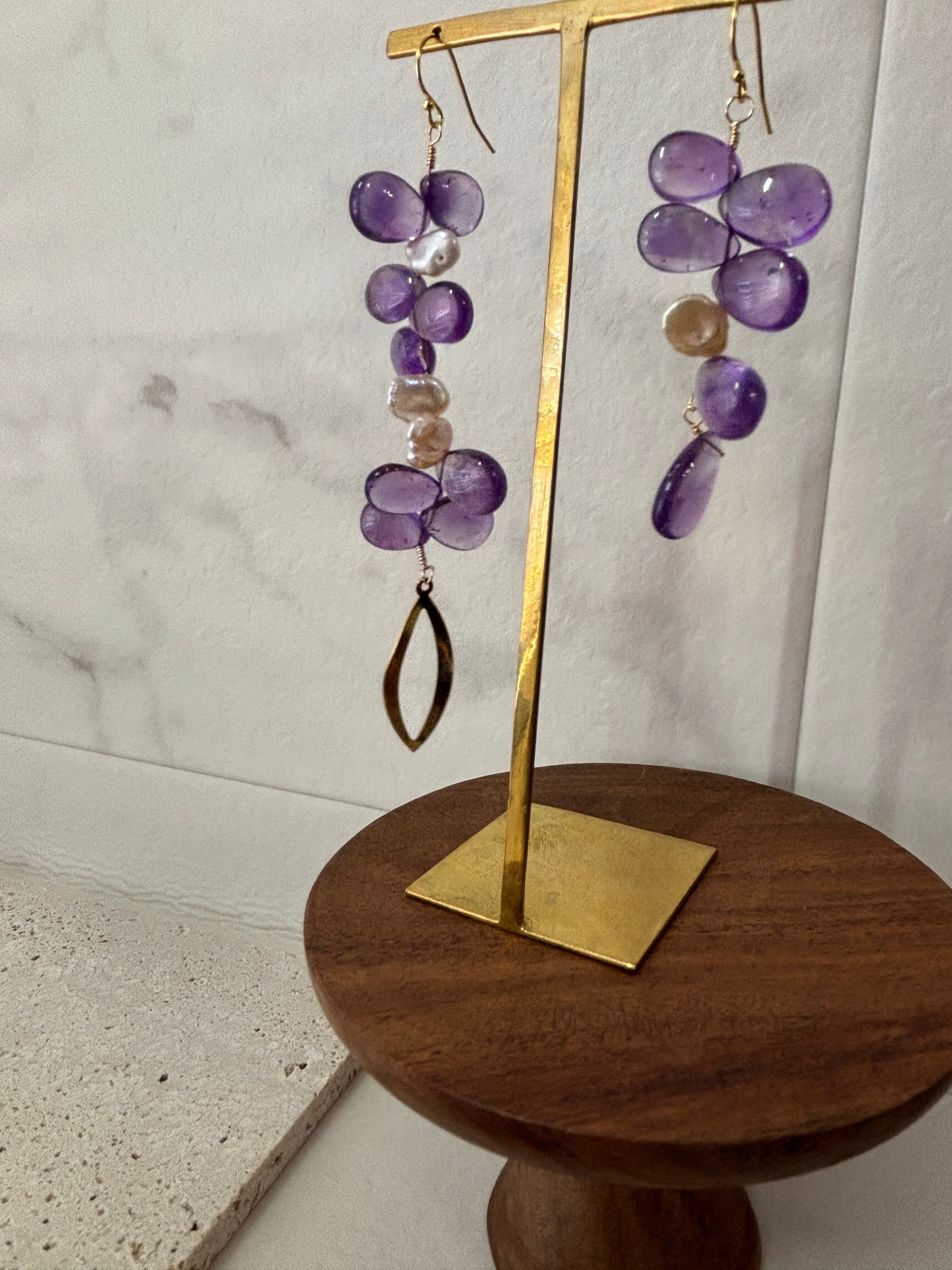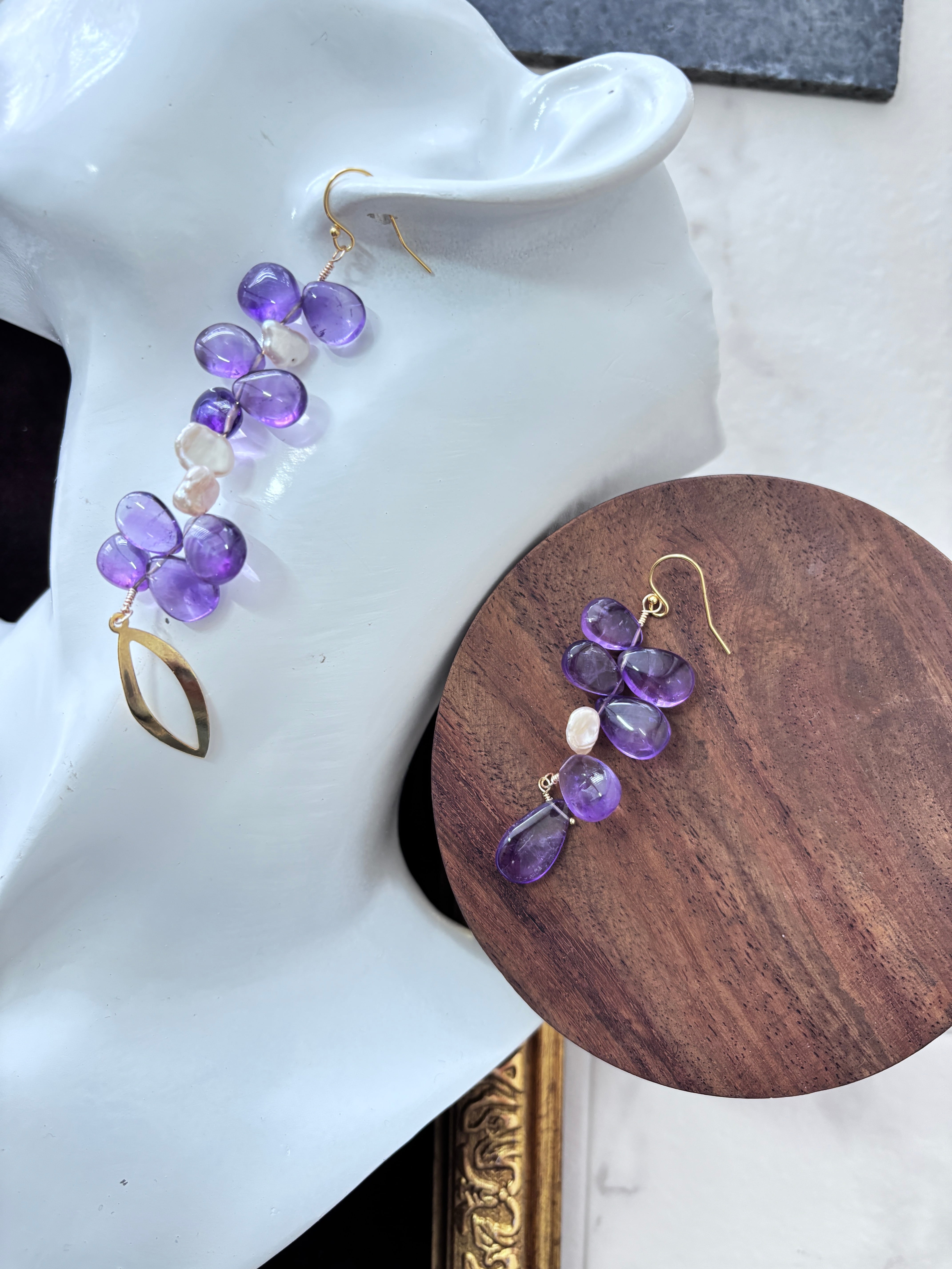 アメシストと淡水パールを贅沢に用いた特別な一点物です。オリジナルデザインスタイルは、シンプルながらも存在感があり、あなたの個性を美しく引き立てます。特別な日や日常使いに最適で、耳元で揺れるエレガントな輝きが、周囲の目を惹きつけることでしょう