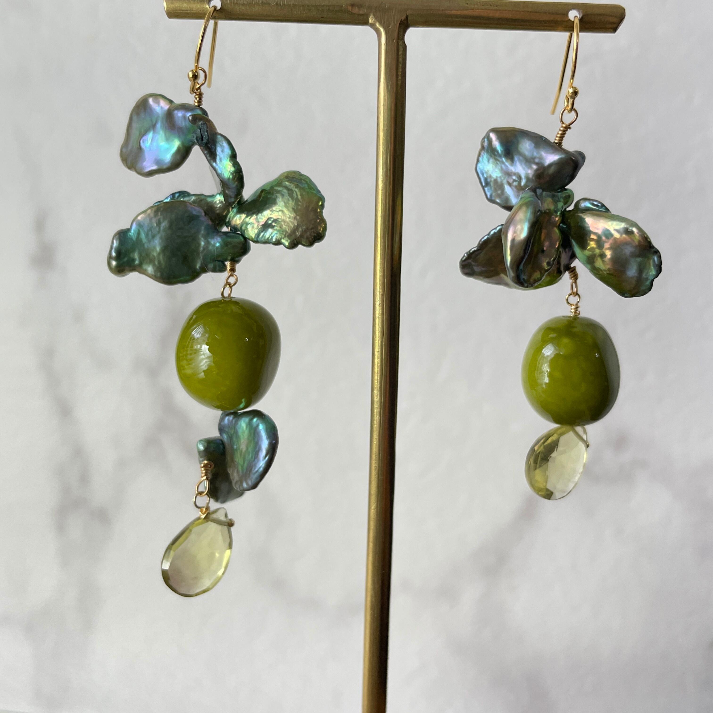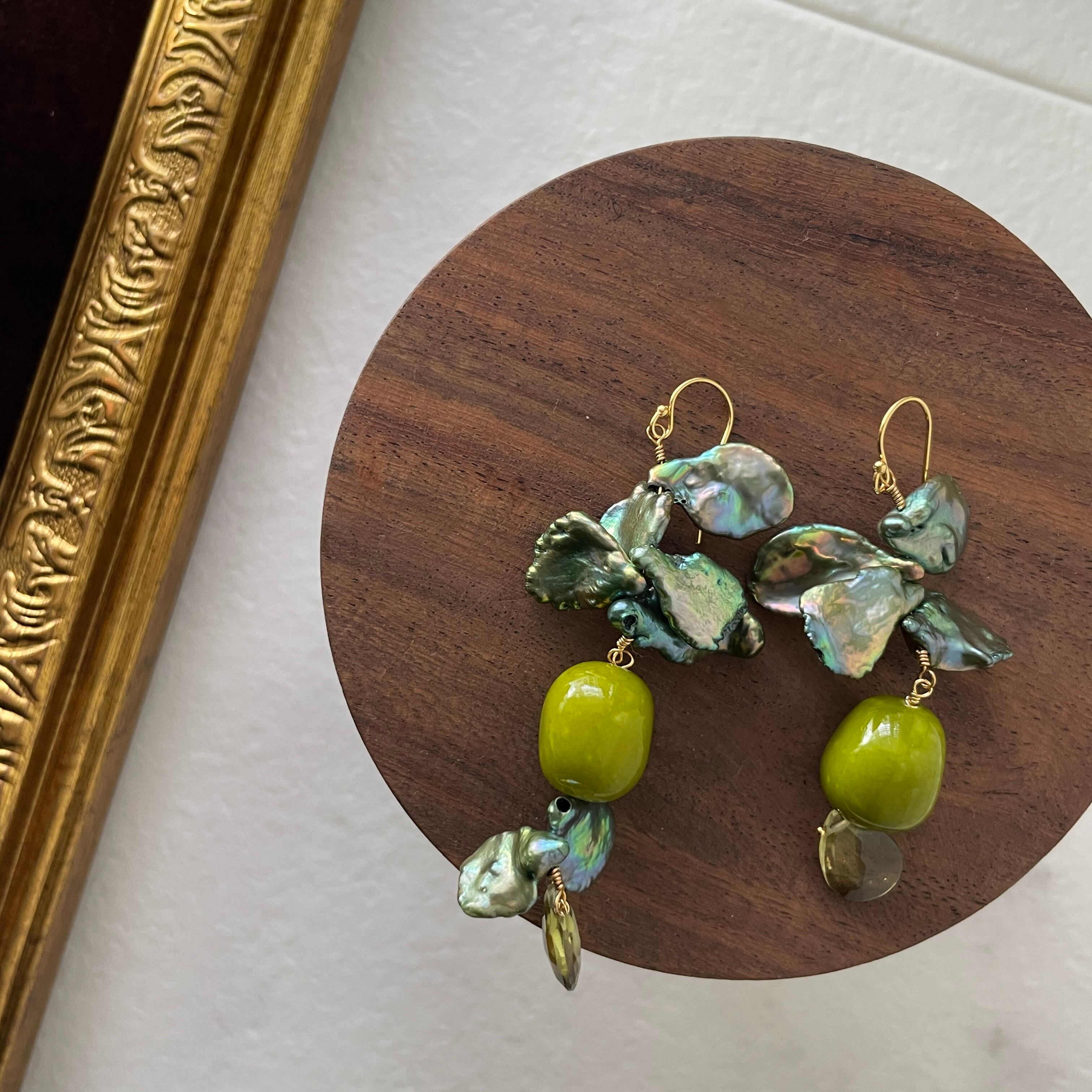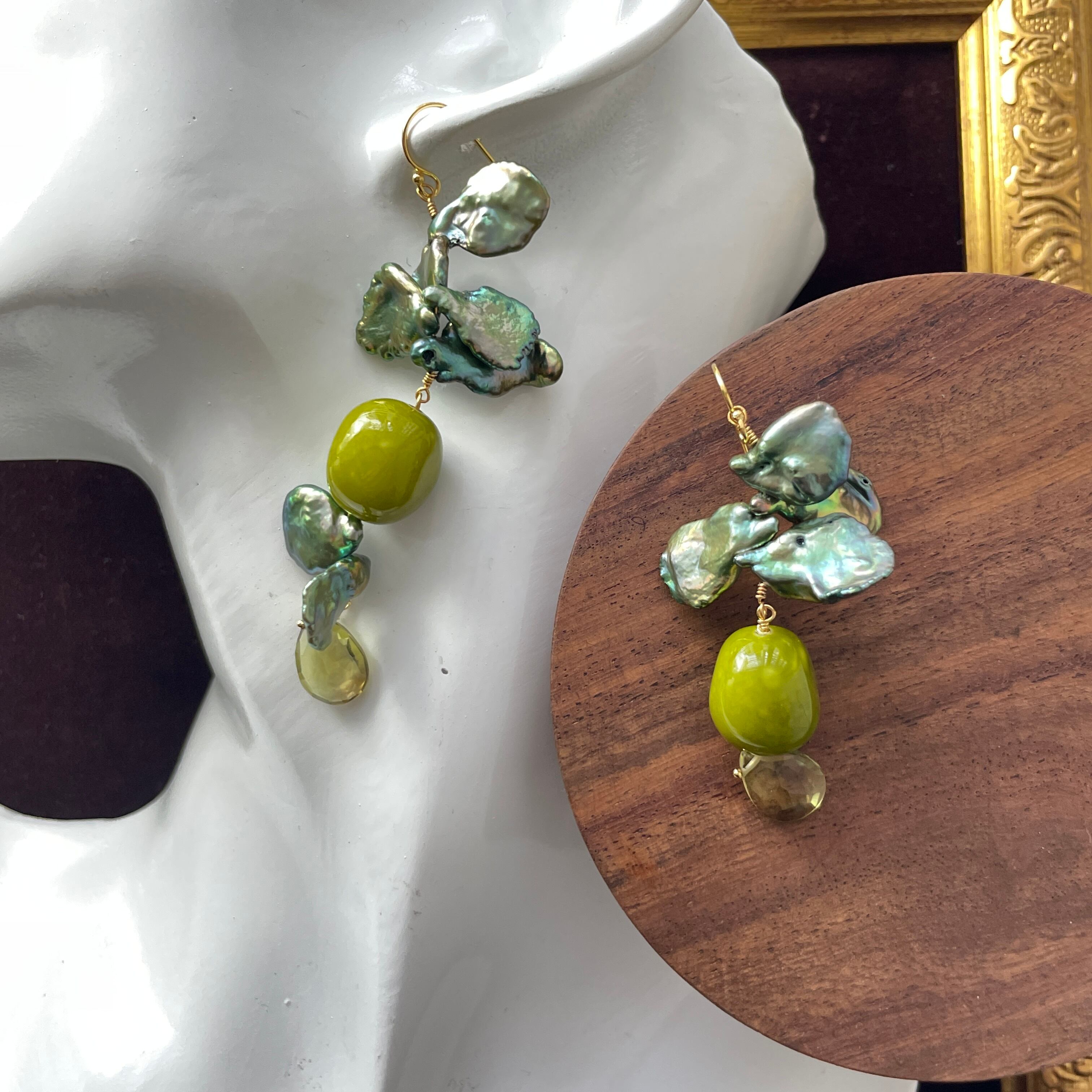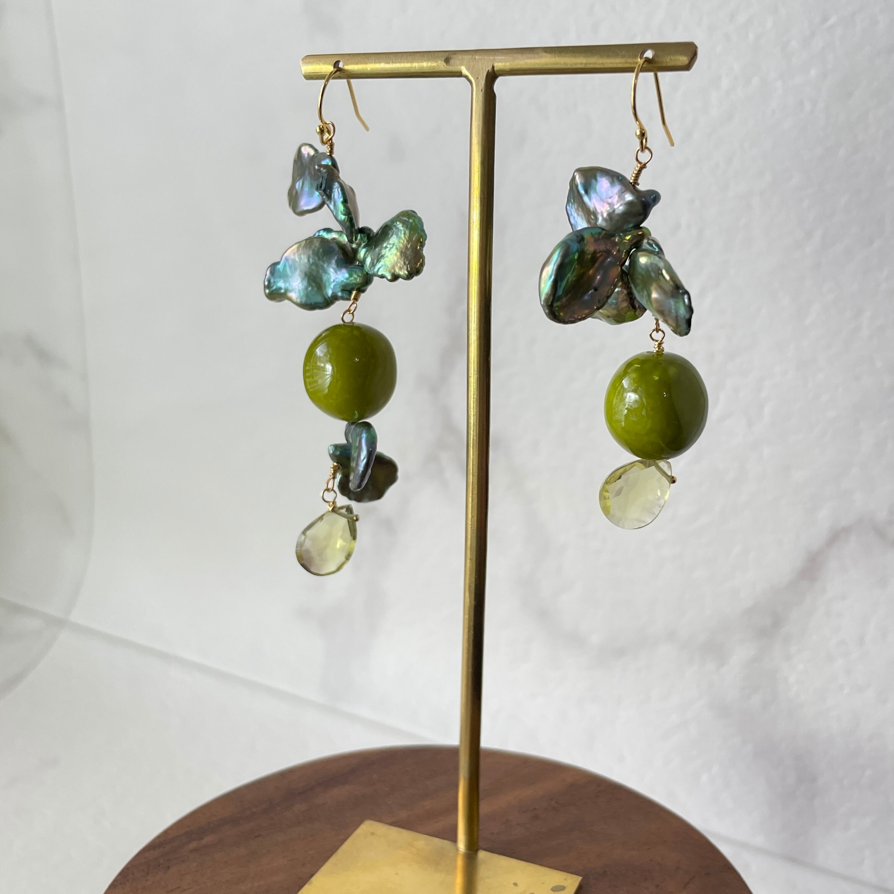存在感と華やかさを兼ね備えたデザインピアス。アシンメトリーなデザインで、あなただけのオリジナルアクセサリーです。1点物なので、世界でたった1つの特別感を味わえます。