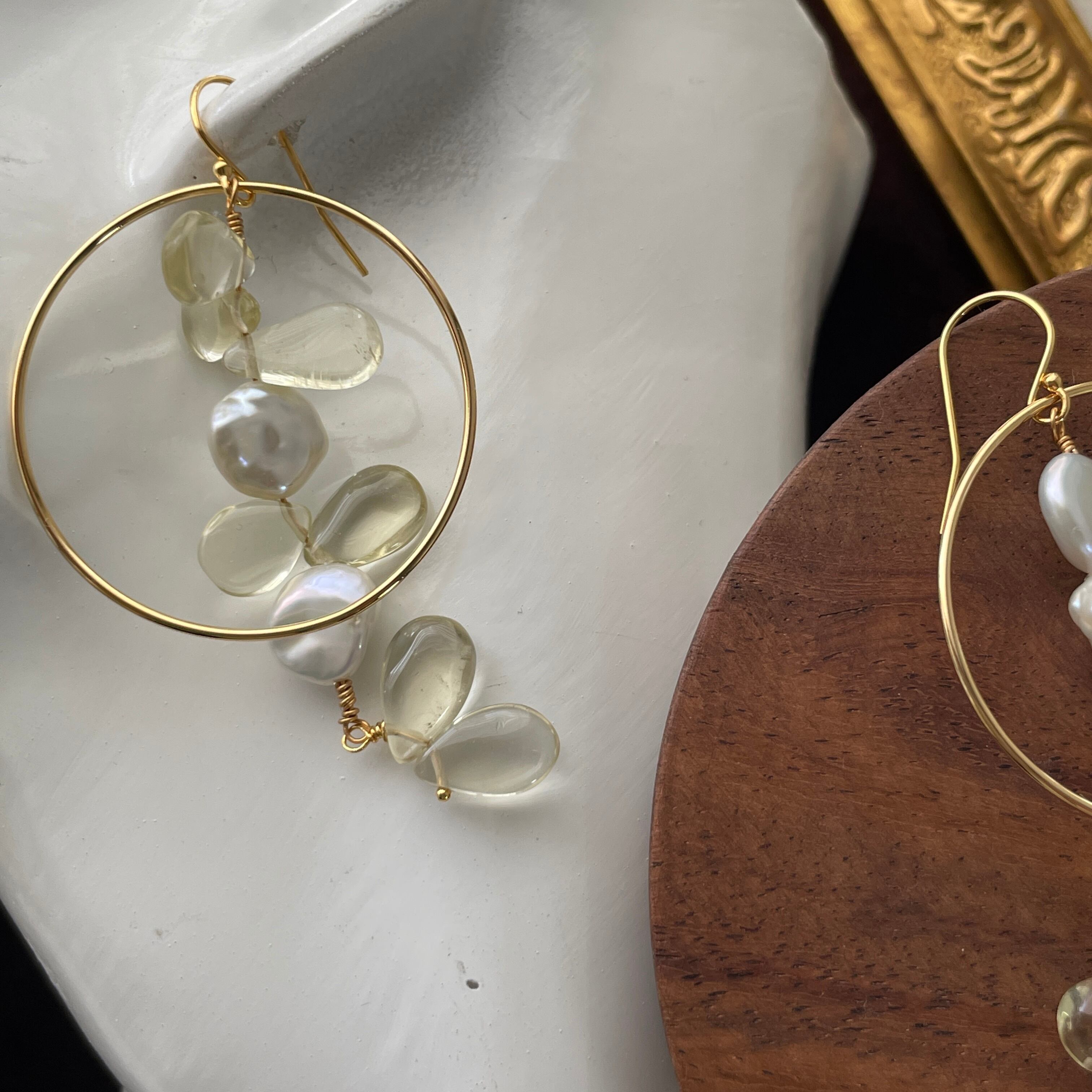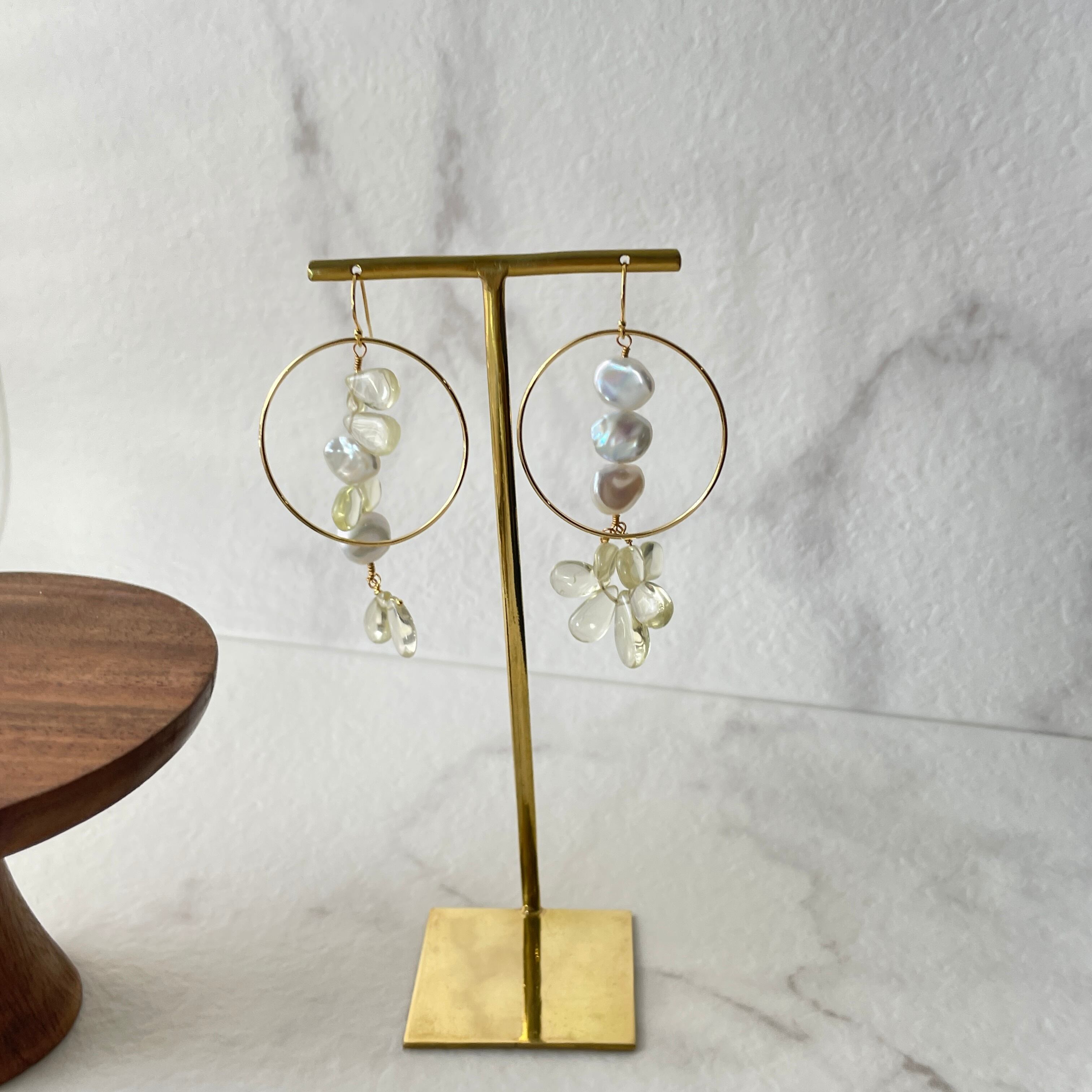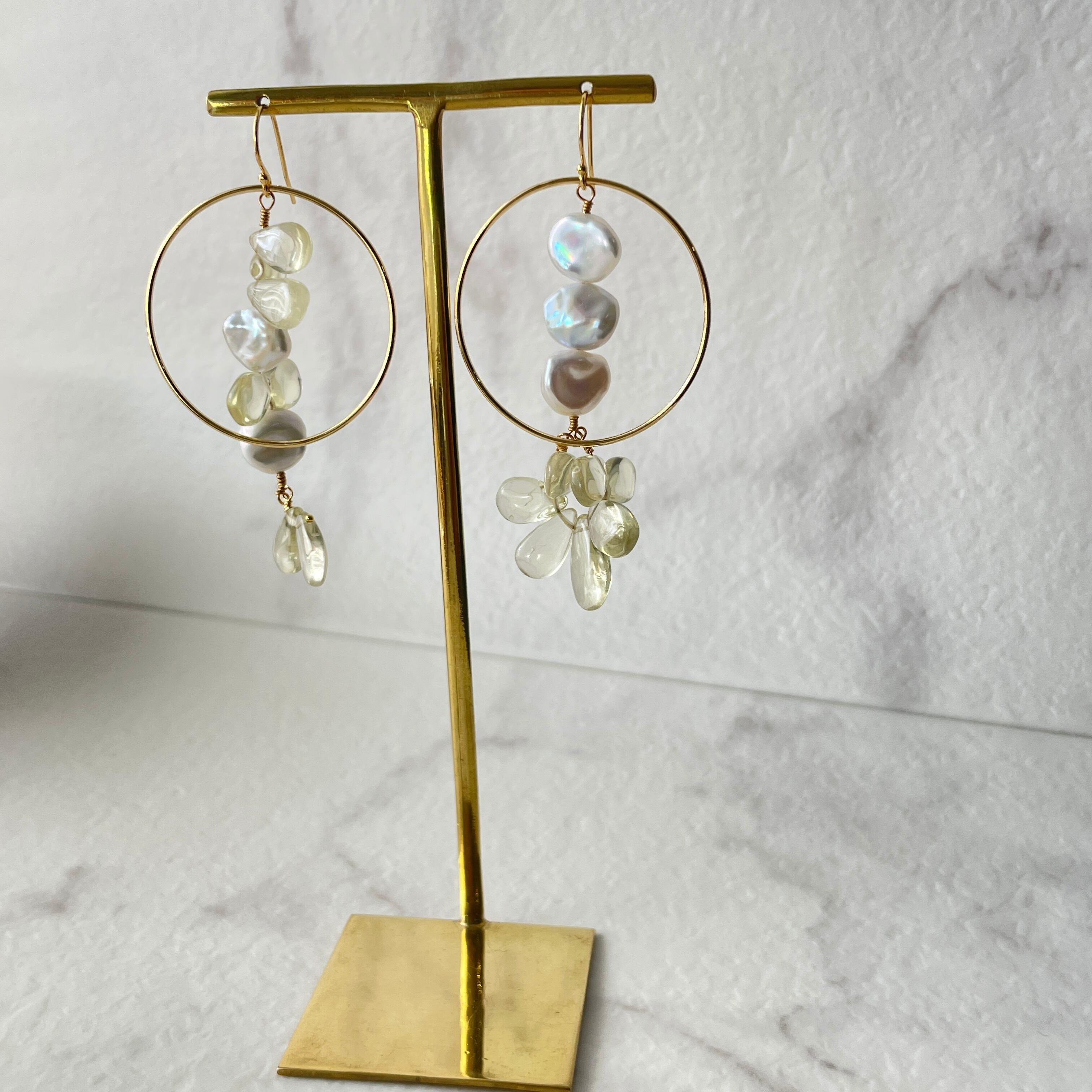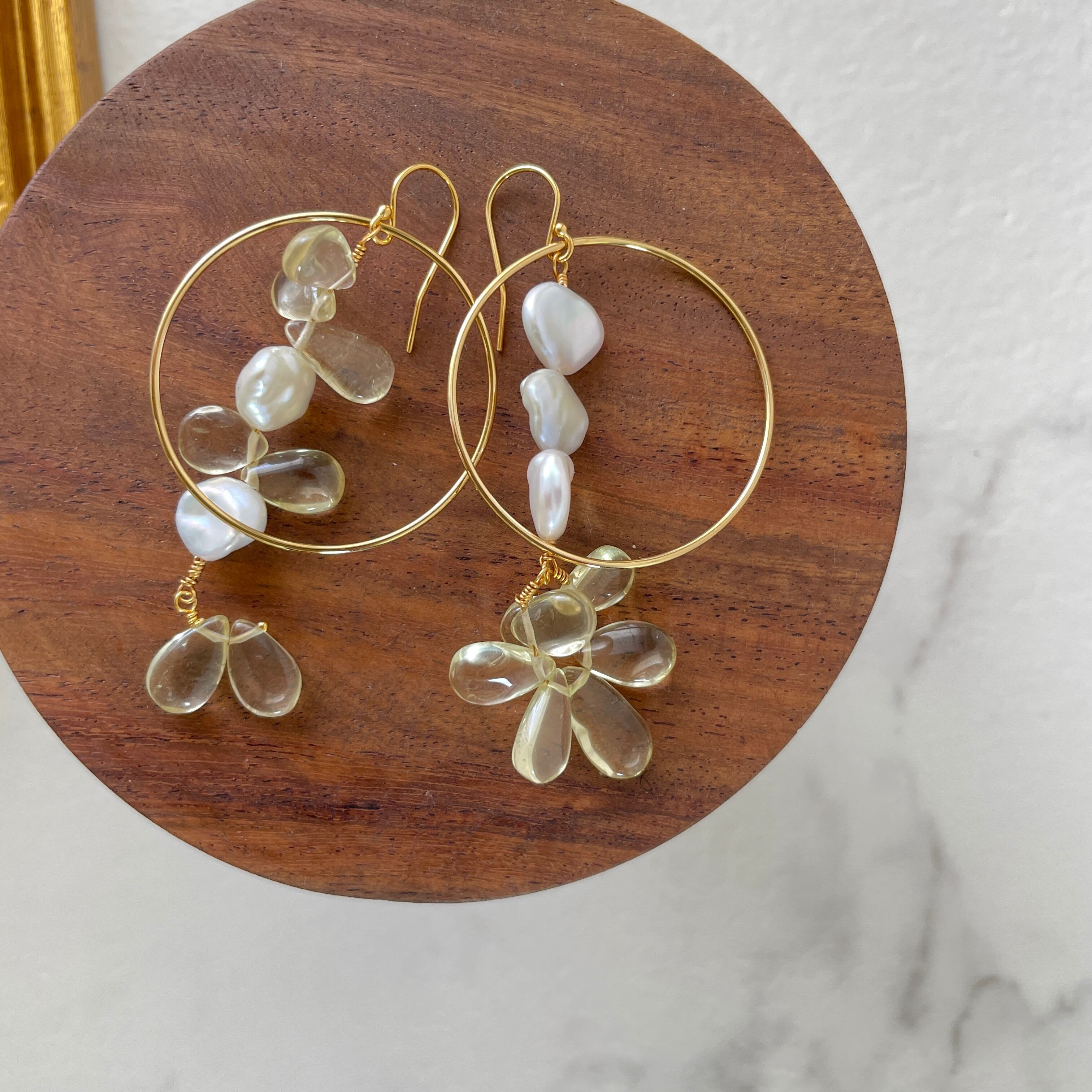 サークルパーツ使いがおしゃれでレモンクォーツと淡水パールの組み合わせが爽やかさを演出します。