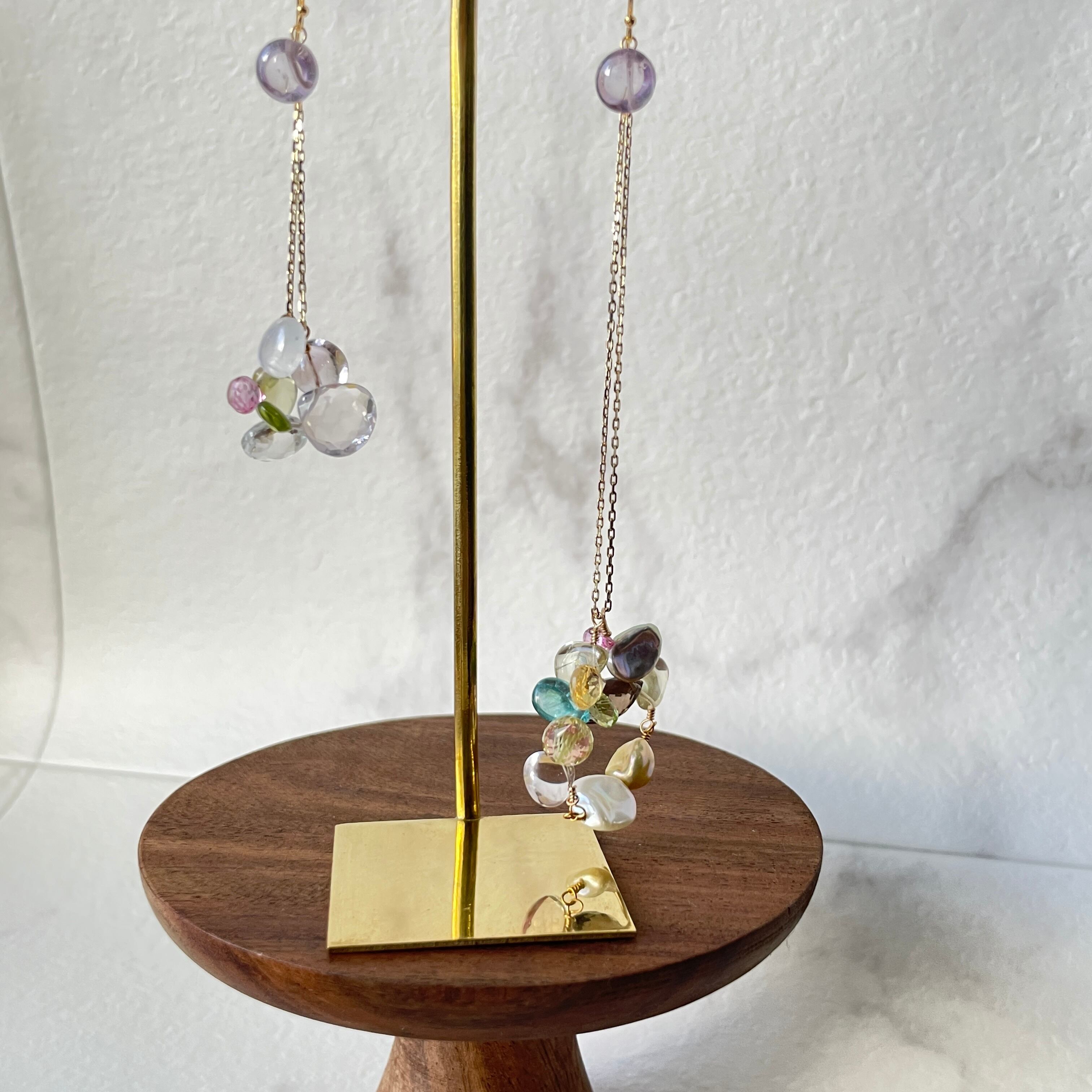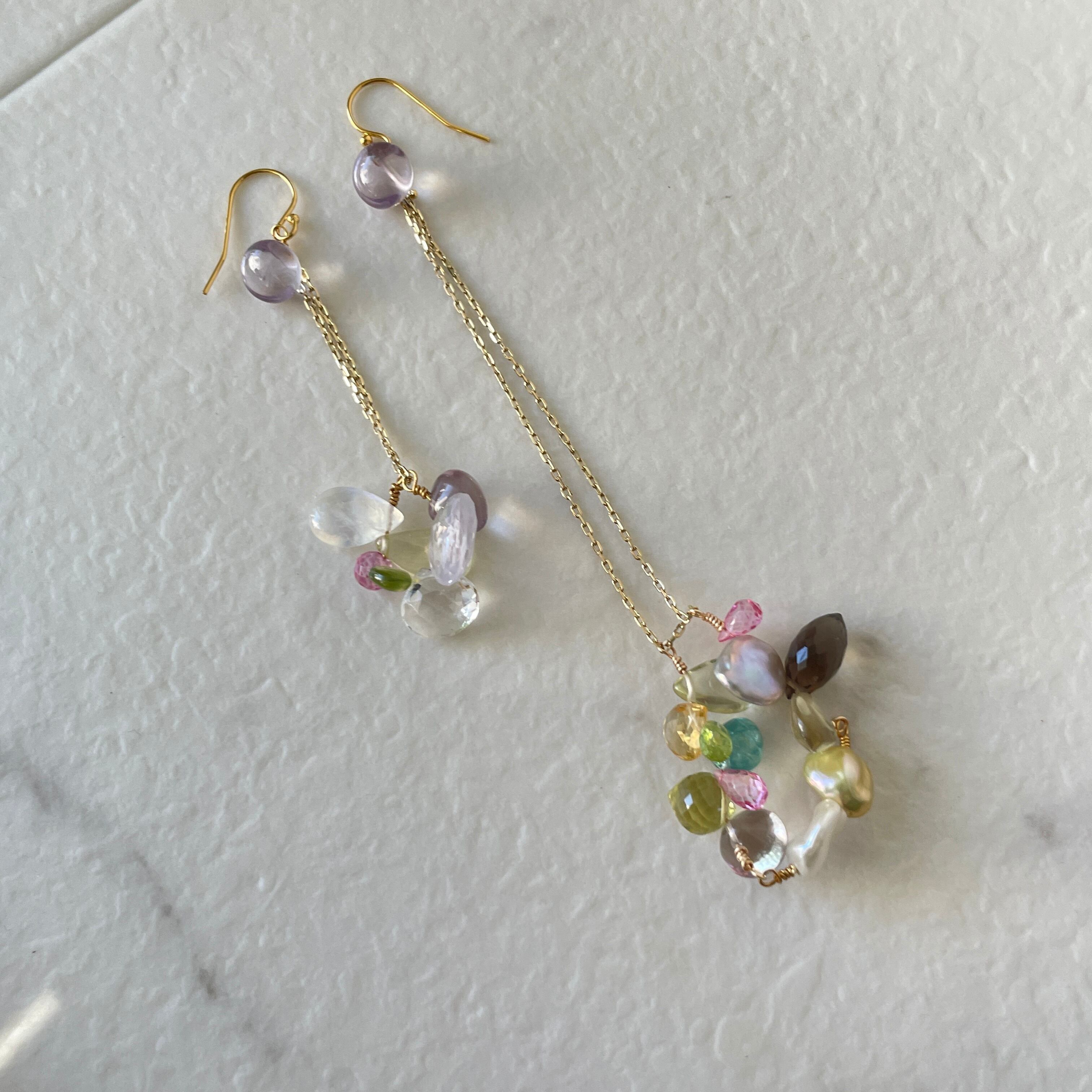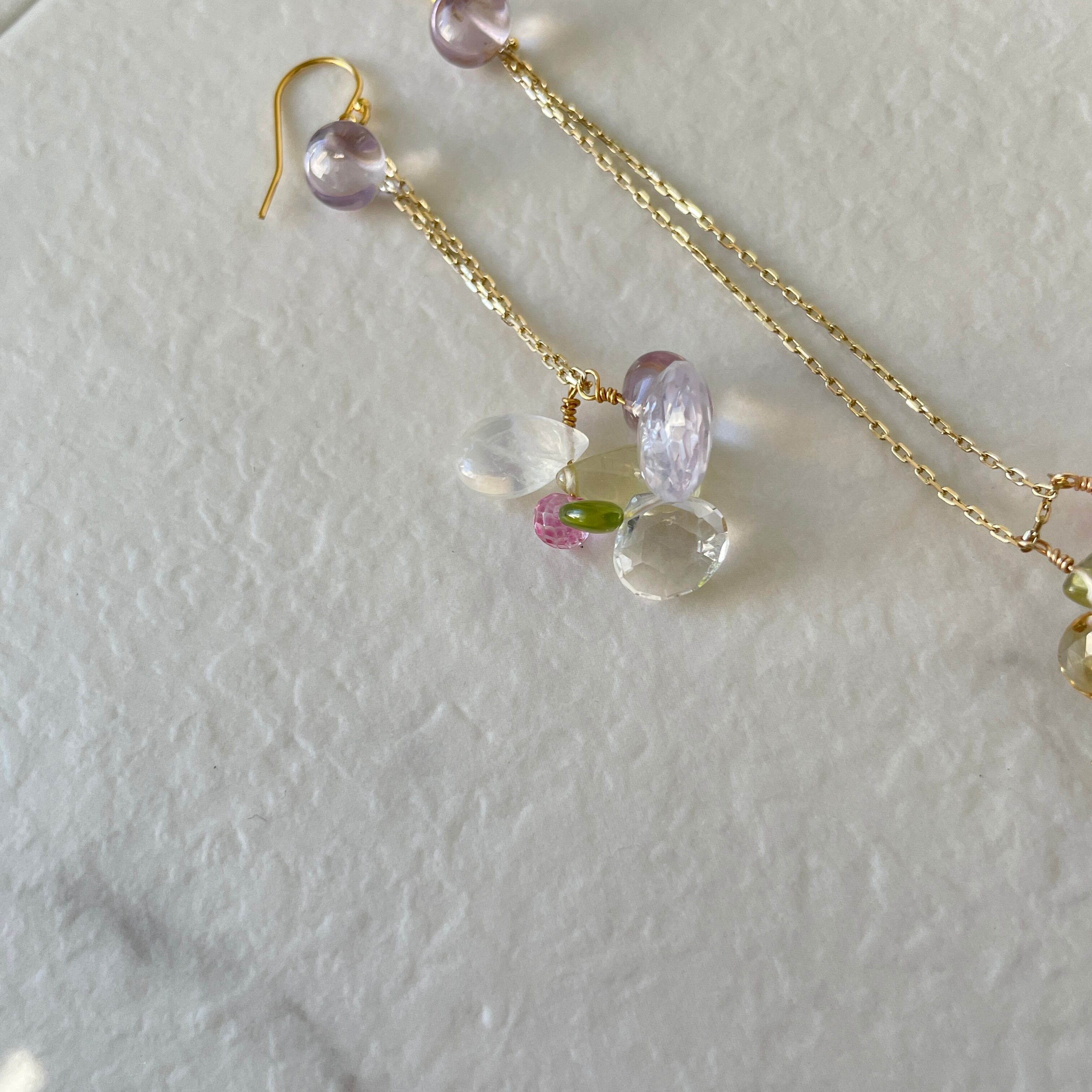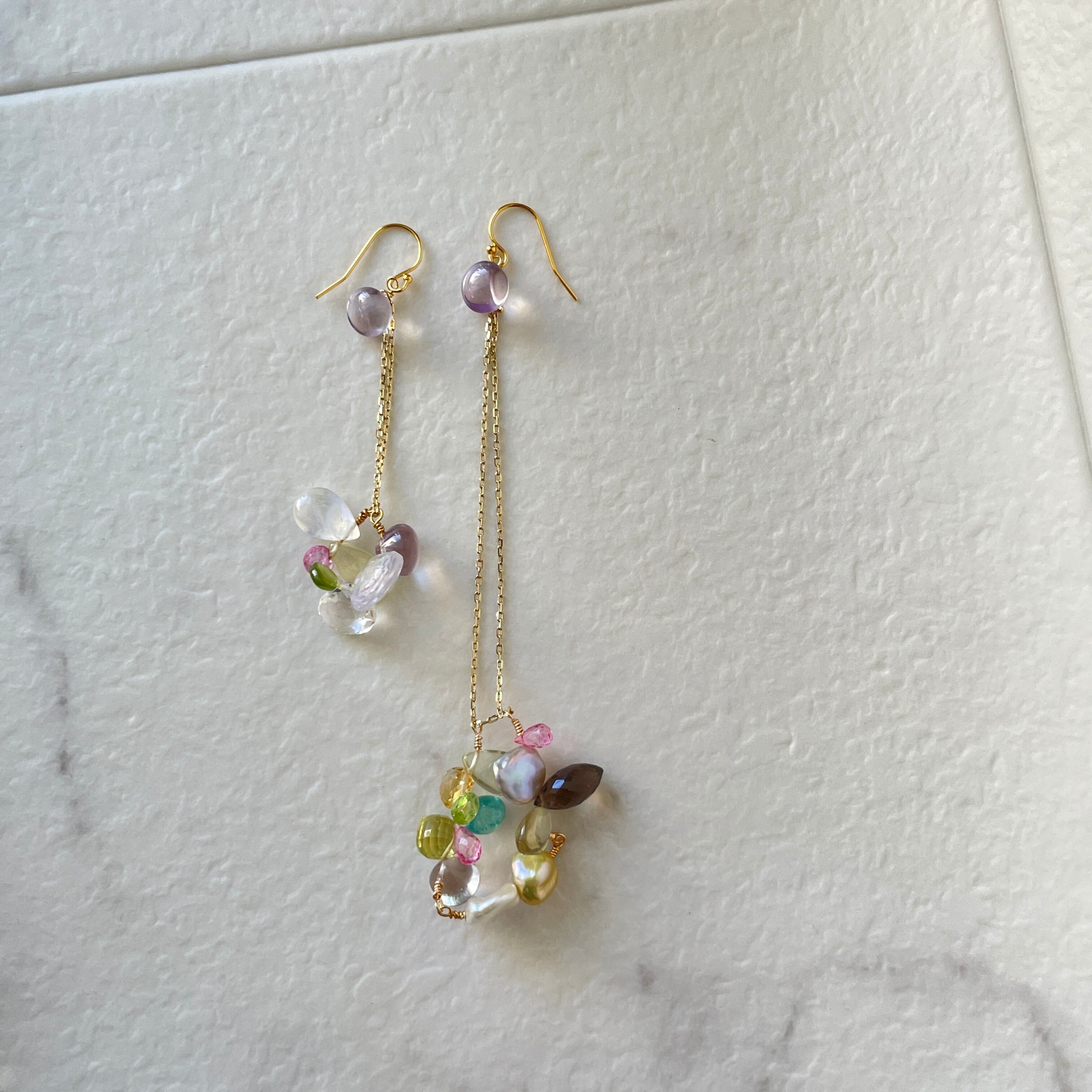 手作りの1点物デザインピアスです。複数のカラフルなストーンを使用しており、どの角度から見ても美しい輝きを放ちます。