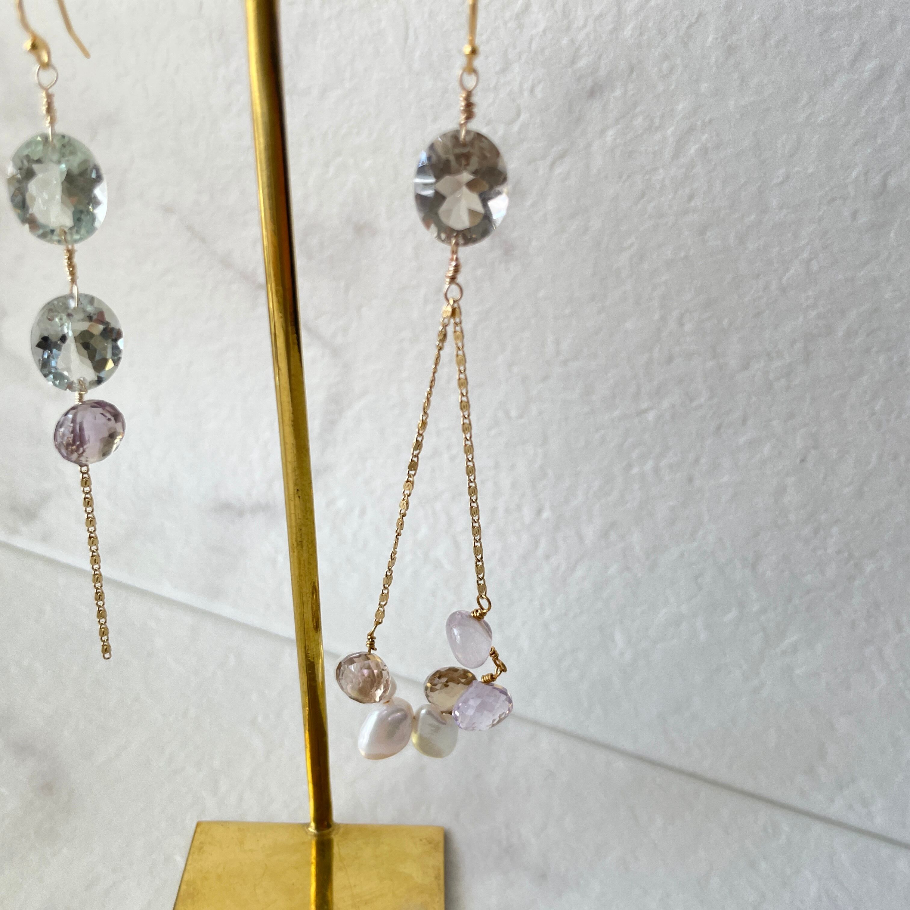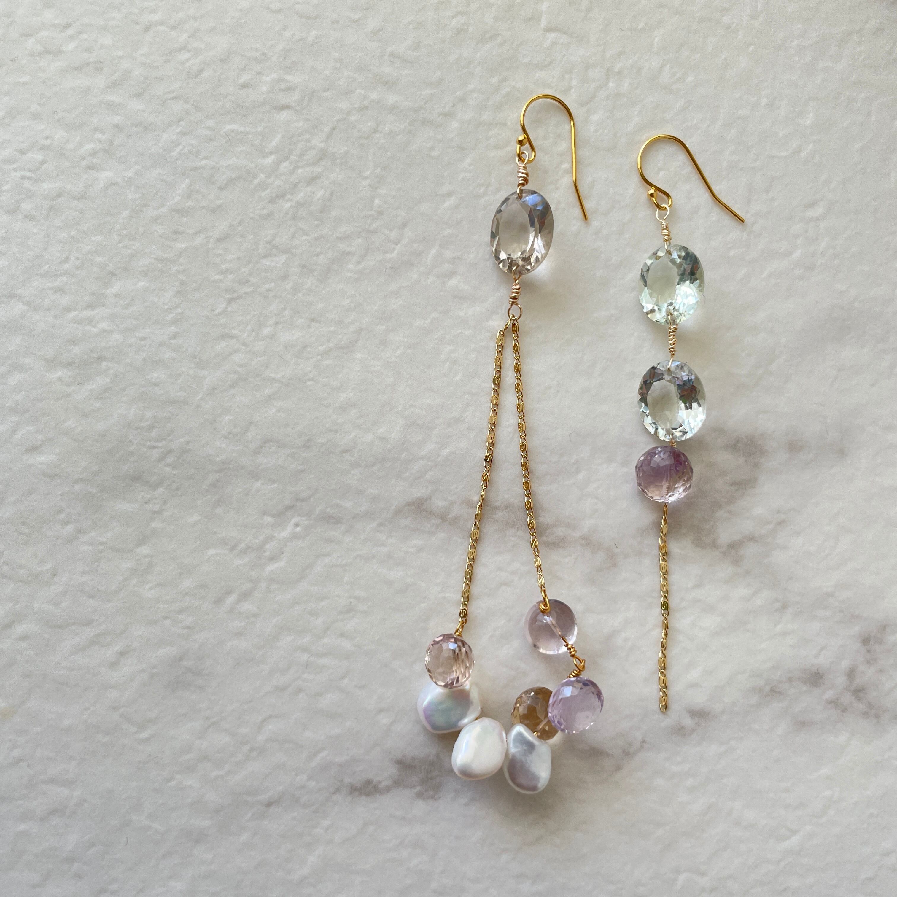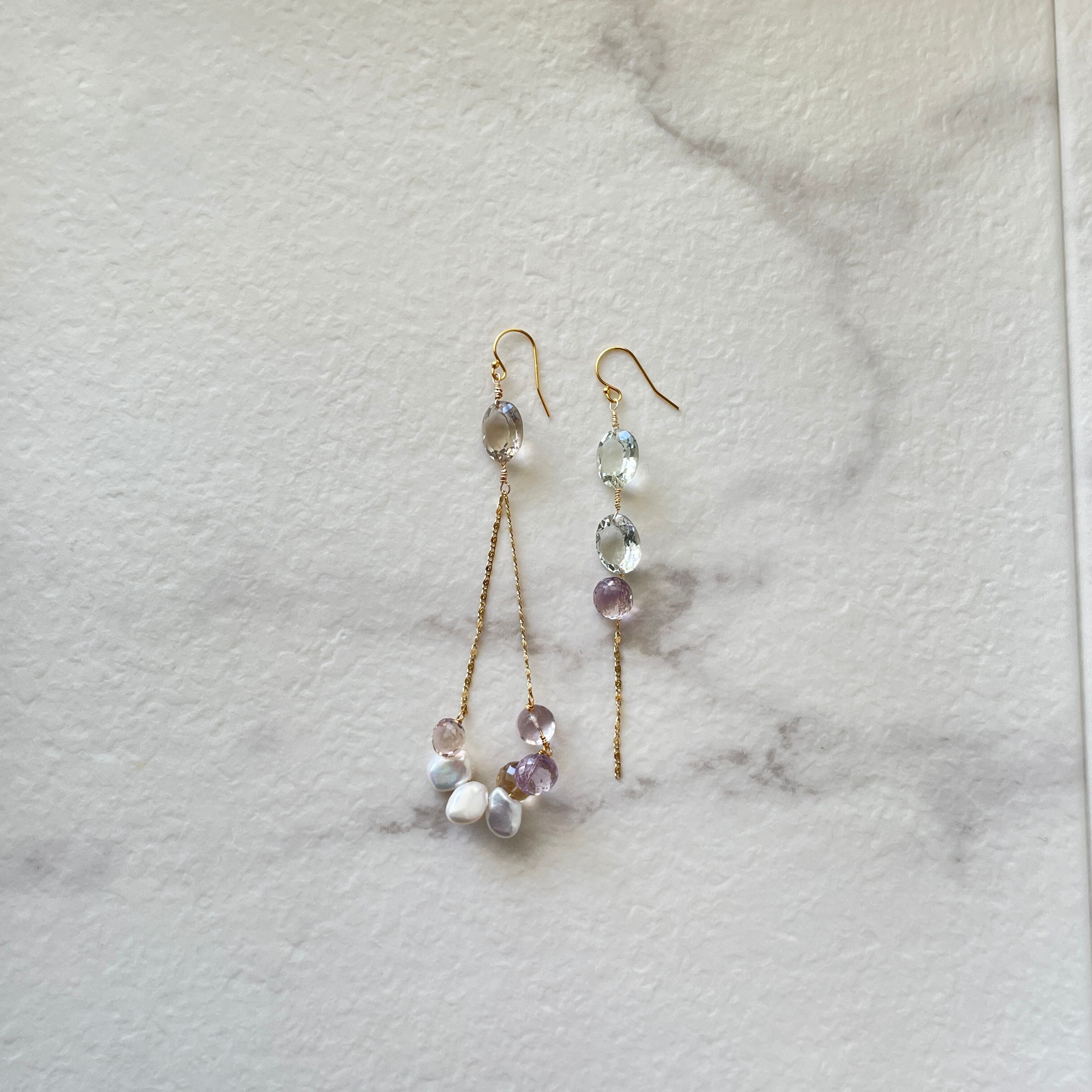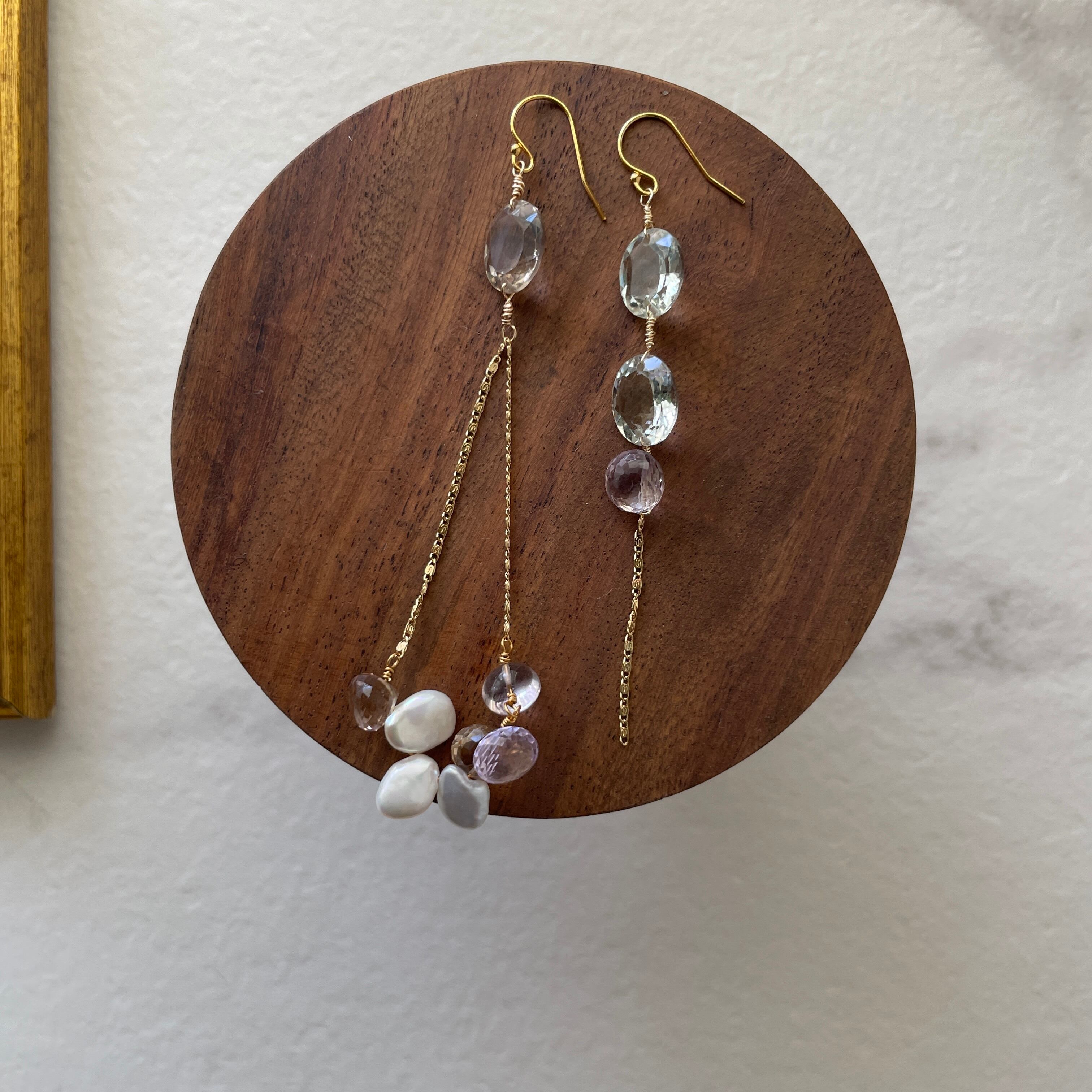 パールと天然石を使用することで、このデザインピアスはまさに一点物。敢えて同じものを作らず、それぞれの個性が生かされたアクセサリーです。デザインにはこだわり抜き、繊細な手仕事で丁寧に作られています。