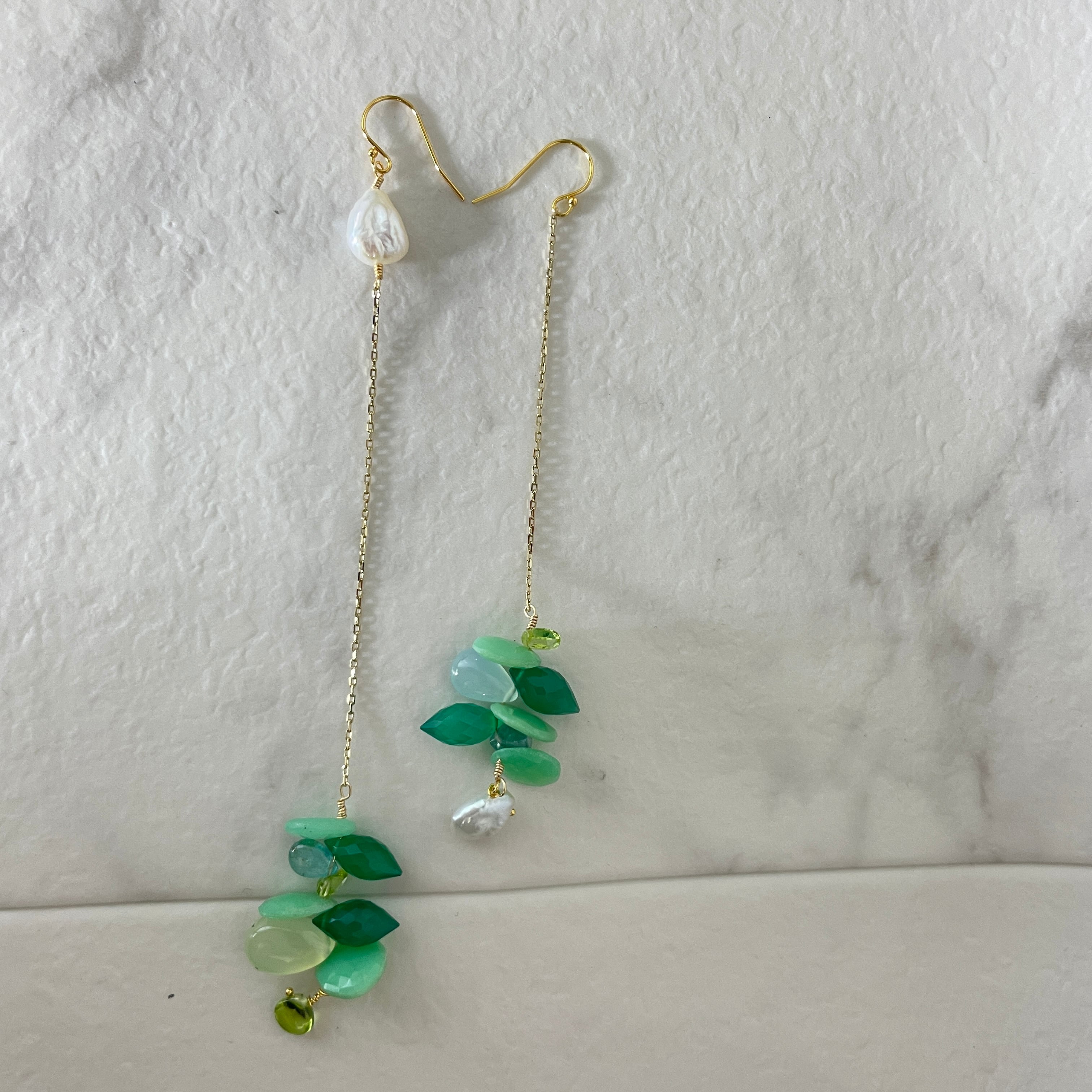 自然の息吹きを感じるグリーンカラーのデザインピアス。1点物のオリジナルデザインで、他にはない特別な存在感を放ちます。
