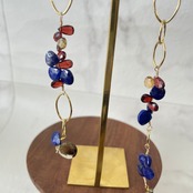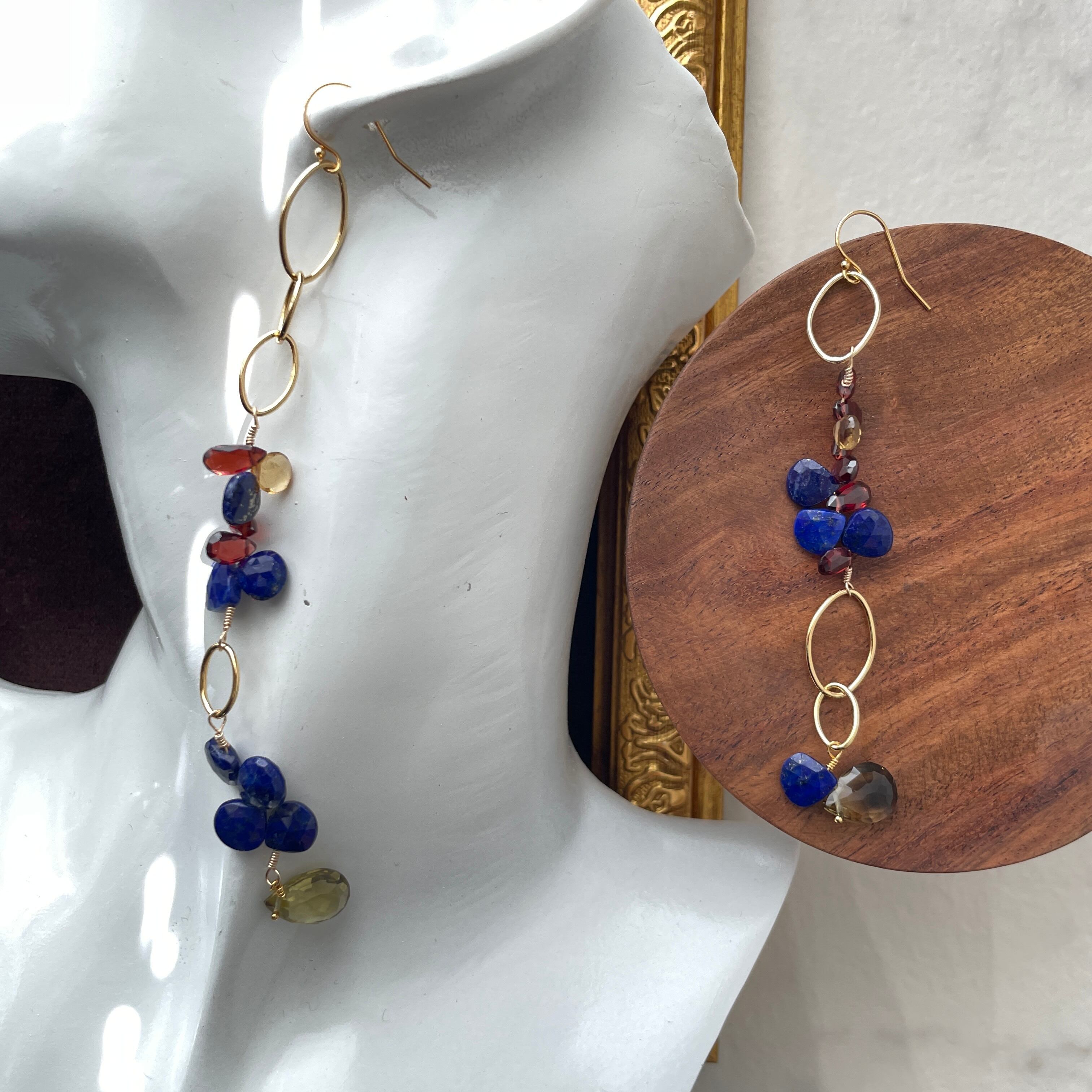 洗練されたデザインピアスをお探しの方におすすめです。一点物のデザインピアスは、その美しさで必ず目を引きます。このピアスには、ラピスラズリ、ガーネット、シトリン、スモーキーレモンクォーツの美しい宝石が使用されており、華やかさとエレガントさを兼ね備えています。お好みのスタイルに合わせてお楽しみいただけます。
