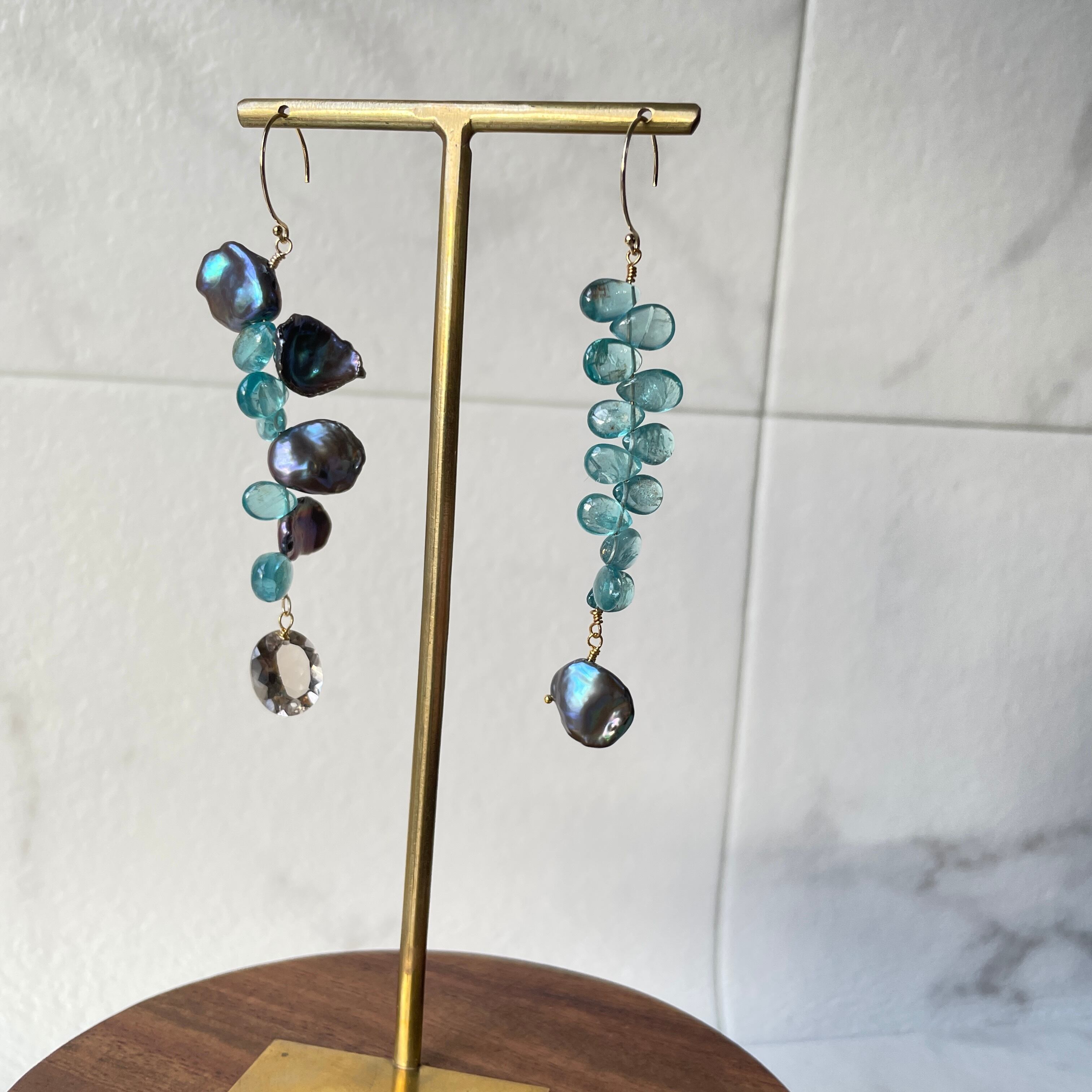 照りのある淡水パールと美しいアパタイトの輝きが魅力のデザインピアス。揺れるスモーキークォーツがキラキラしています。