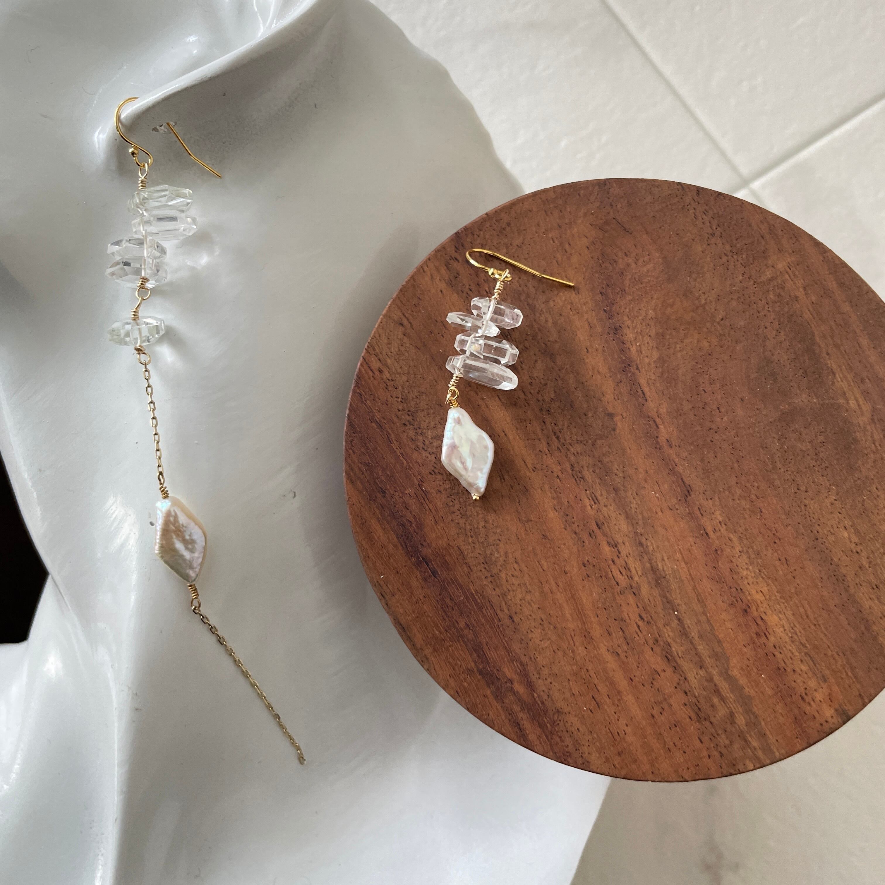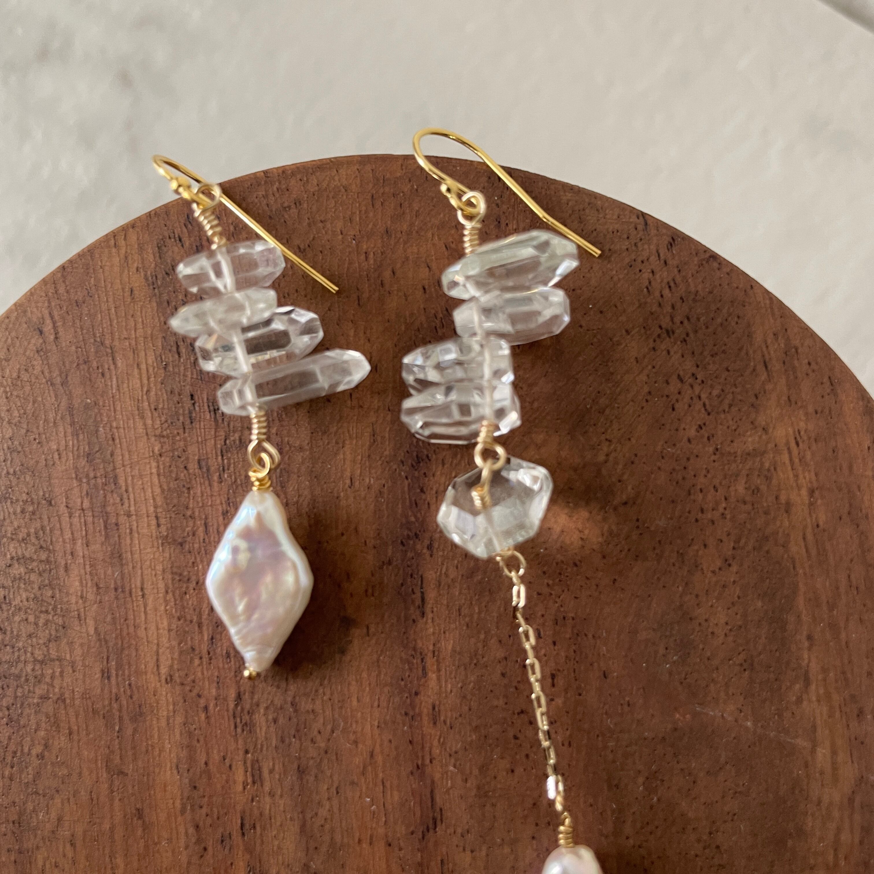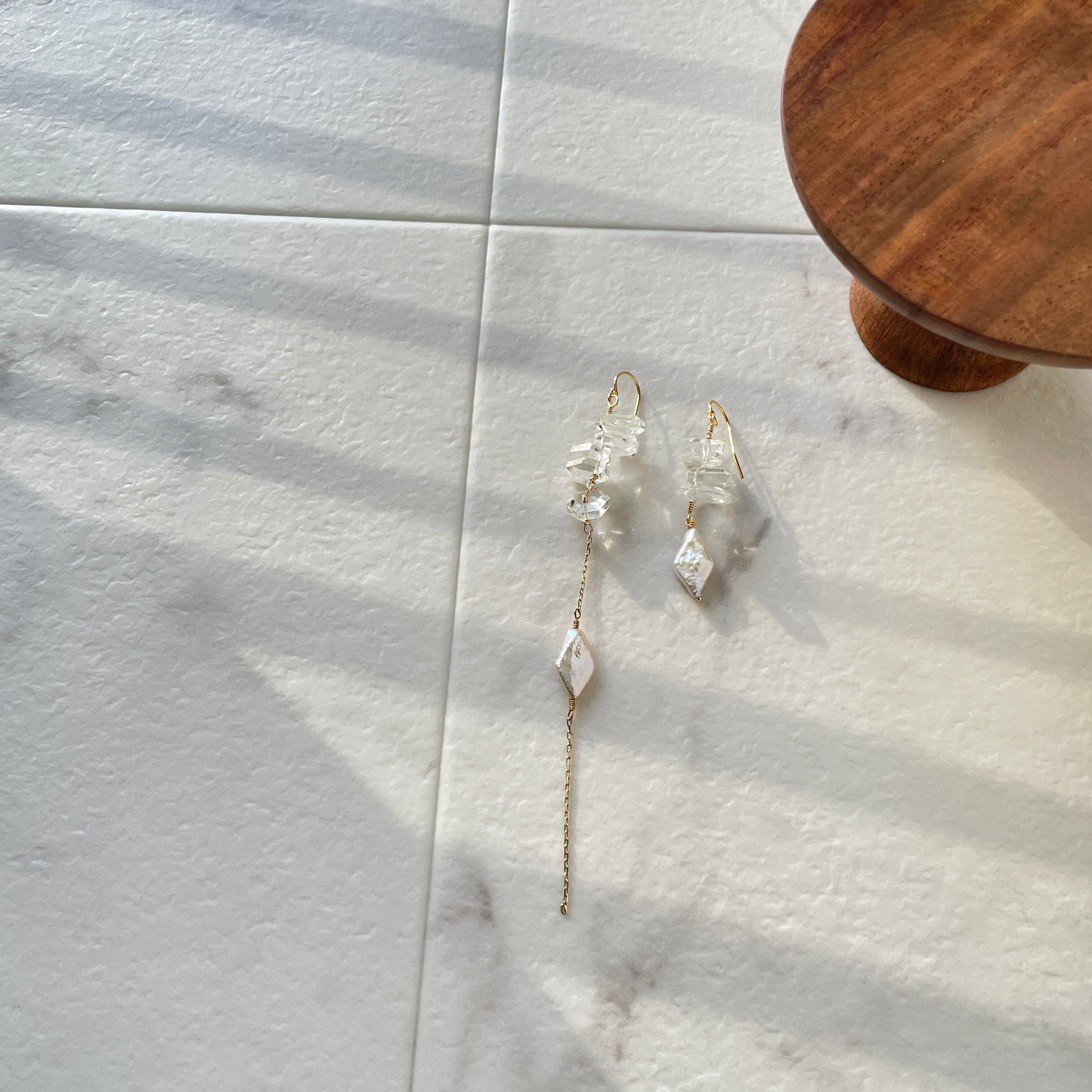 水晶と淡水パールを使用した、個性的なデザインピアスです。どの角度から見ても美しい輝きがあり、一点物のため他の人と巡り合うことがない特別な存在感があります。