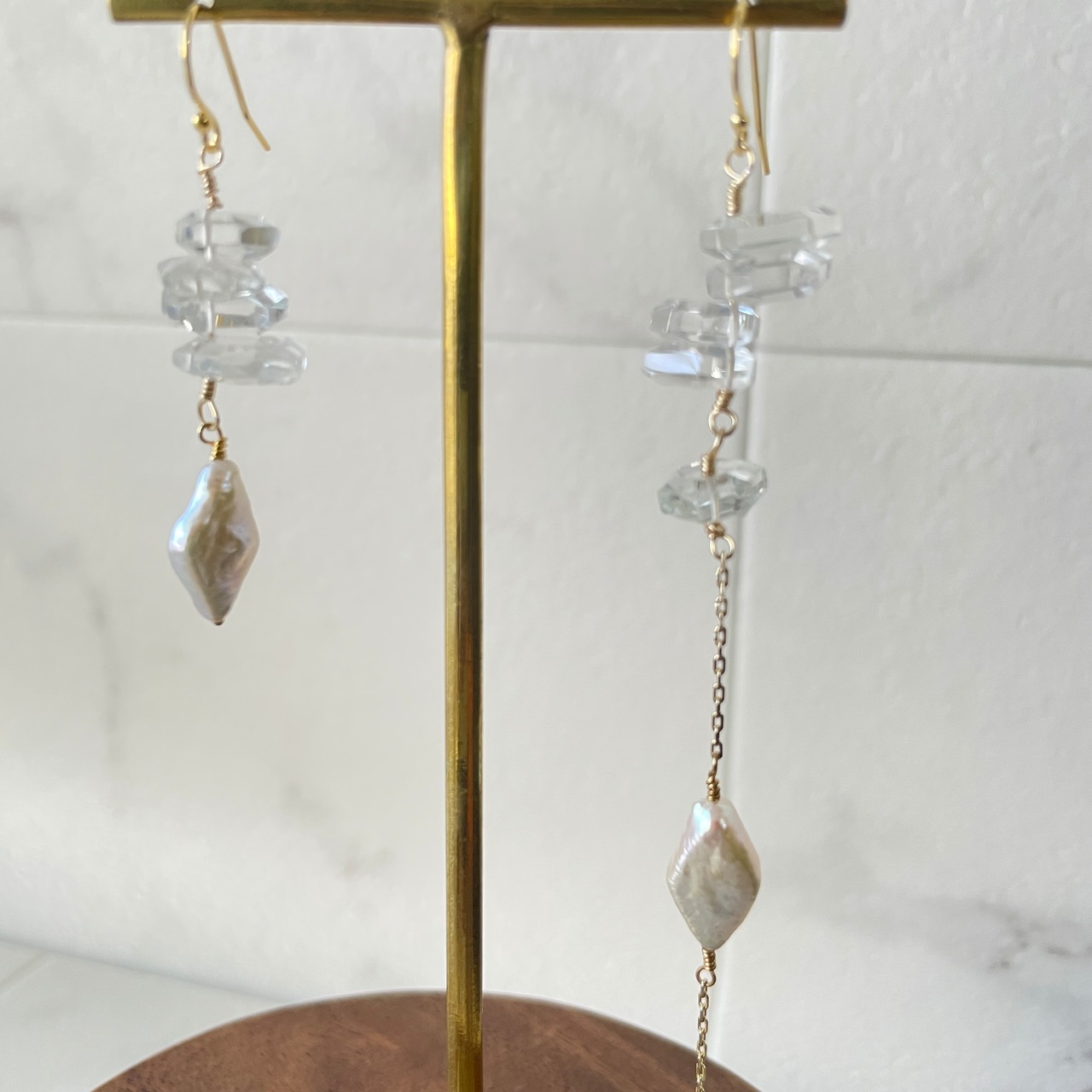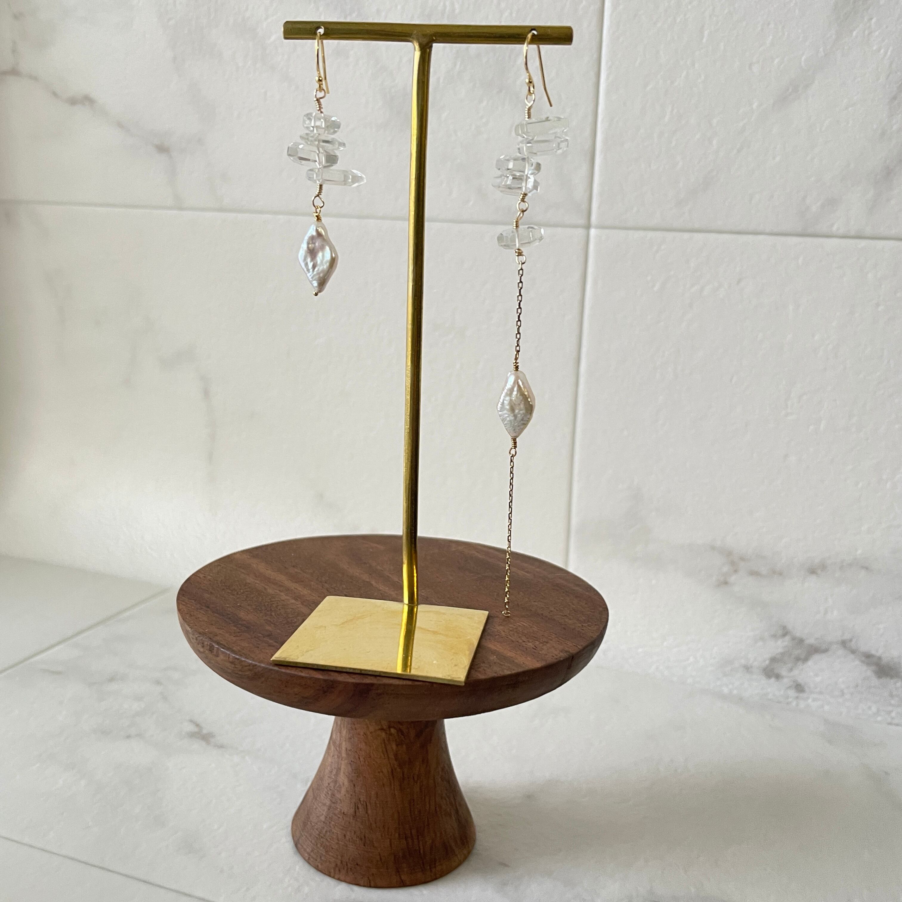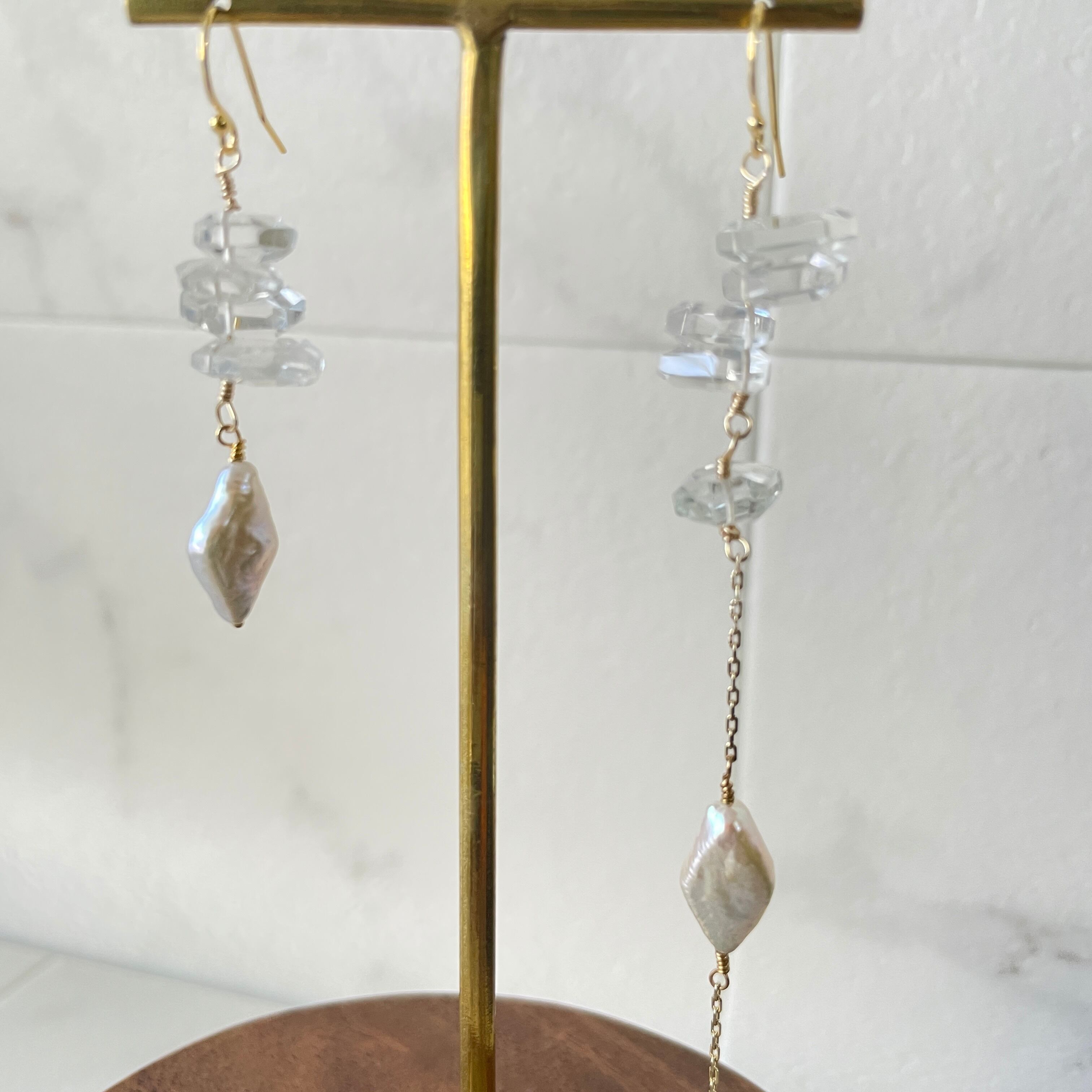 水晶と淡水パールを使用した、個性的なデザインピアスです。どの角度から見ても美しい輝きがあり、一点物のため他の人と巡り合うことがない特別な存在感があります。