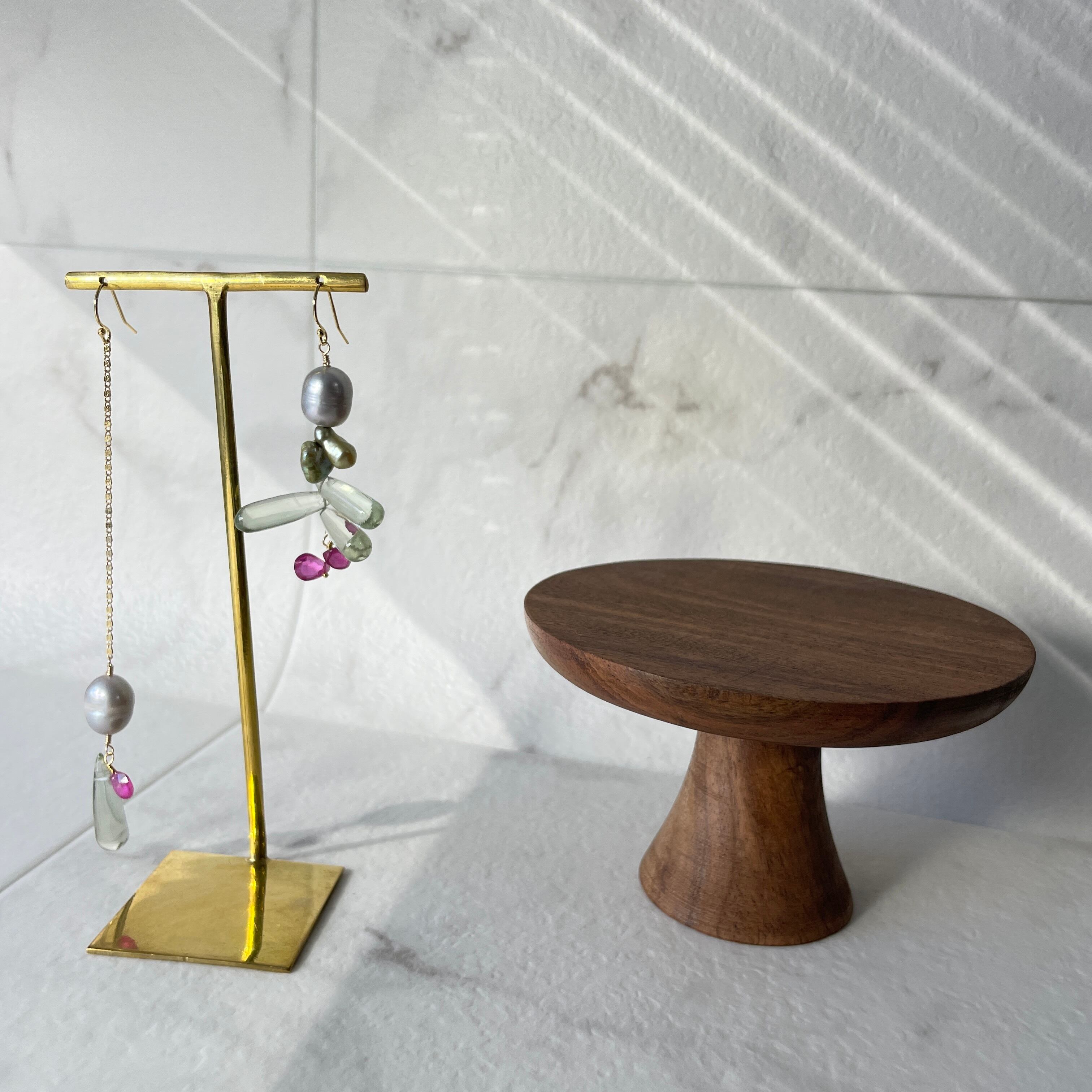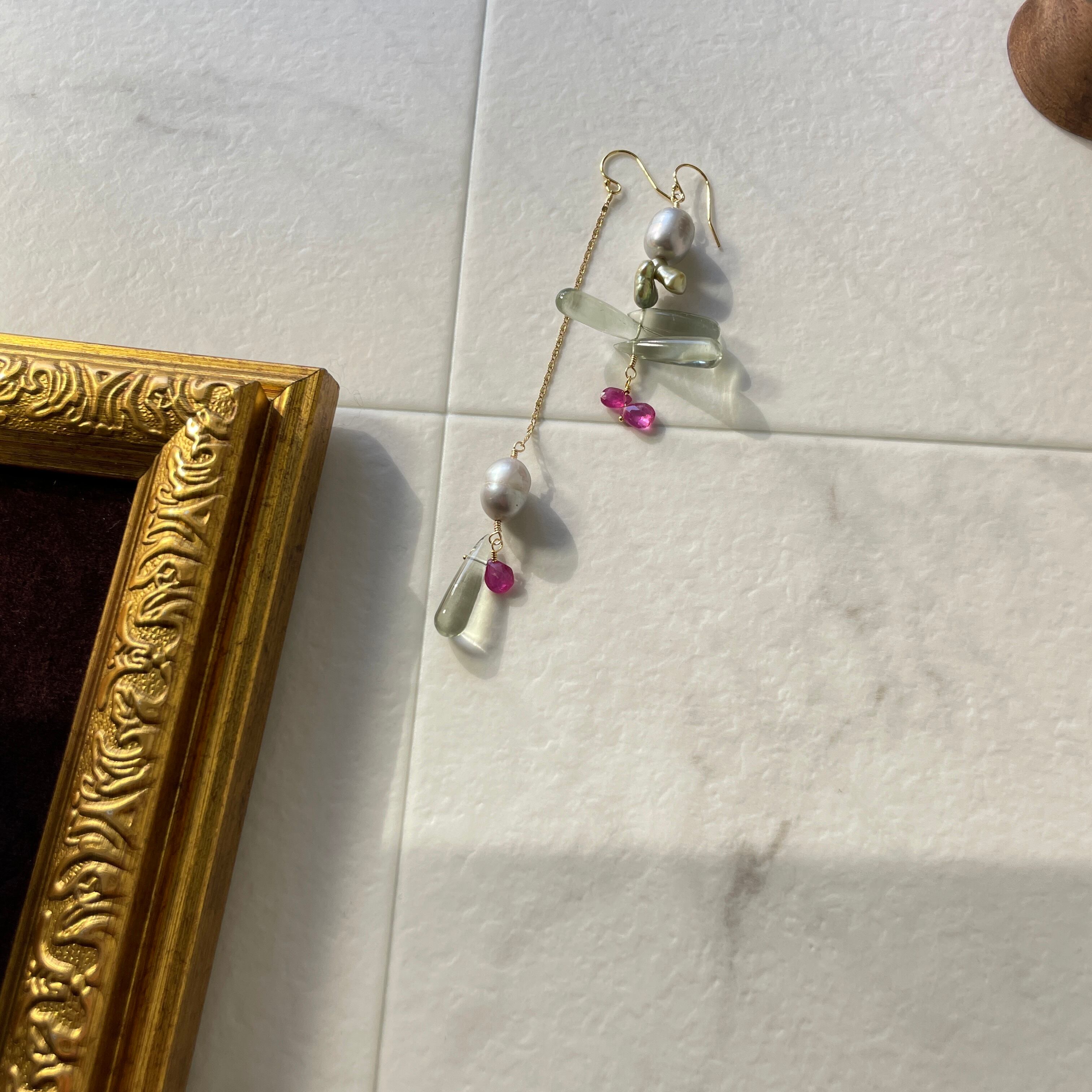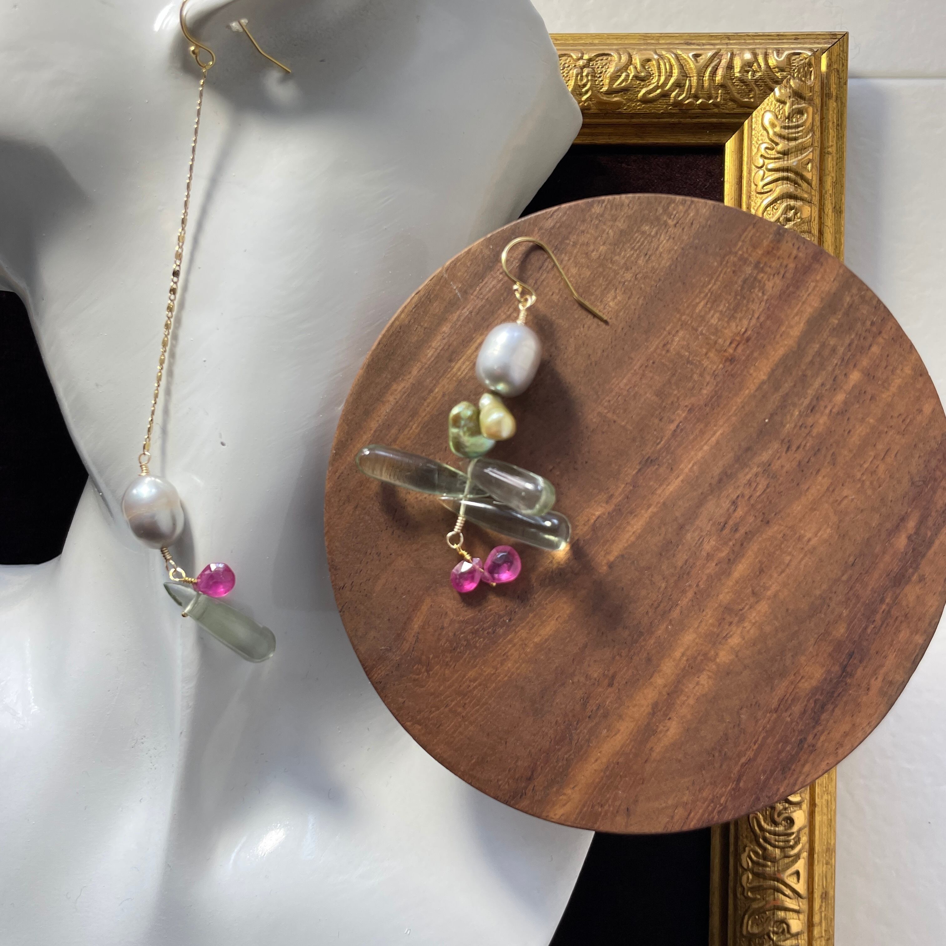 煌めくデザインピアスの世界へようこそ。ルビー、グリーンクォーツ、淡水パールを贅沢に使用した、オリジナルデザインの一点物です。その輝きはまるで星空のようでありながら、どこか儚げで繊細な美しさがあります。