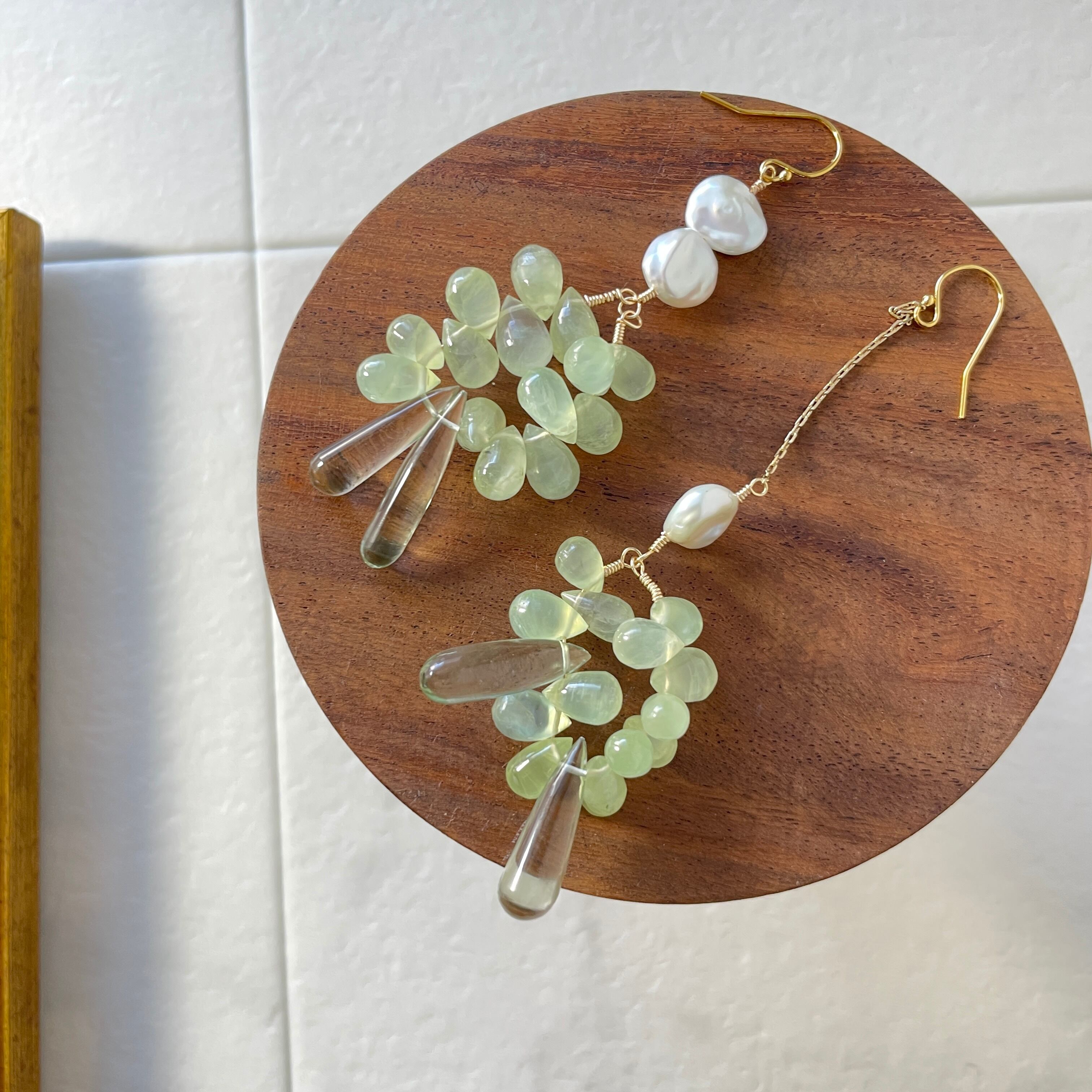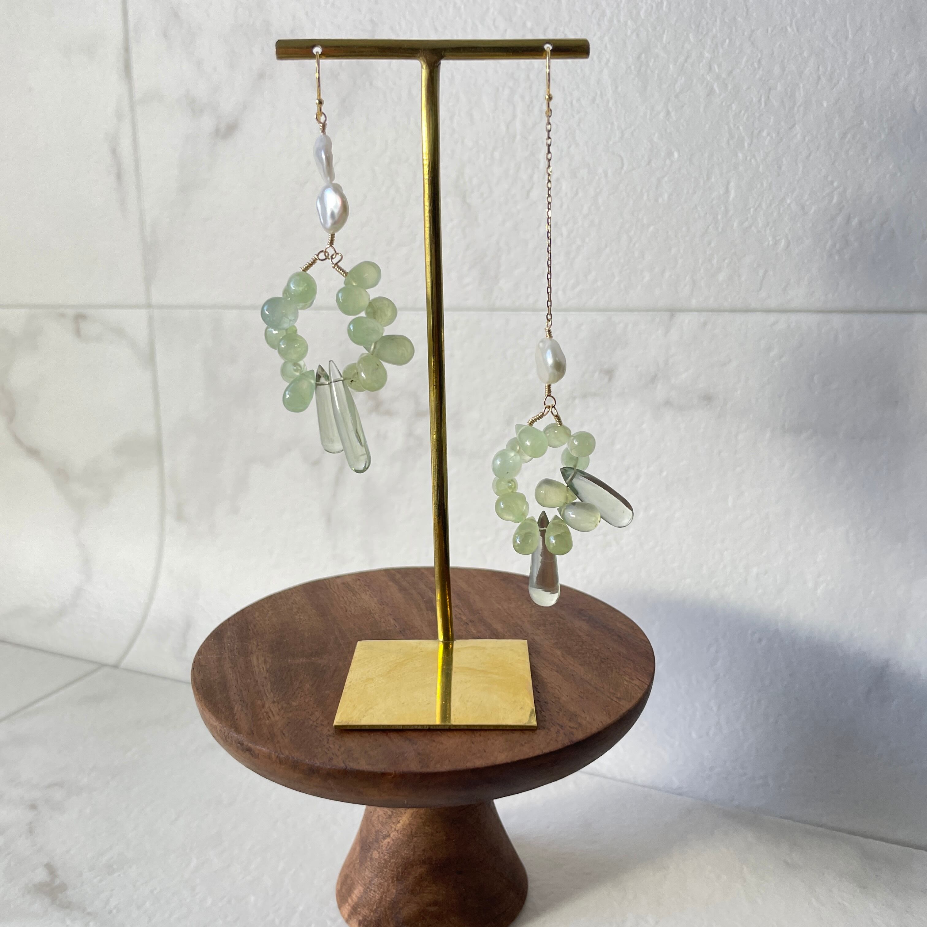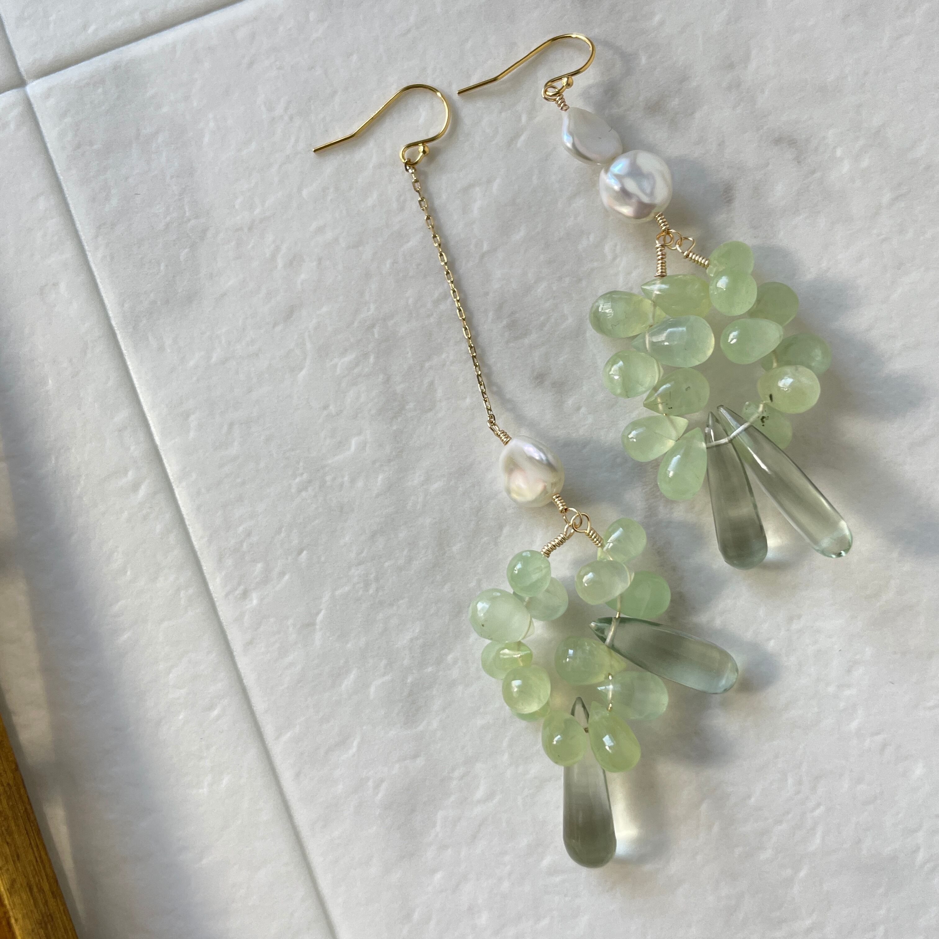 繊細なデザインが魅力のデザインピアス。このピアスは、プレナイトとグリーンクォーツの石を使用し、優しいカラーが特徴です。