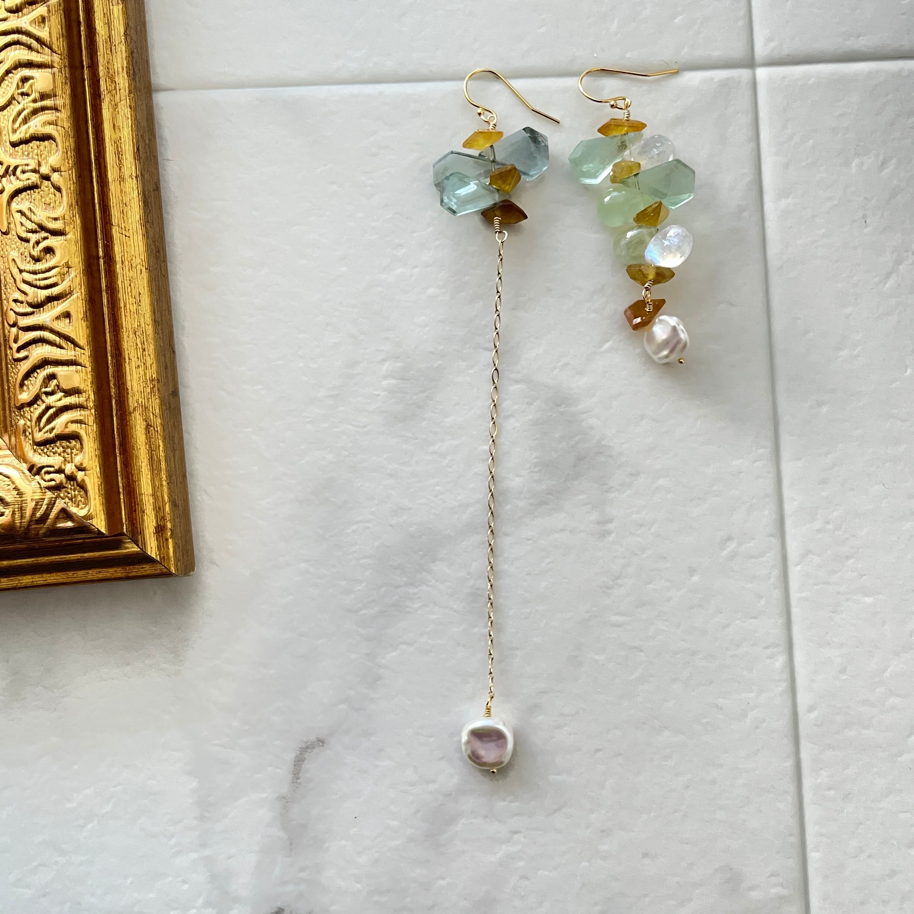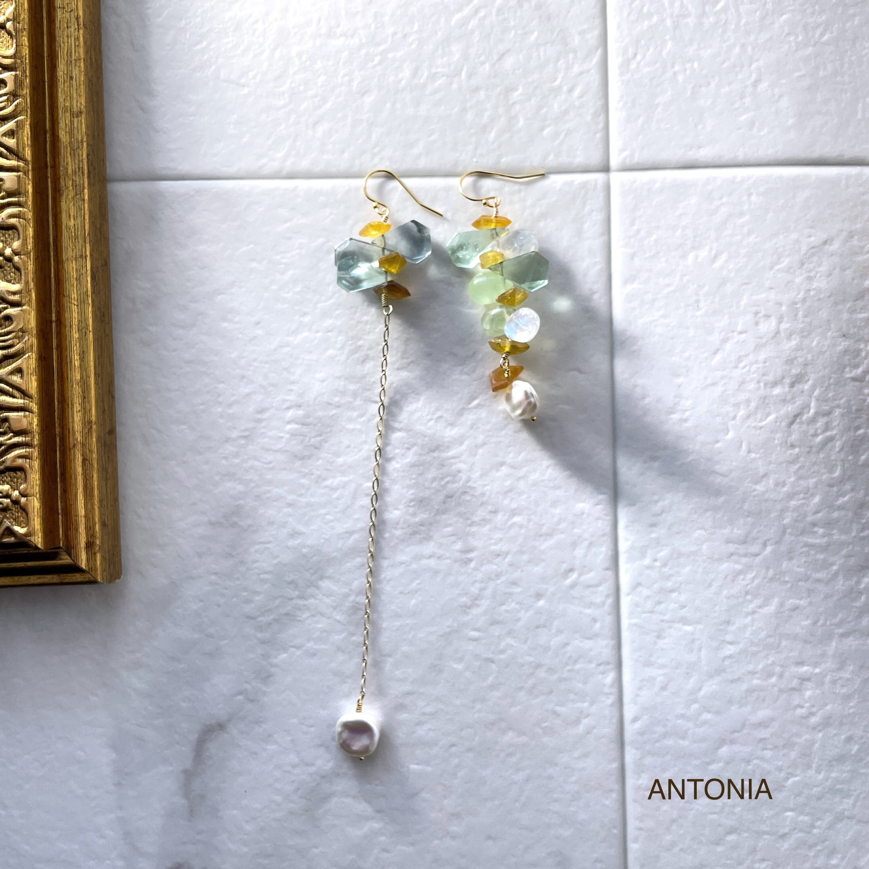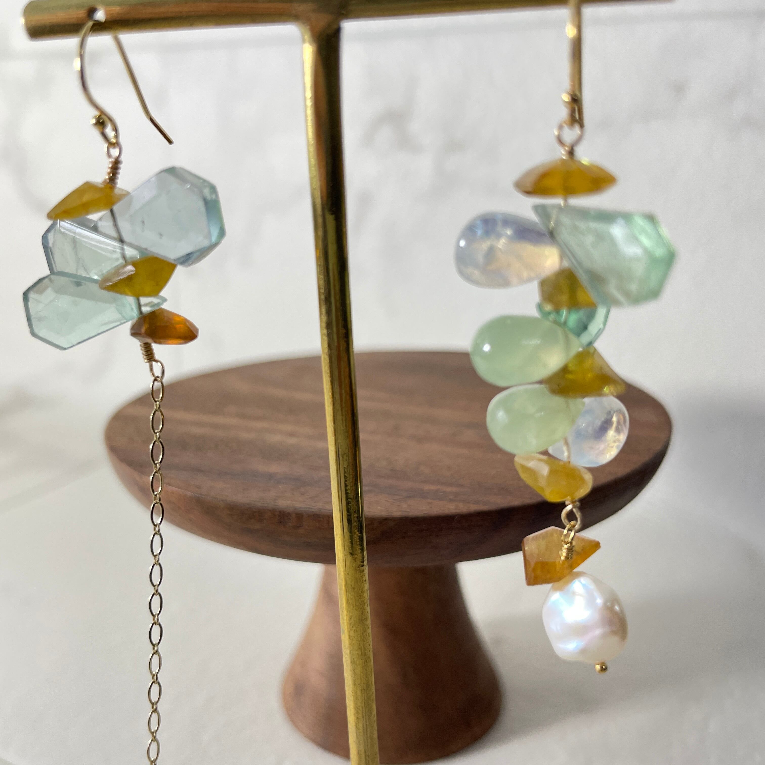 一点物のデザインピアス、繊細なフローライトと天然石が揺れる度に美しい輝きを放ち、周囲を魅了します。