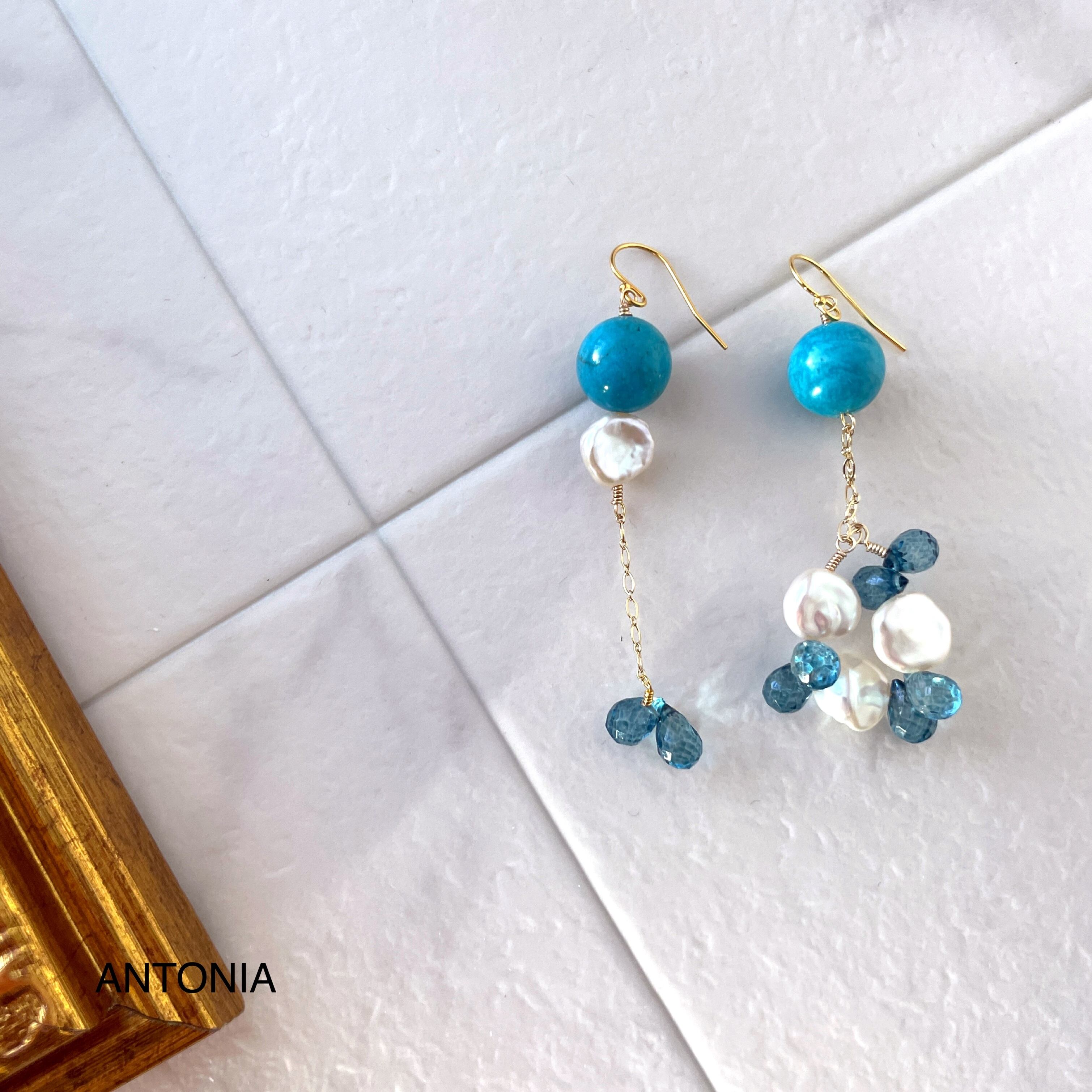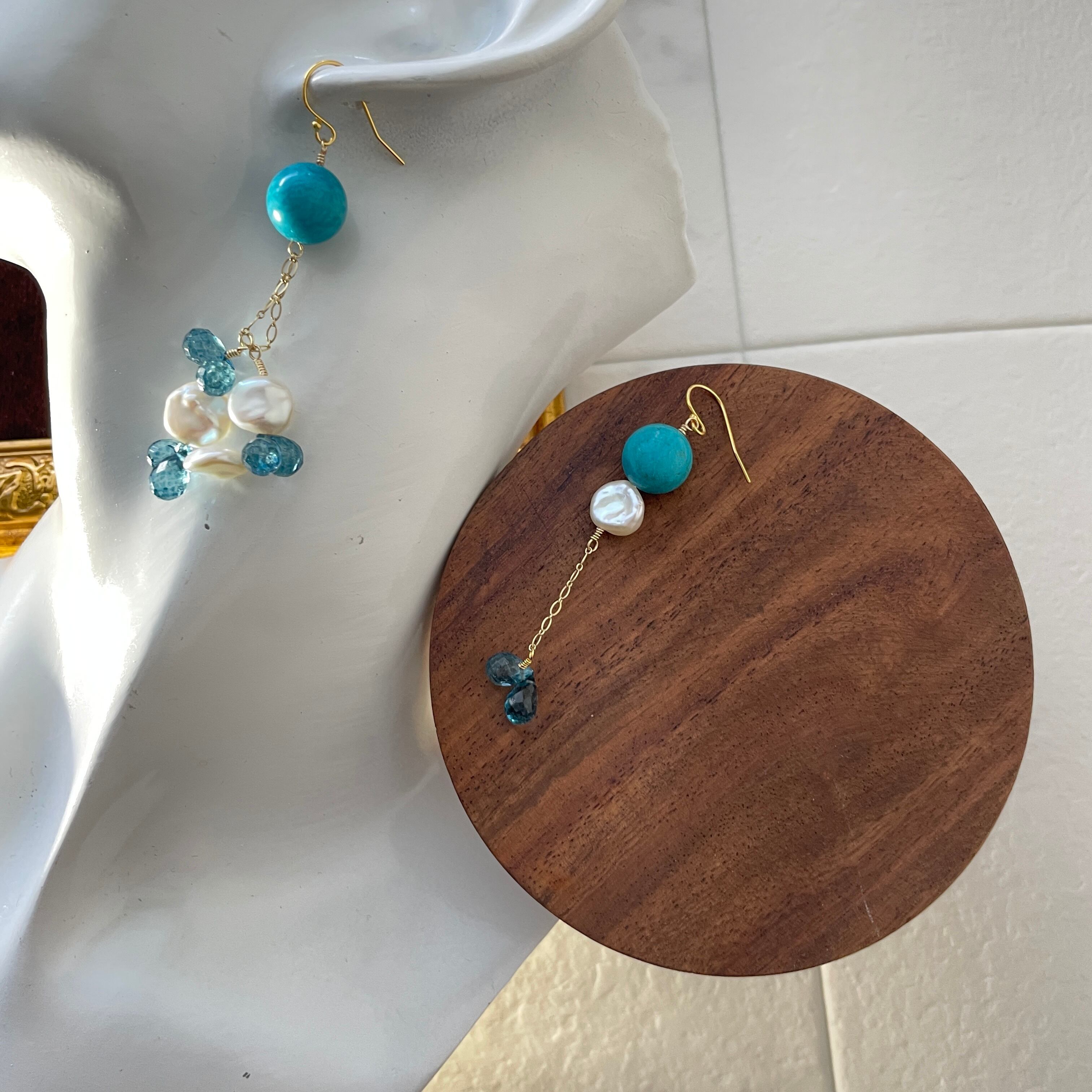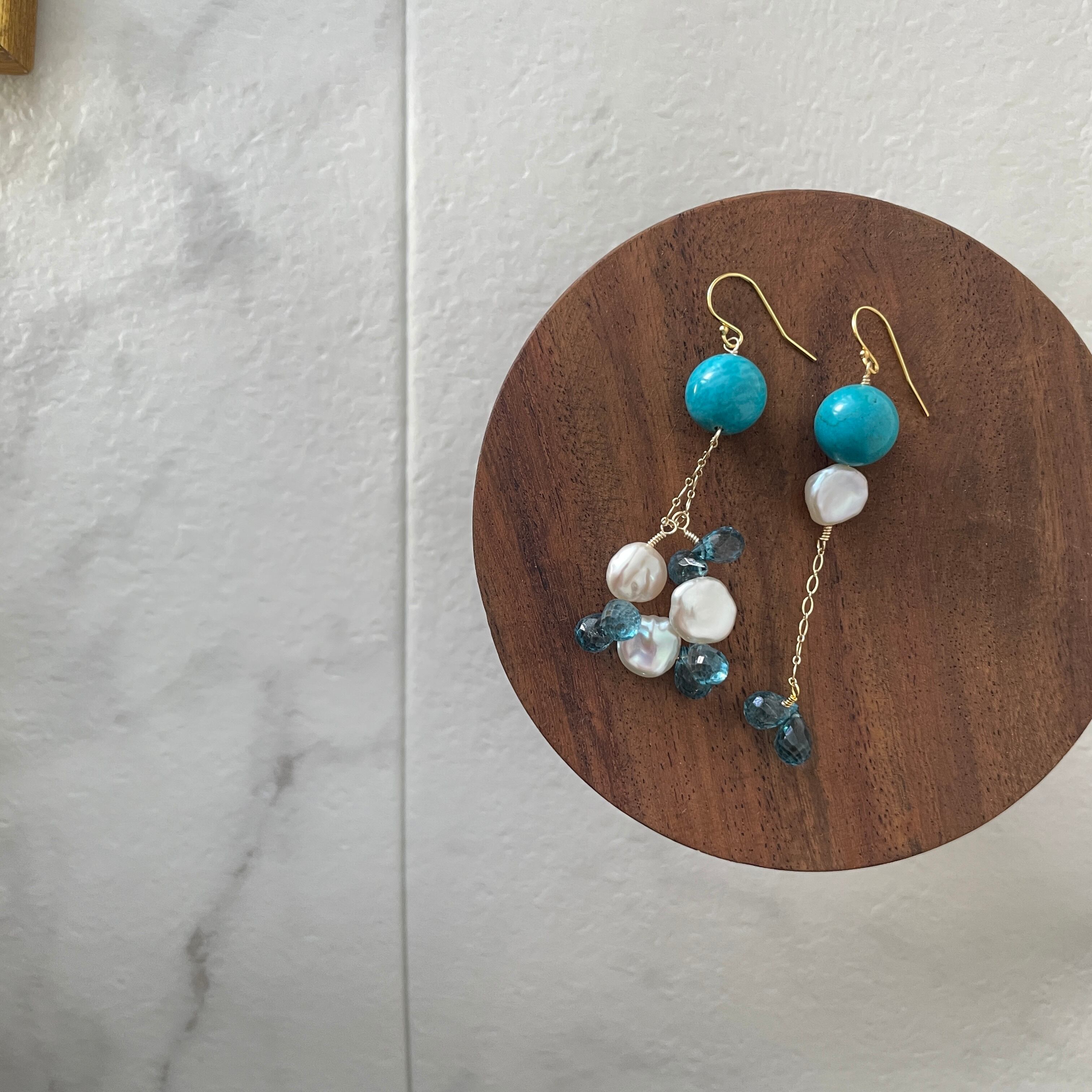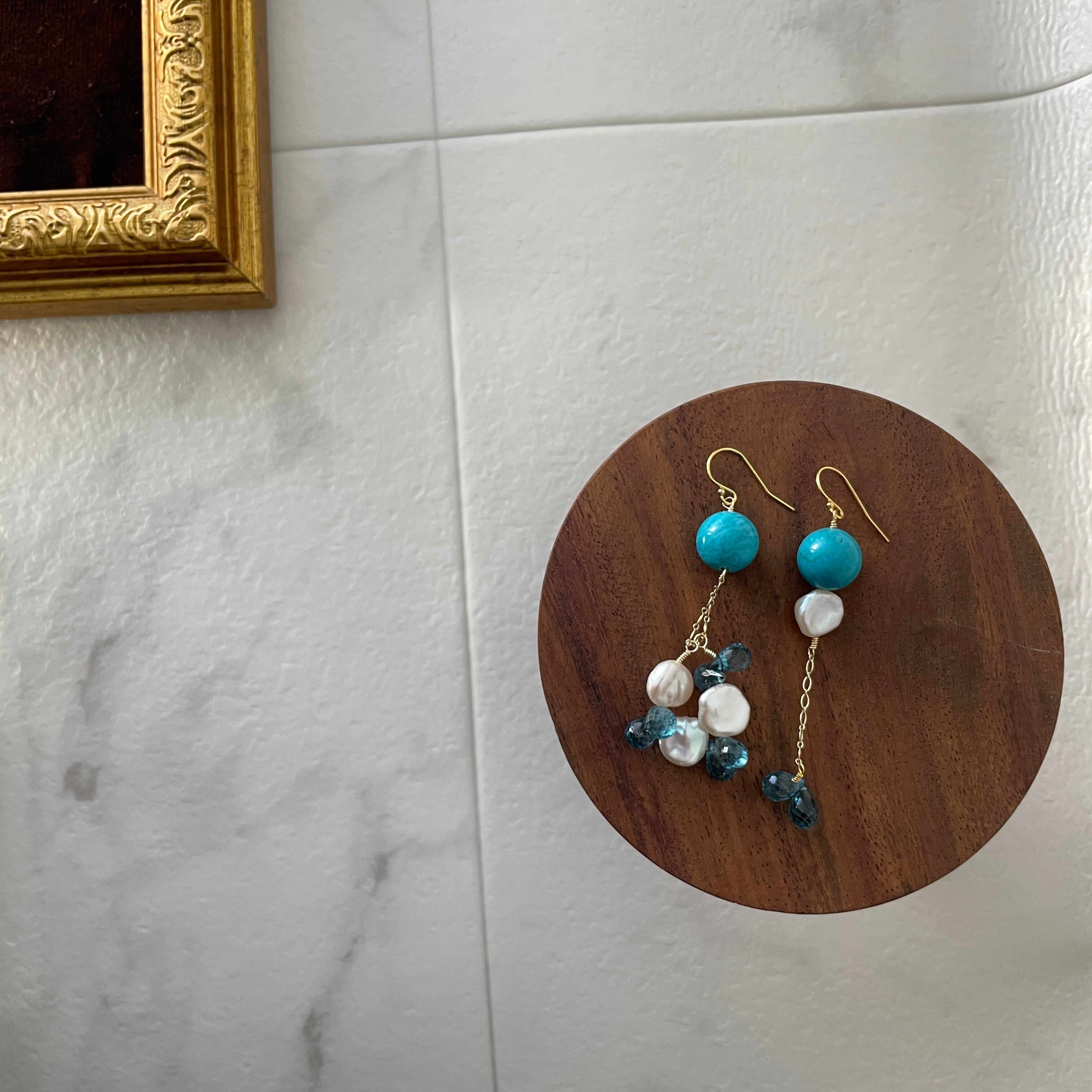 淡水パール、ターコイズ、ブルートパーズが絶妙に組み合わさったデザイン、美しい存在感を放ちます。着けるだけで華やかさをプラスし、お洒落な装いで他にはないオリジナリティを演出してくれます