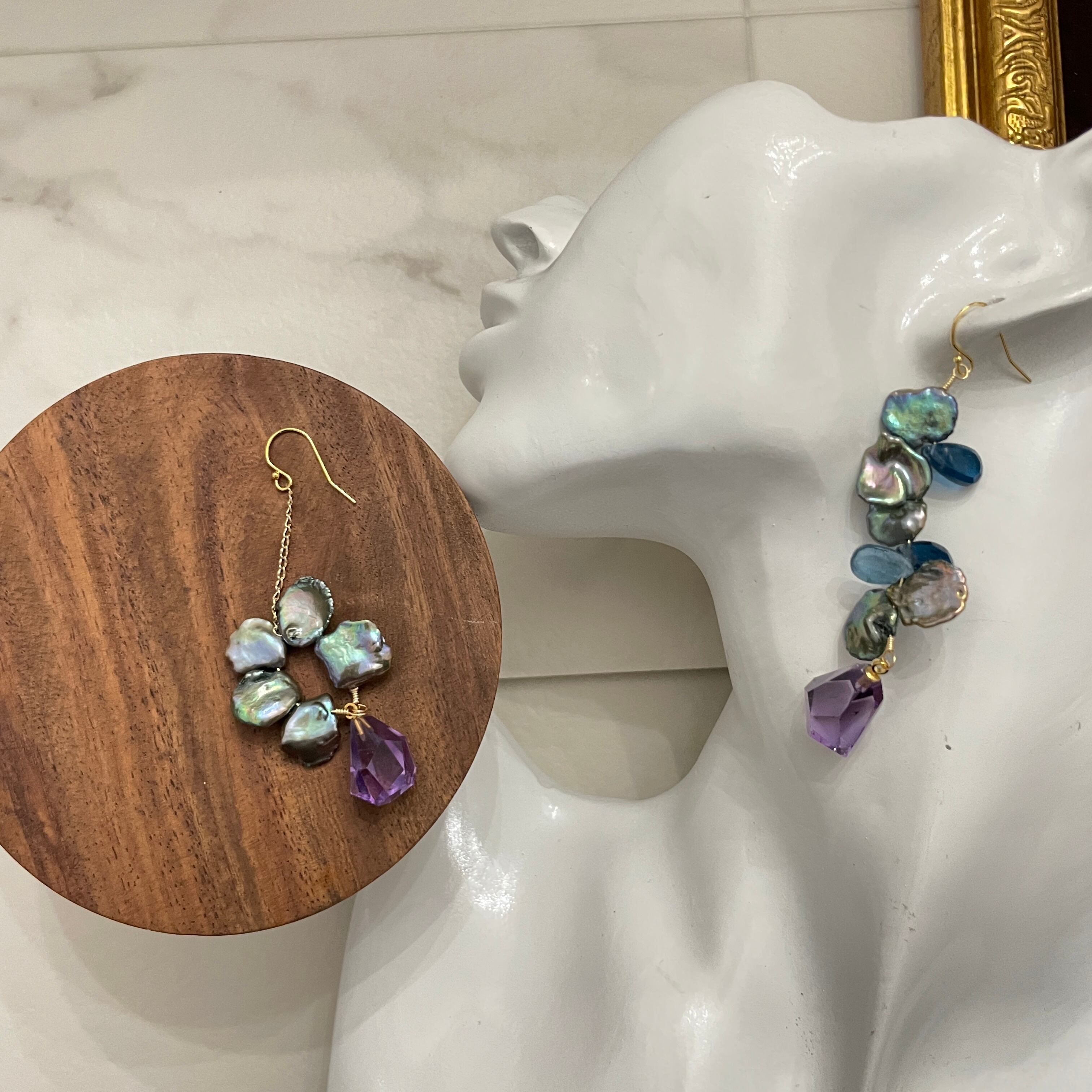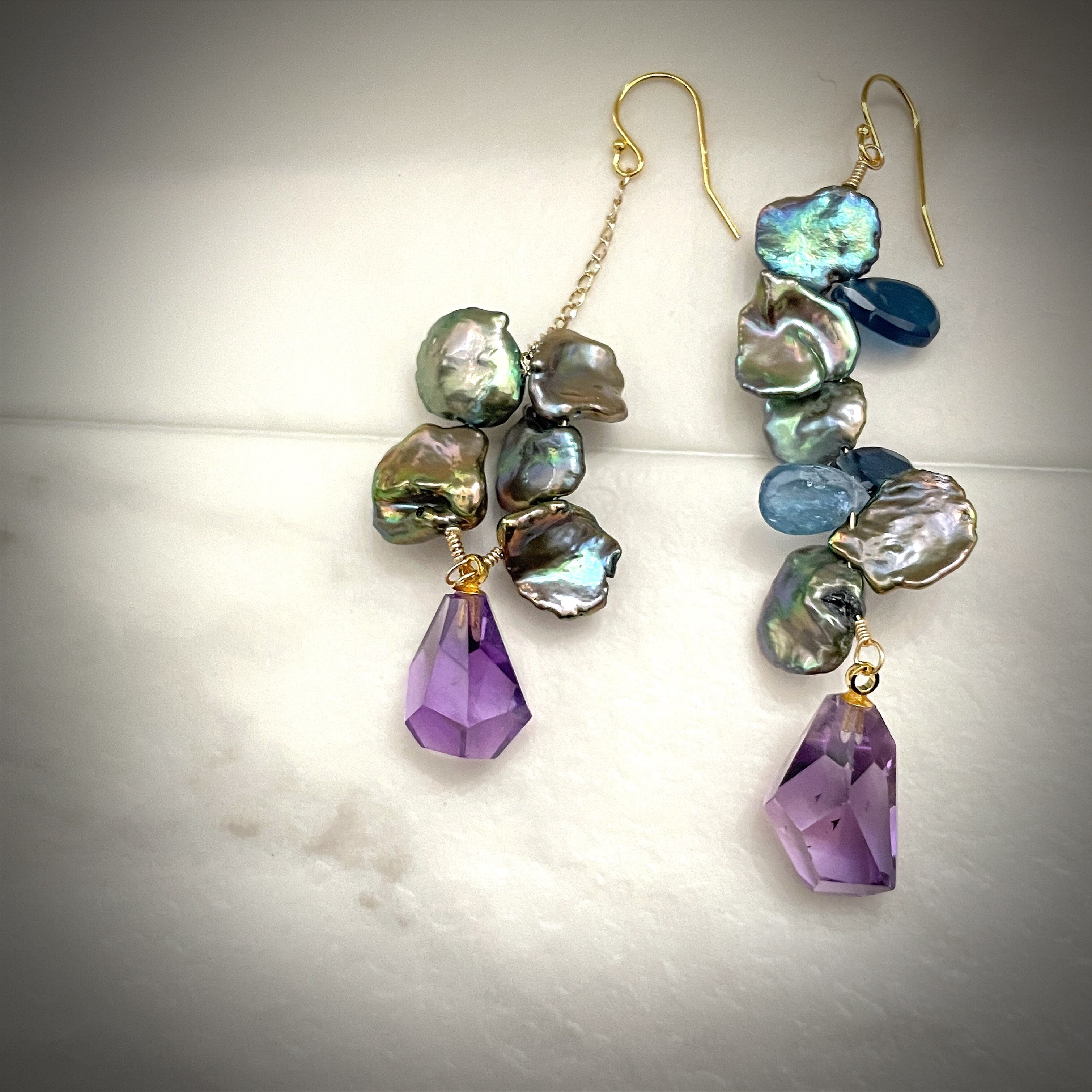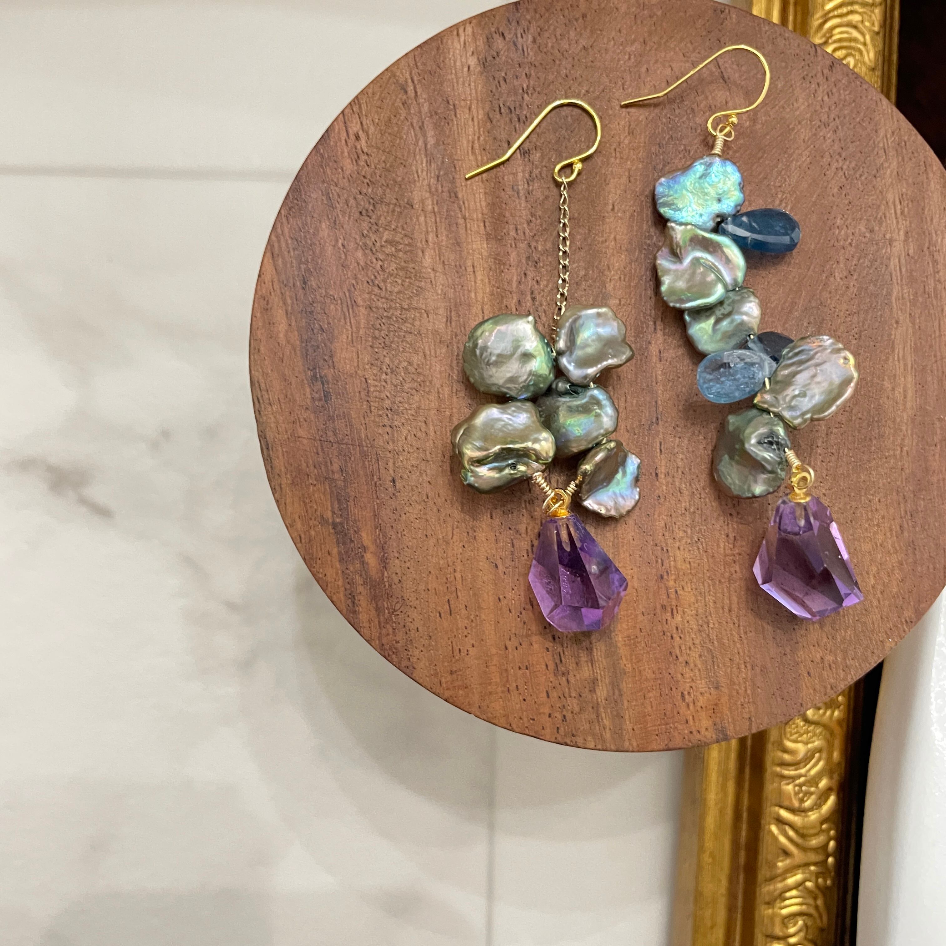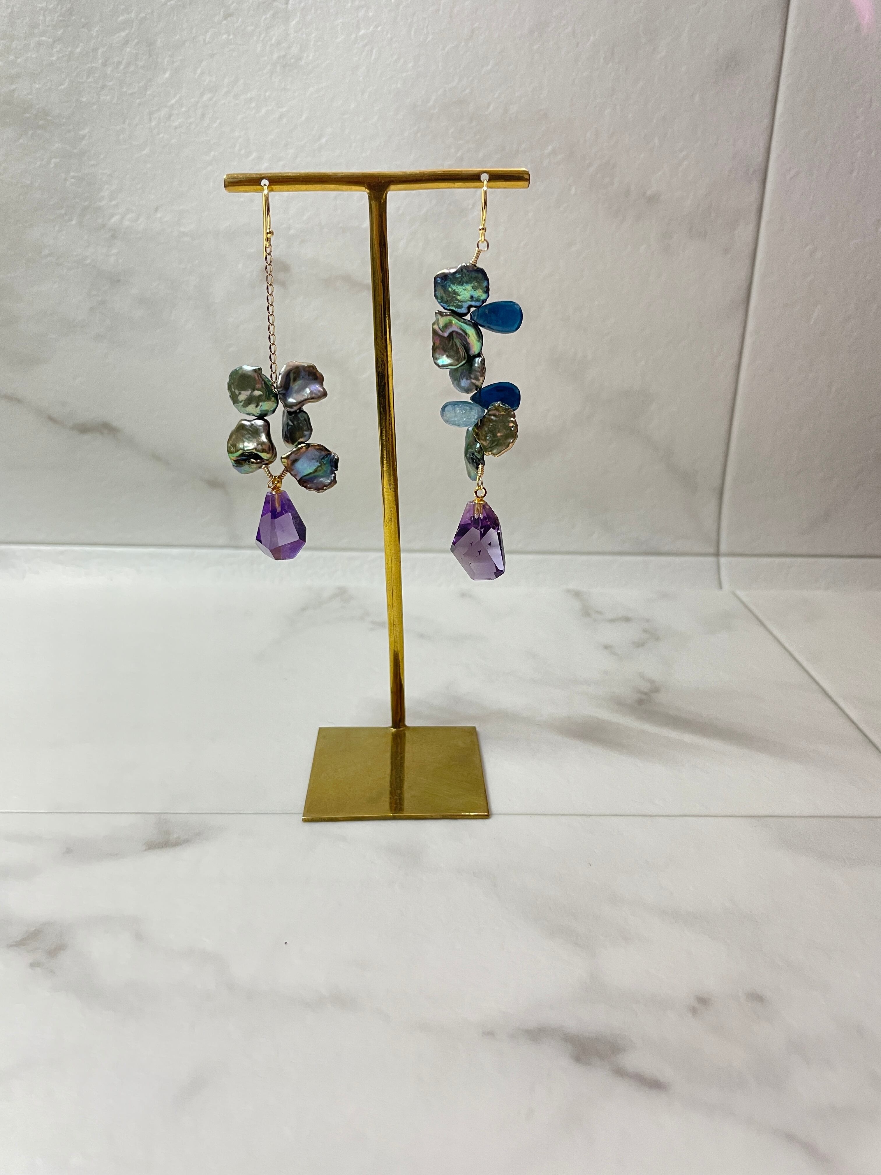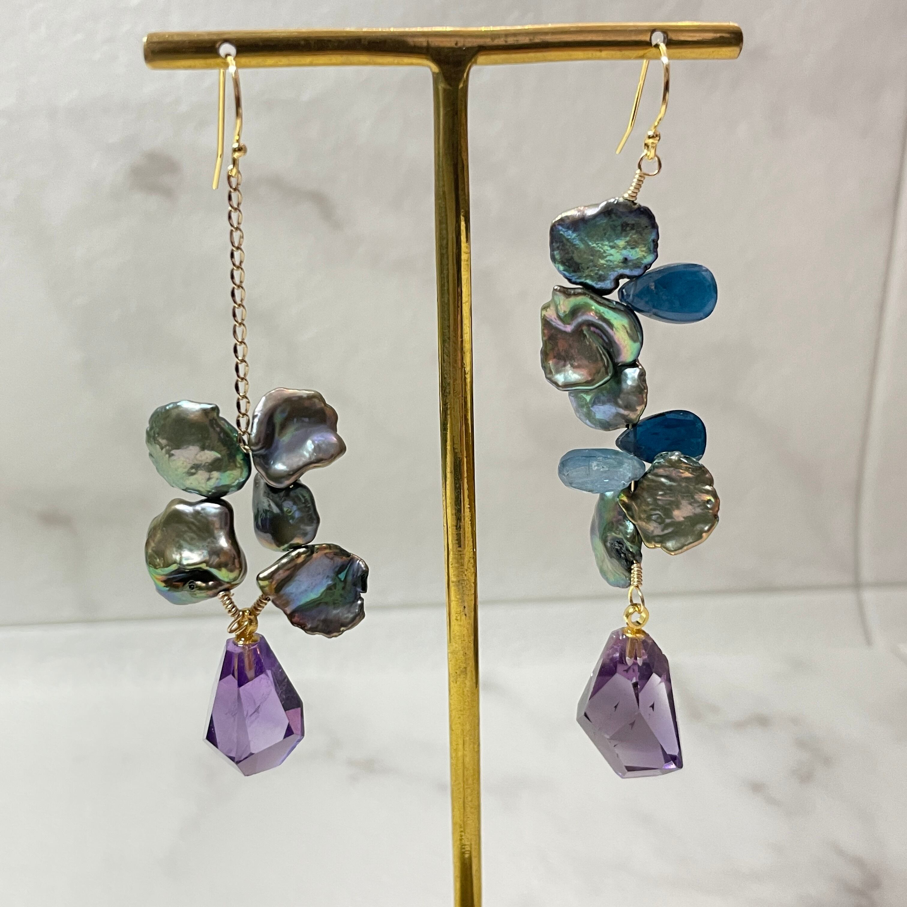 1点物のデザインピアス。コーティングカヤナイト、アメシスト、淡水パールの組み合わせが織りなす優美な輝きは、存在感を放ちます。