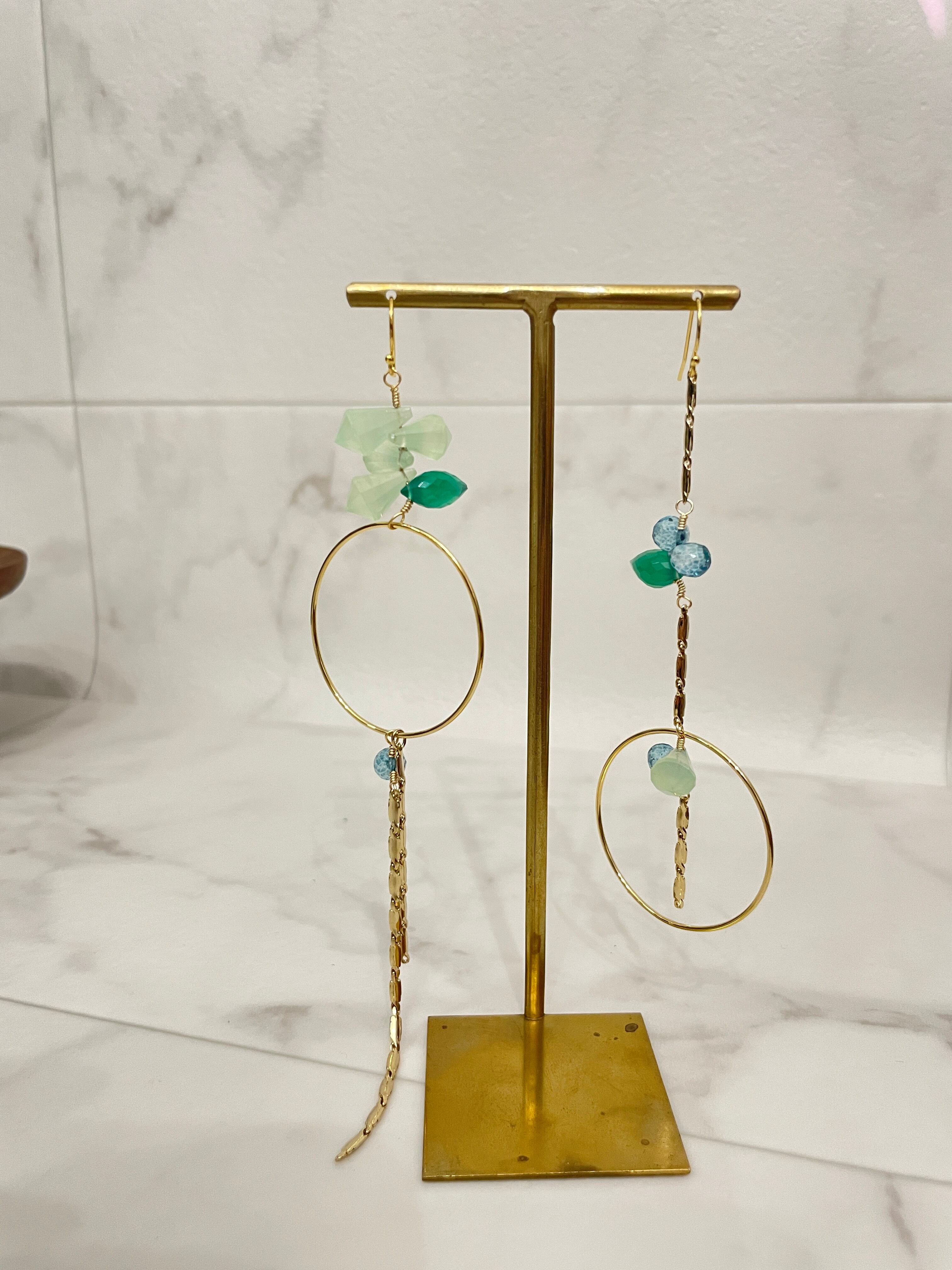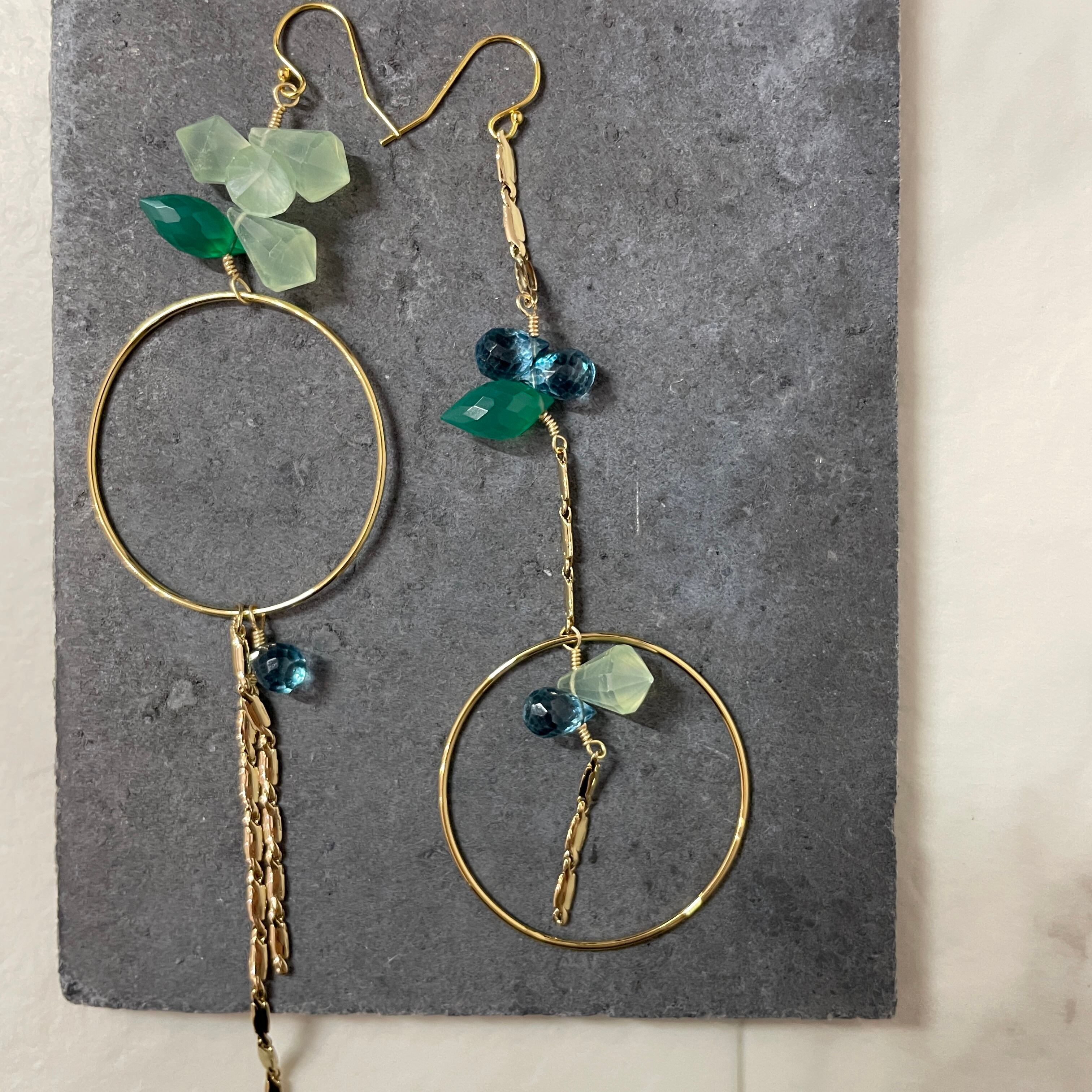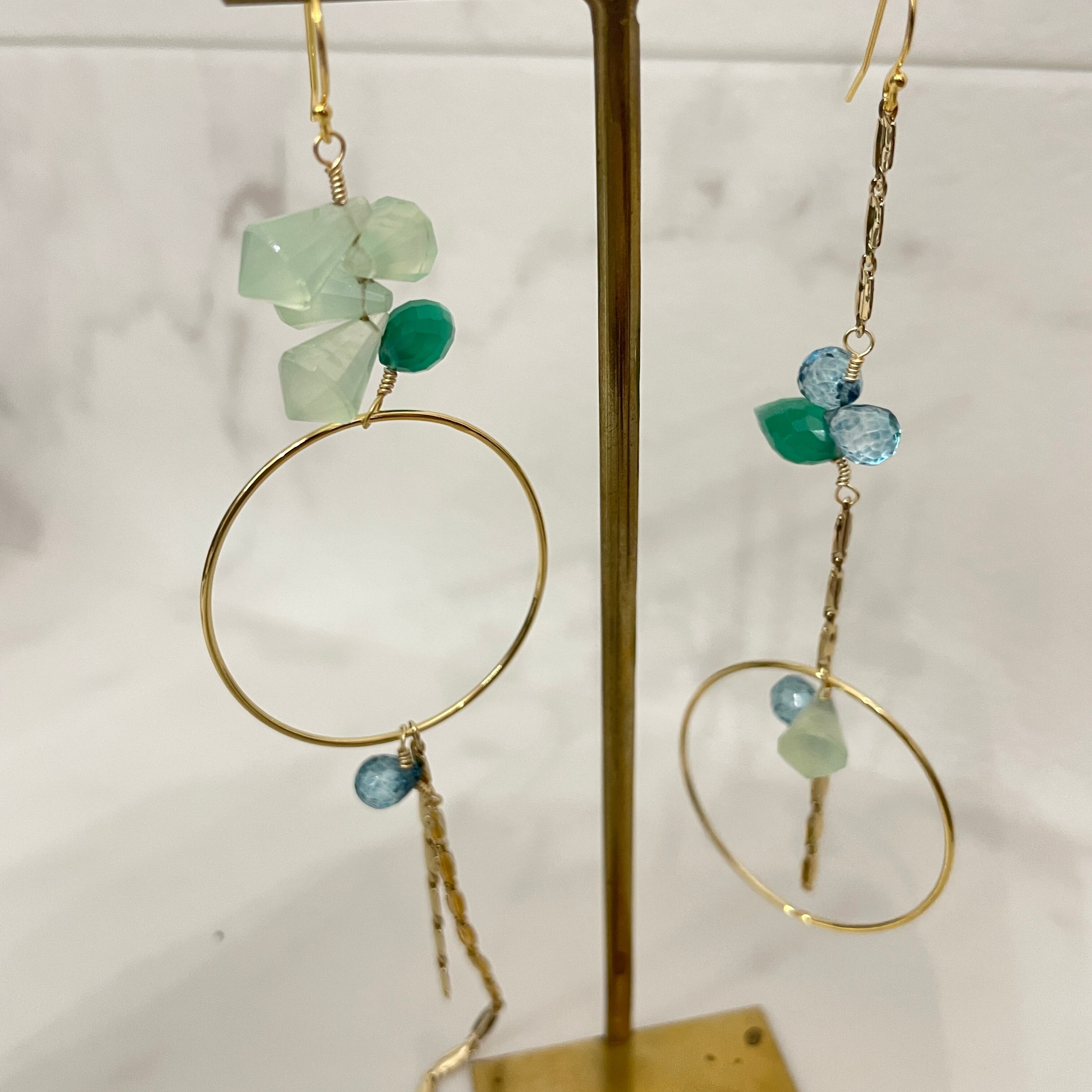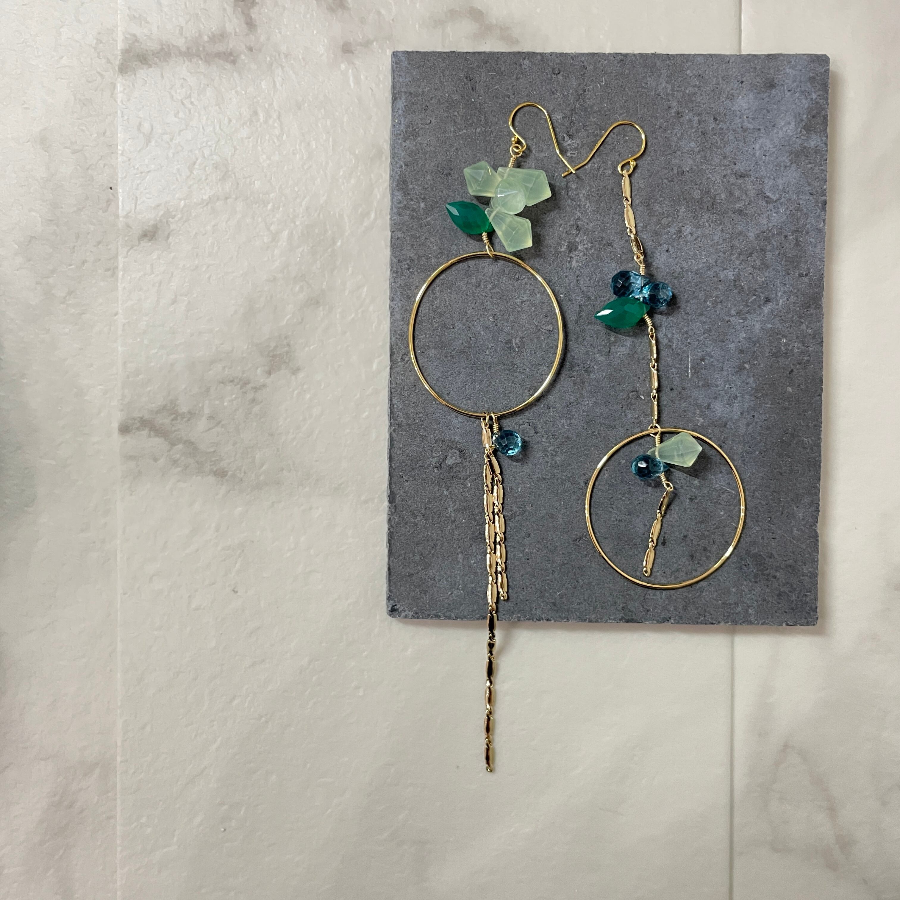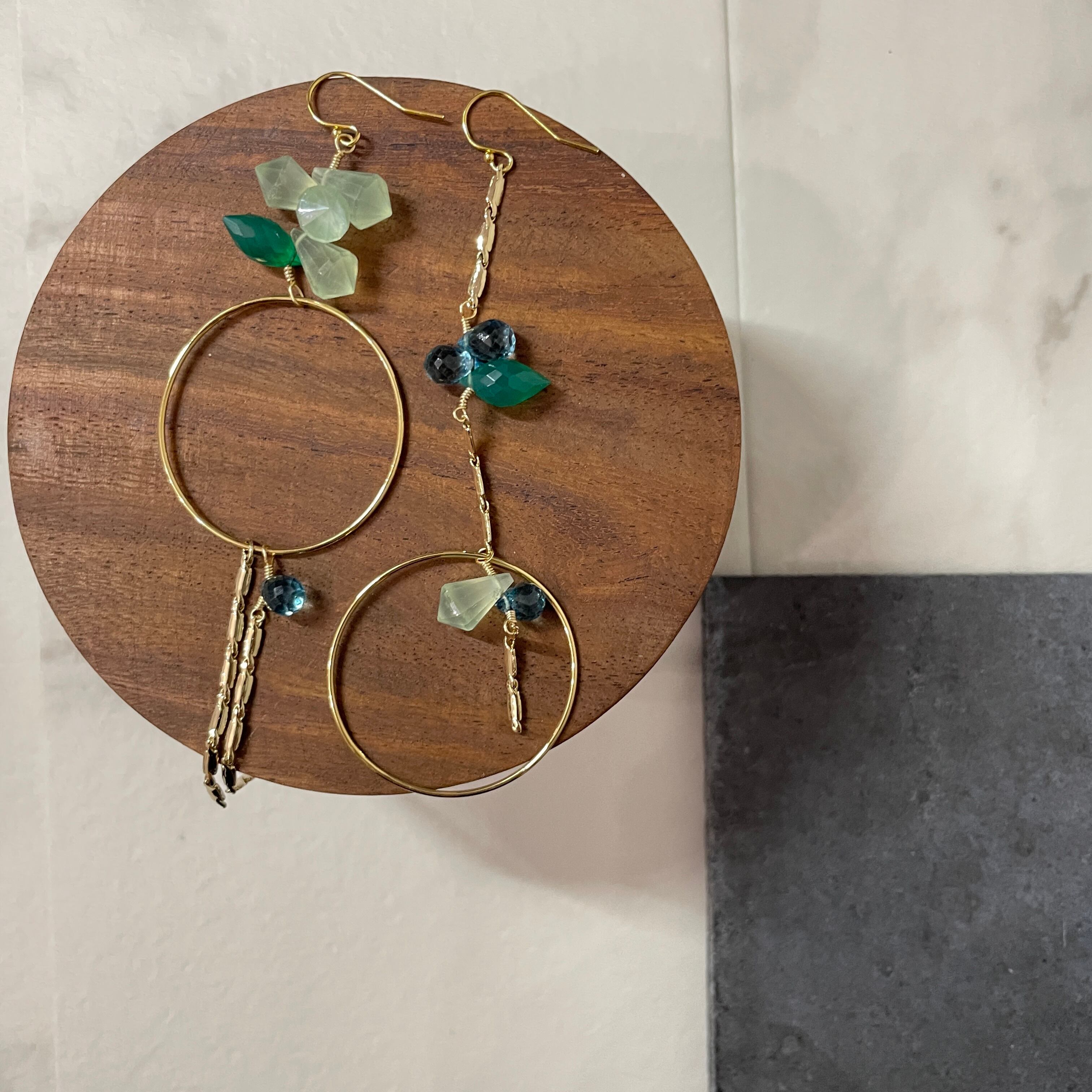 プレナイト、コーティングブルートパーズ、グリーンカルセドニーが煌めく、デザインピアス。洗練されたグリーンカラーが、上品な印象を際立たせます。1点物のため、他にはないオリジナルな装いを楽しめるのも魅力です。お好みのスタイルに合わせて楽しんでいただけます。