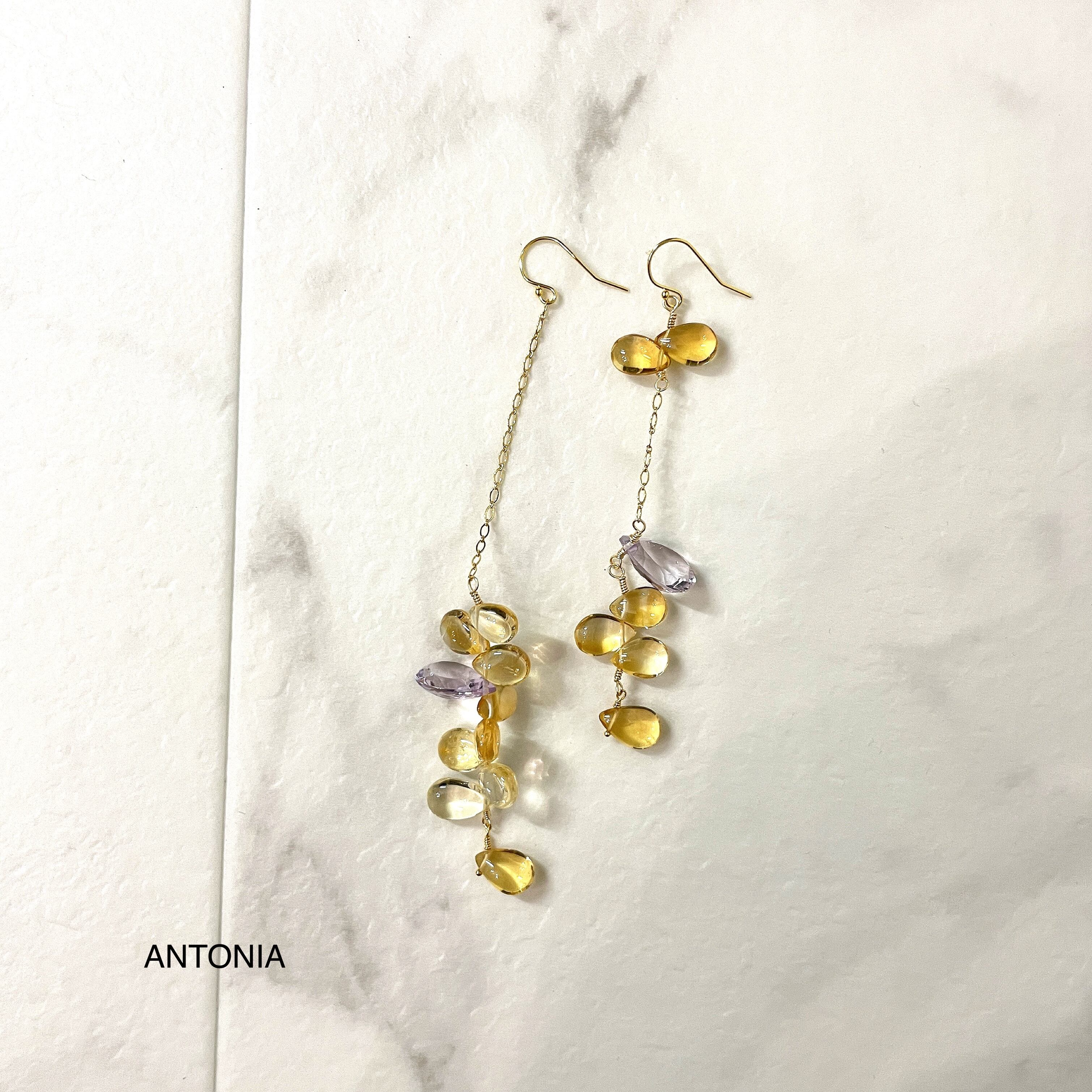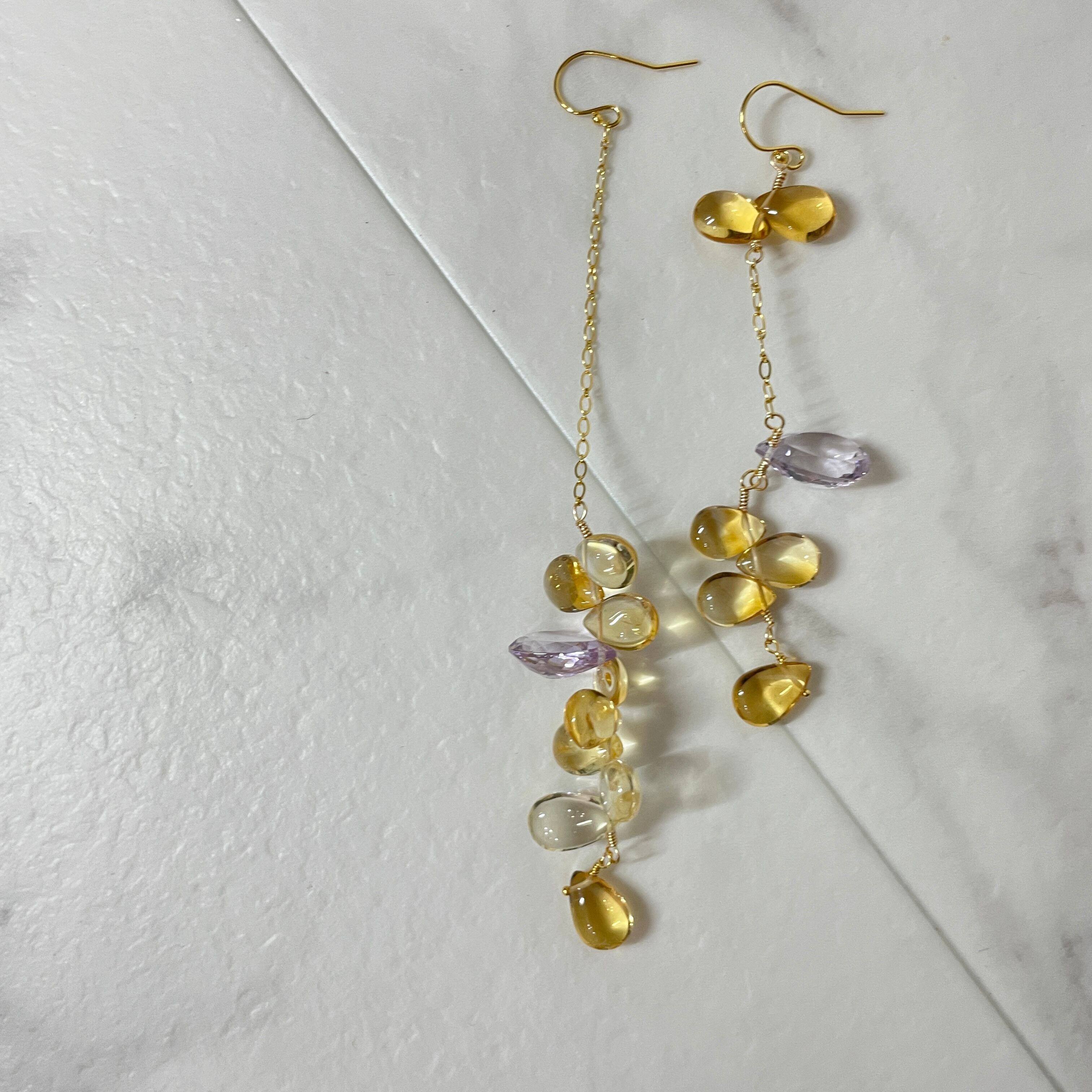デザインピアス 1点物(イヤリング変更可)。シトリンとピンクアメジストの美しい輝きを楽しめるデザインです。1点物なので、他にはない個性を身に着けることができます。シトリンは明るいエネルギーを持ち、ピンクアメジストは癒しや安らぎをもたらすと言われています。どんな装いにも合わせやすく、おしゃれのアクセントになること間違いなしです。ぜひこの特別なピアスで毎日を楽しく彩ってみてください。