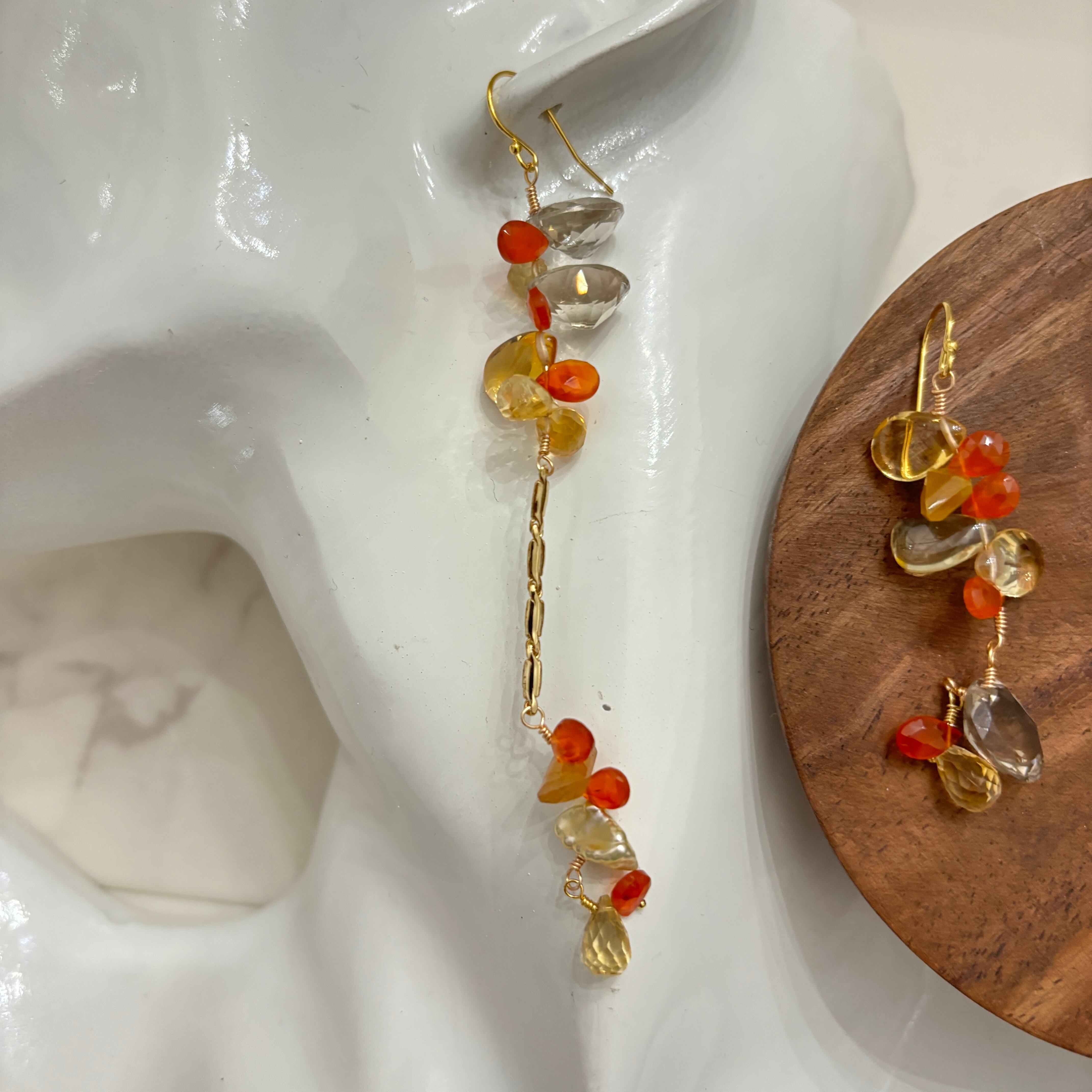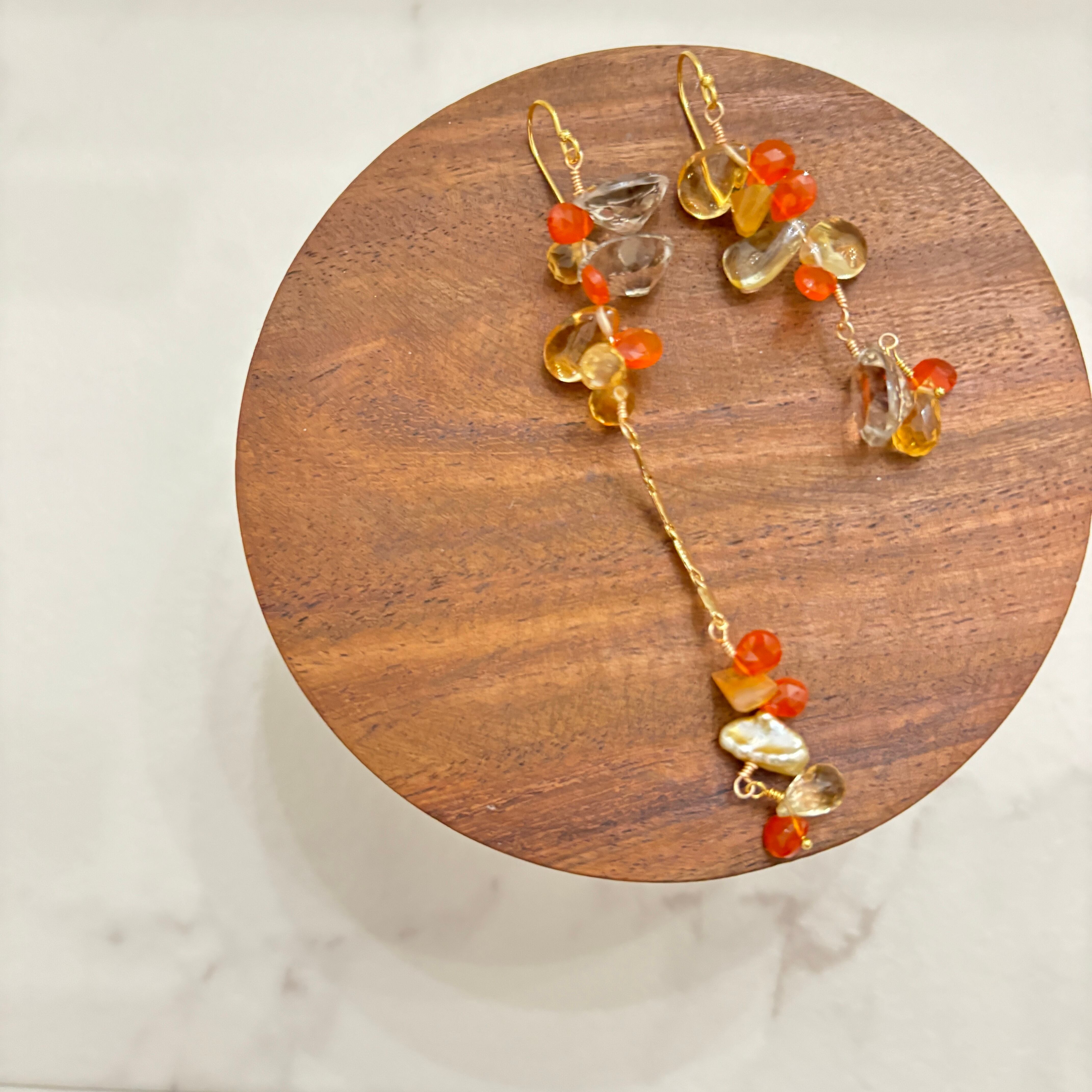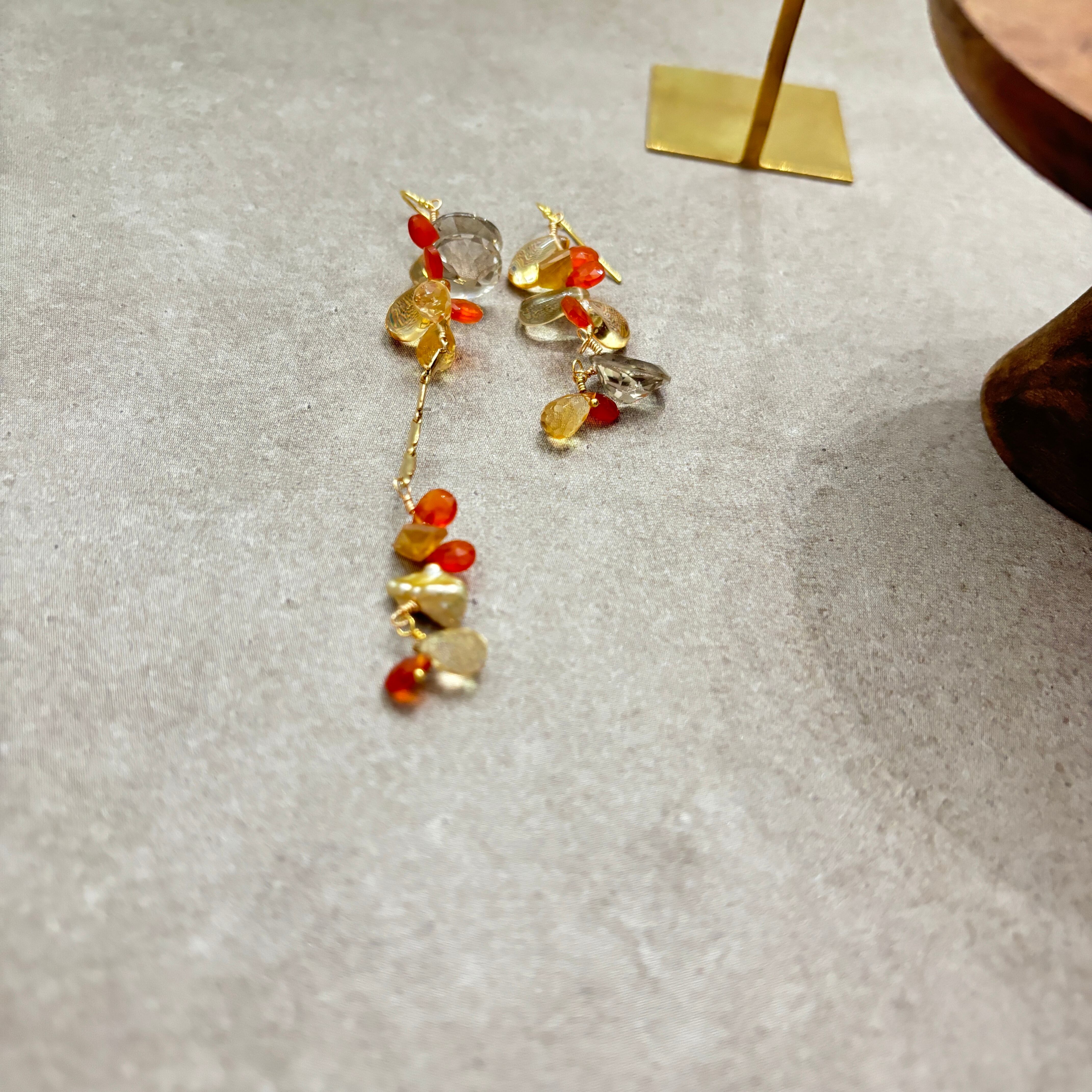 秋にぴったりなカラーが魅力の、デザインピアス1点物。シトリンやカーネリアン、クォーツなど、秋の季節にふさわしい温かみのあるストーンを使用しています。一点物なので、他とは違った個性的なデザインをお楽しみいただけます。