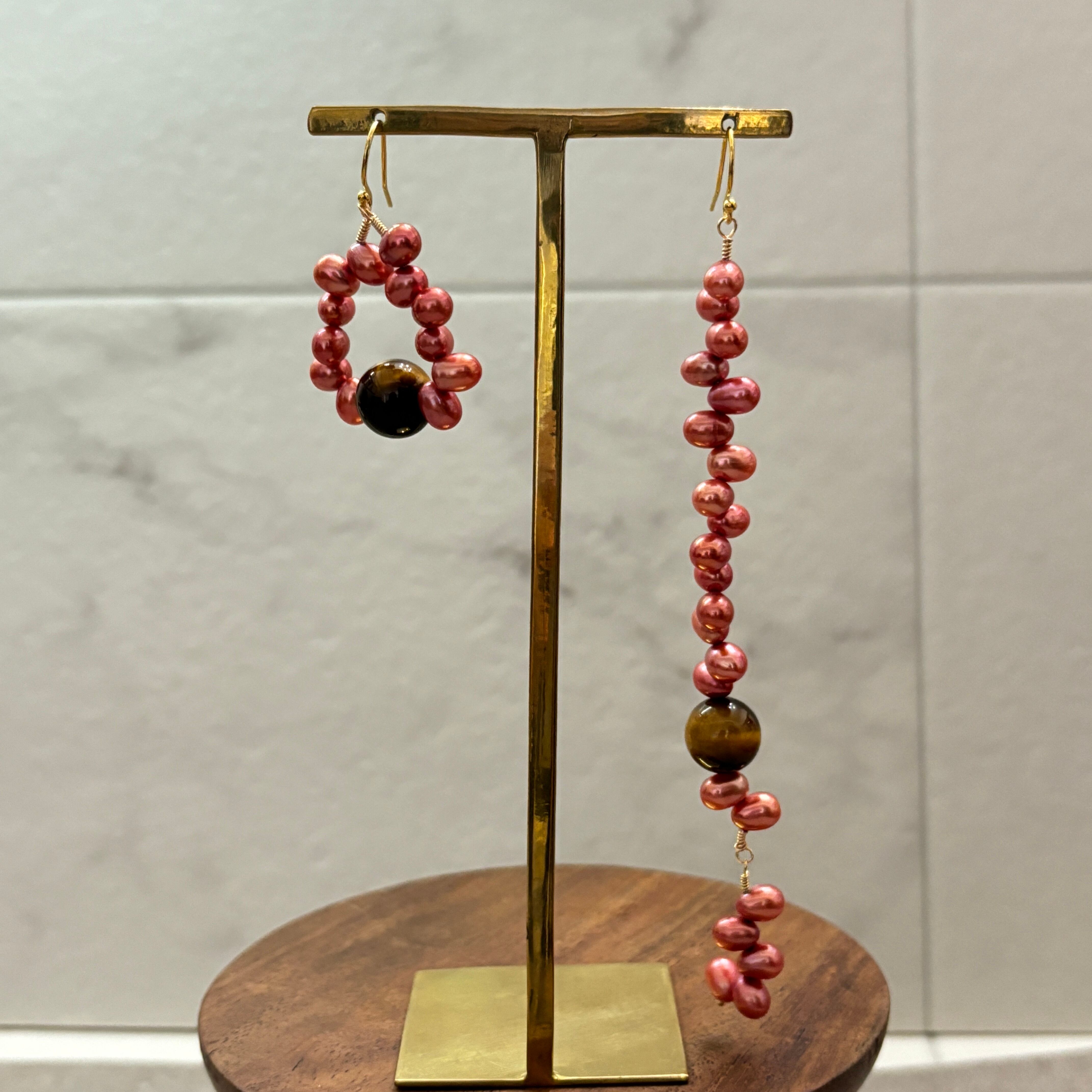 秋の装いにぴったりのタイガーアイと染淡水パールが織り成す、デザインピアス。