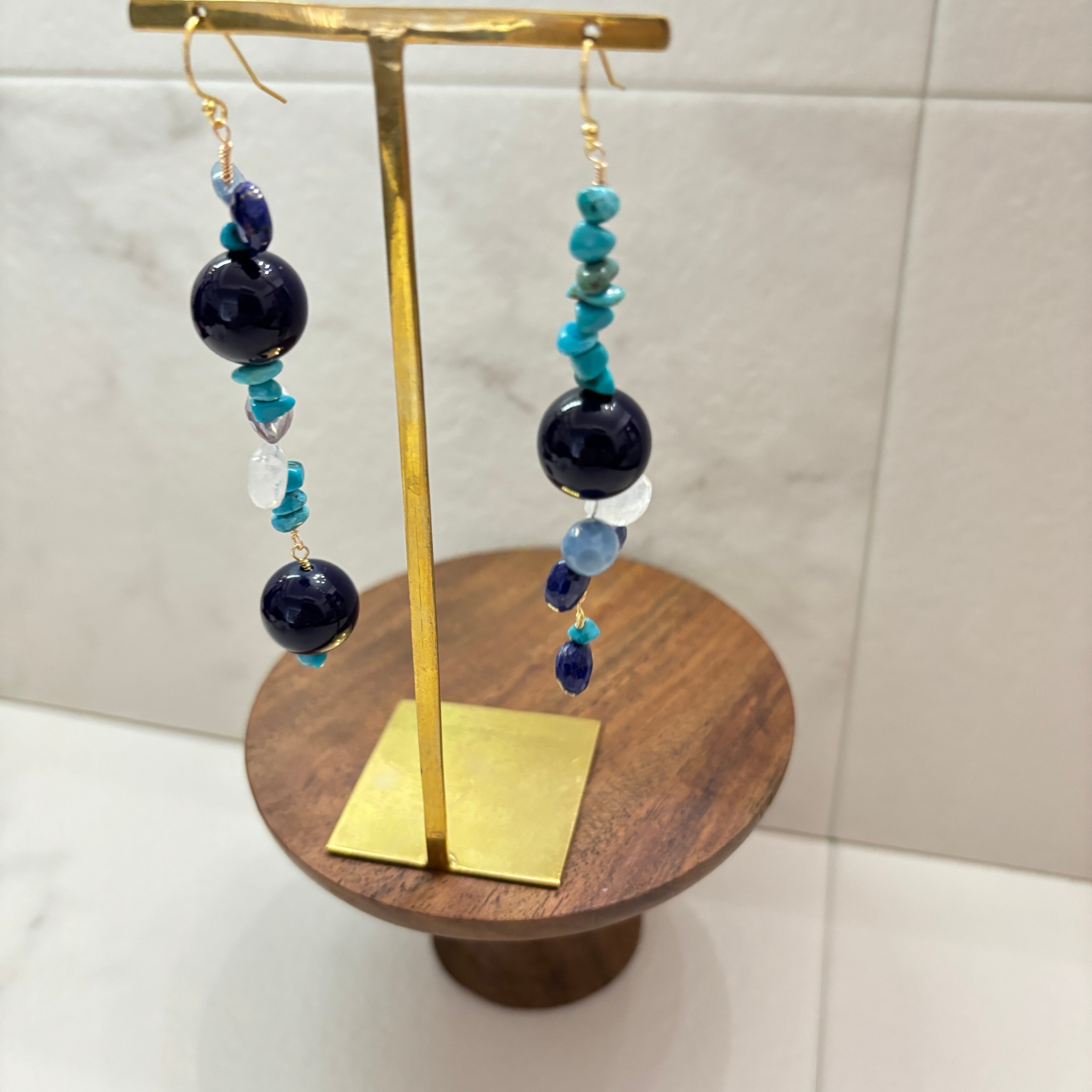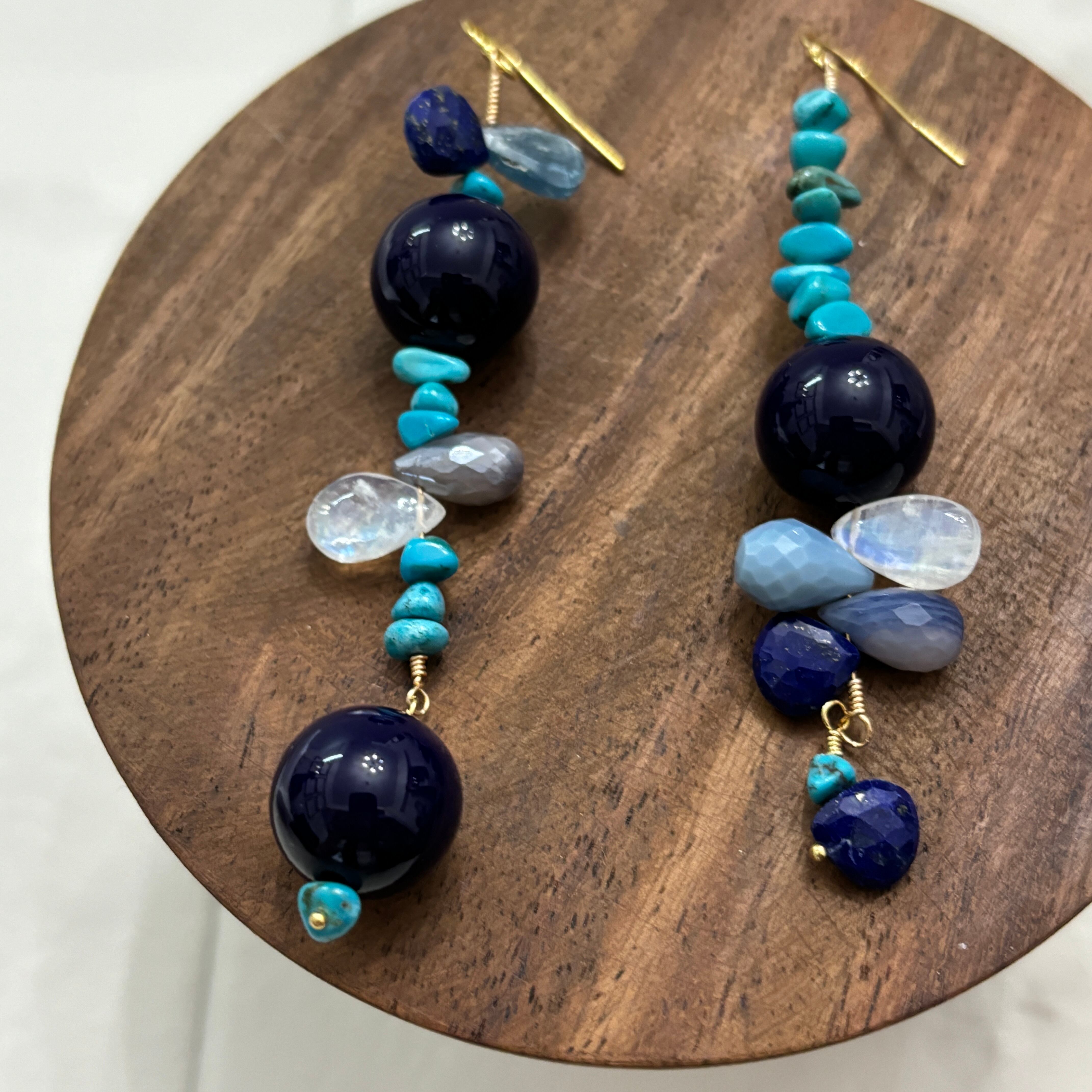 この1点物のデザインピアスは、ブルーカラーが美しく輝き、どこかミステリアスな魅力を放っています。世界にひとつだけのオリジナルデザインで、他の誰ともかぶることのない特別感があります。