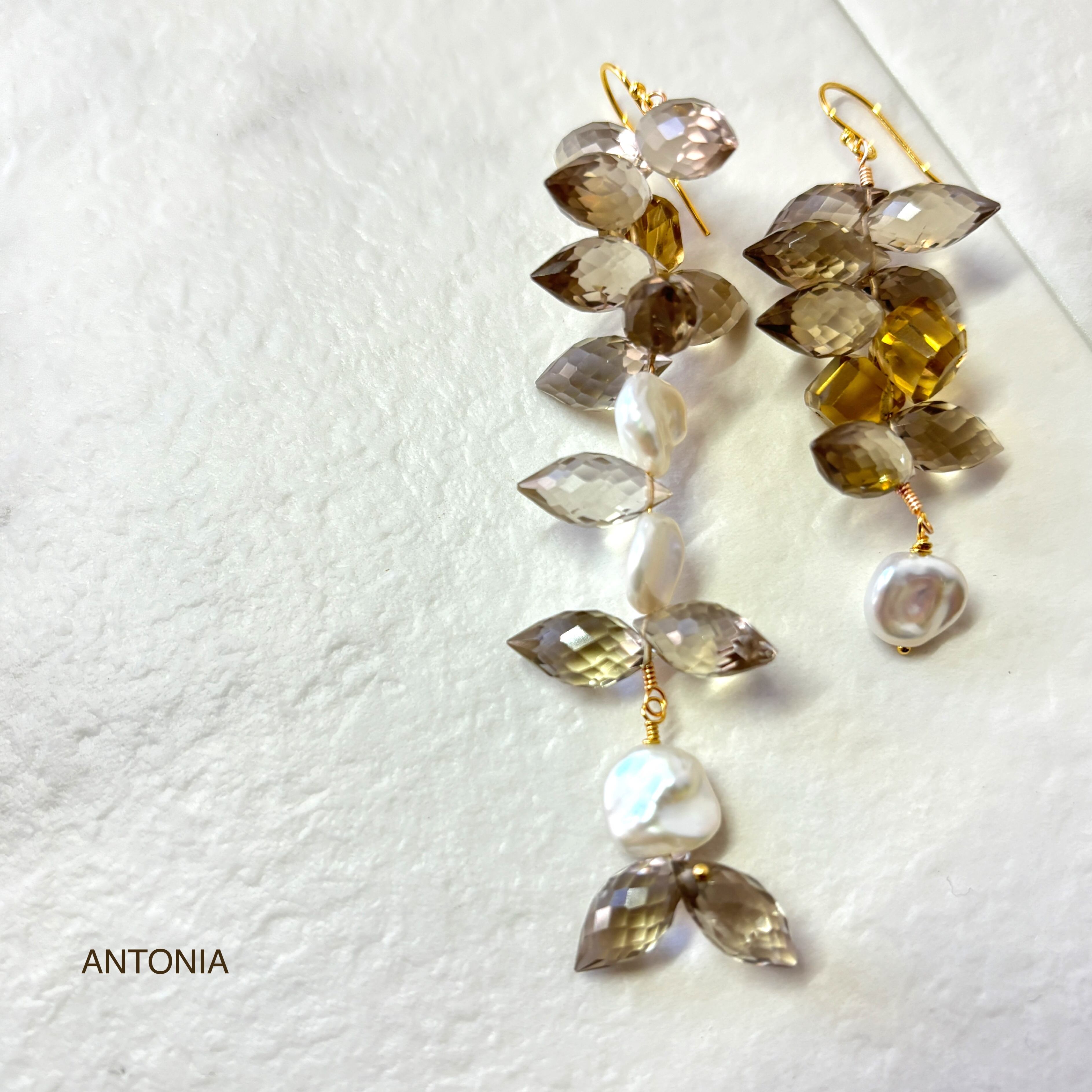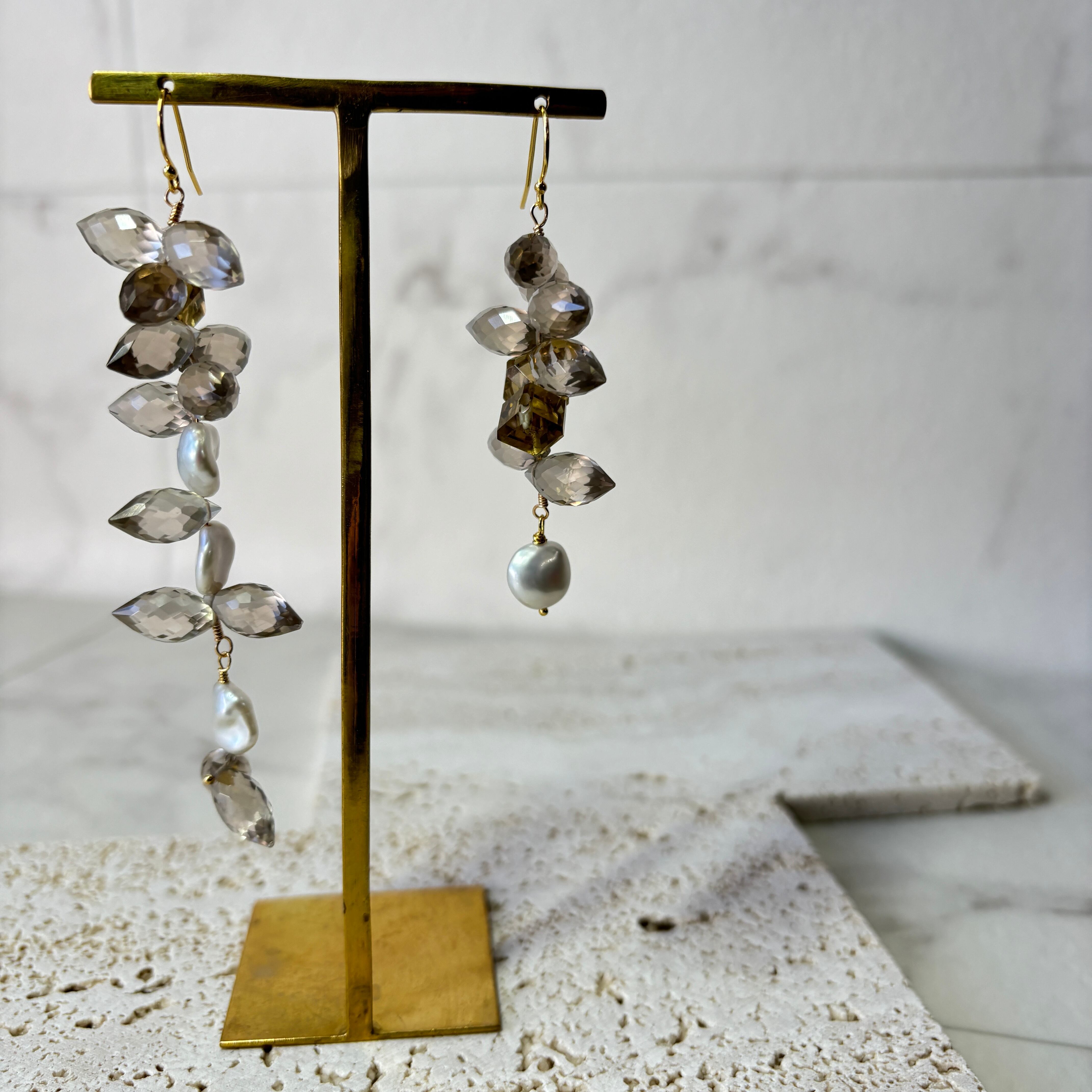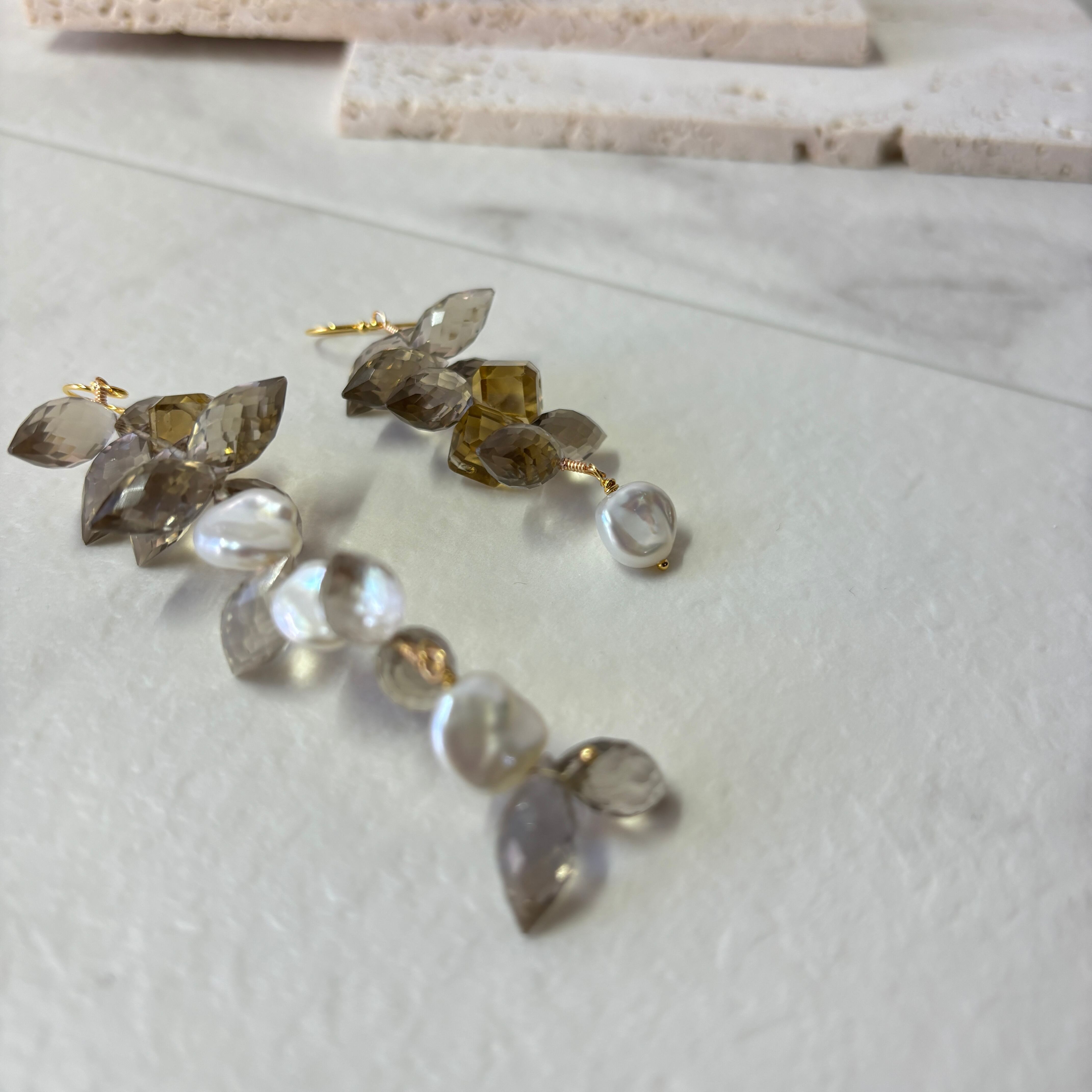 スモーキークォーツ、シトリン、淡水パールの絶妙な組み合わせが光る、デザインピアス1点物。このピアスは、あなたの個性をより一層引き立てるためにデザインされており、世界でひとつだけの特別なアイテムとなっています。