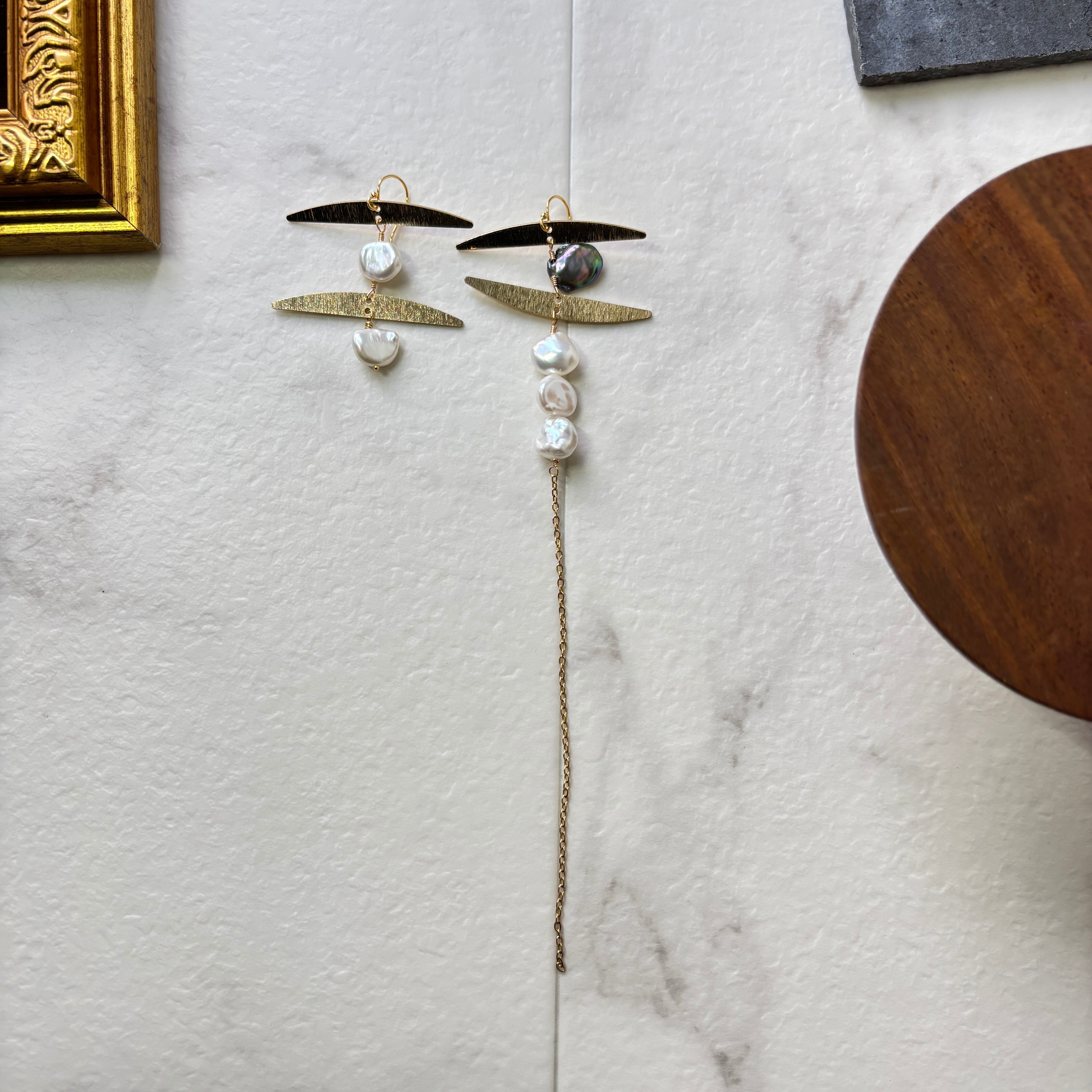 フランスから輸入したパーツと淡水パールを贅沢に使用したデザインピアスは、唯一無二のアシンメトリーデザインが特長です。このピアスは、あなただけのスタイルを引き立てるために特別にデザインされた一品です。 どんなシーンでも品よく映えるこのピアスは、特別な日やカジュアルな装いにぴったり。あなたの魅力を一層引き立てるお手伝いができれば幸いです。ぜひこの機会に耳元に華やかさをプラスしてください。