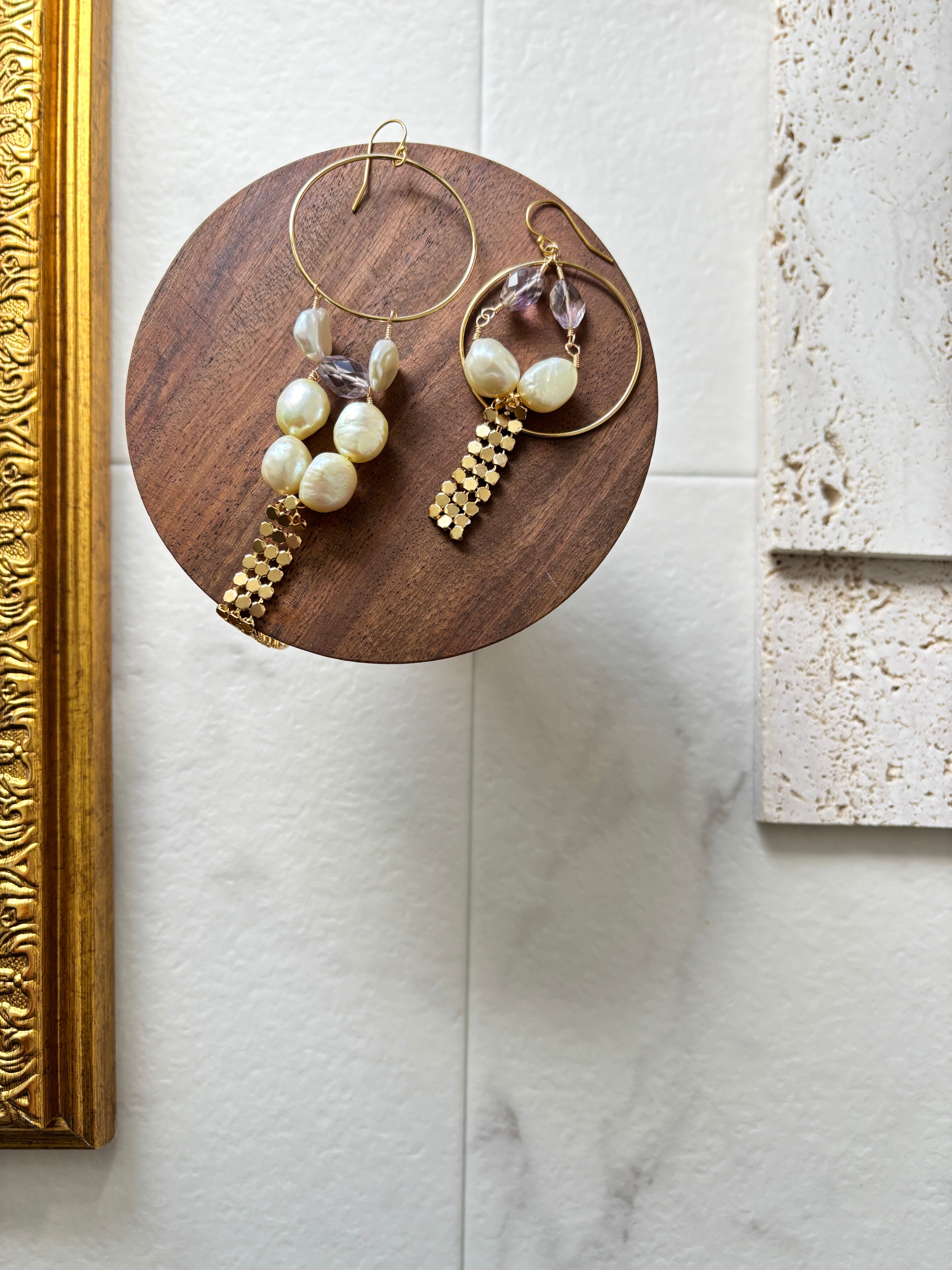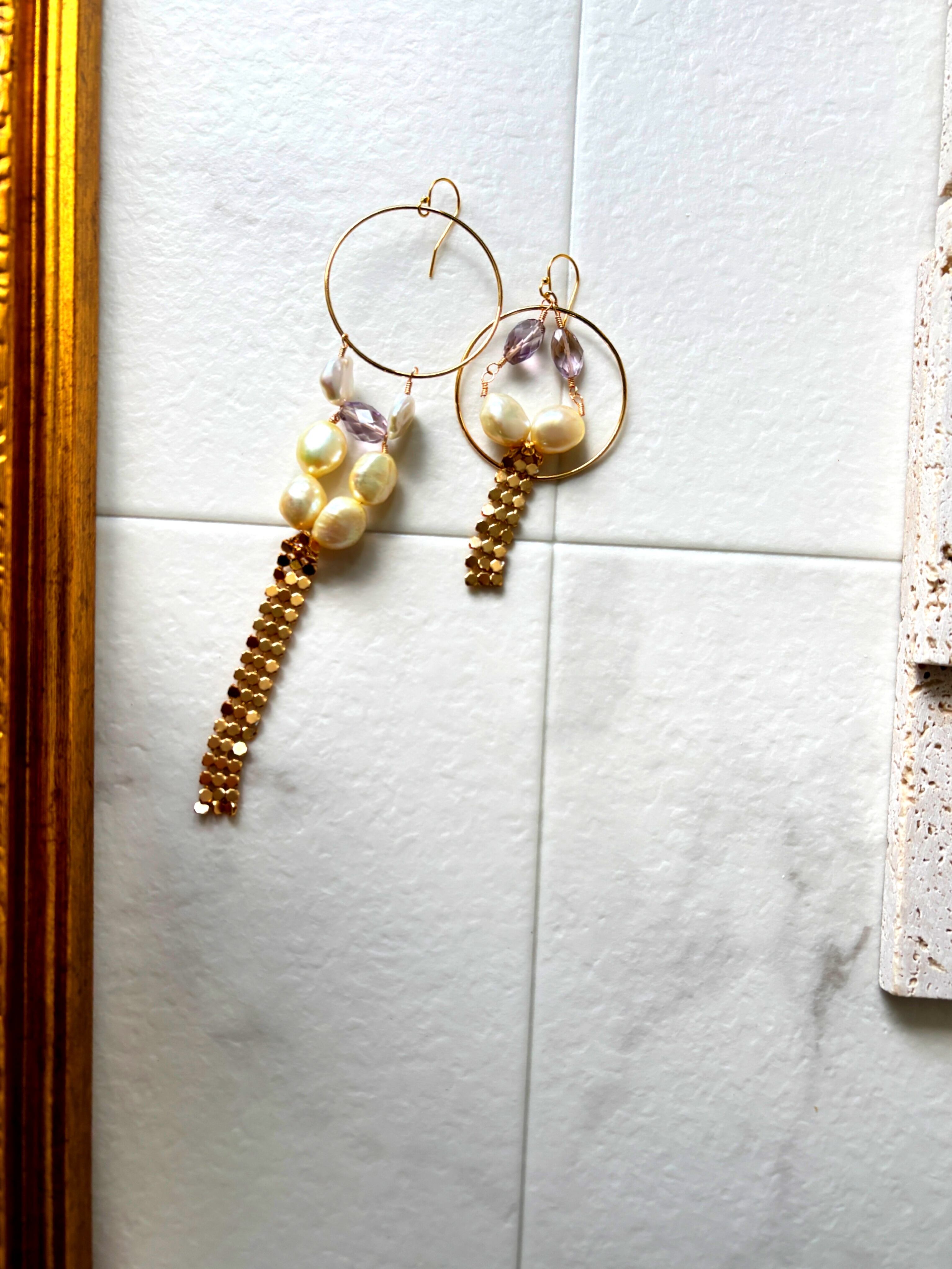 このデザインピアスは、アメトリンと淡水パールがサークルパーツと絶妙に組み合わさった1点物です。あなたの個性を優雅に引き立て、さまざまなシーンで際立つ存在感を発揮します。特別な日の装いから日常使いまで、この美しいピアスが耳元を華やかに彩ることでしょう。あなたの魅力を一層引き立てるお手伝いができれば嬉しいです。