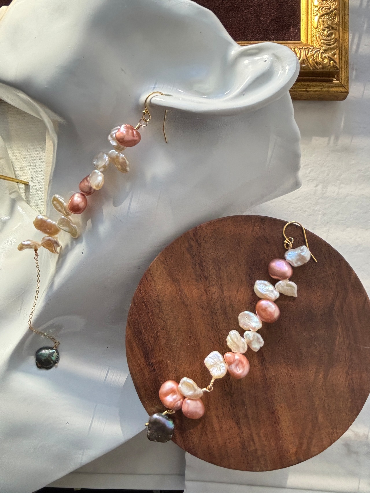 このデザインピアスは、ピンクの淡水パールを用いた特別な1点物です。独自のデザインと優美な色合いが特徴で、さまざまなシーンにマッチし特別な日のお出かけから普段使いまで、耳元を華やかに彩り、あなたの魅力を一層引き立てるお手伝いができれば嬉しいです。