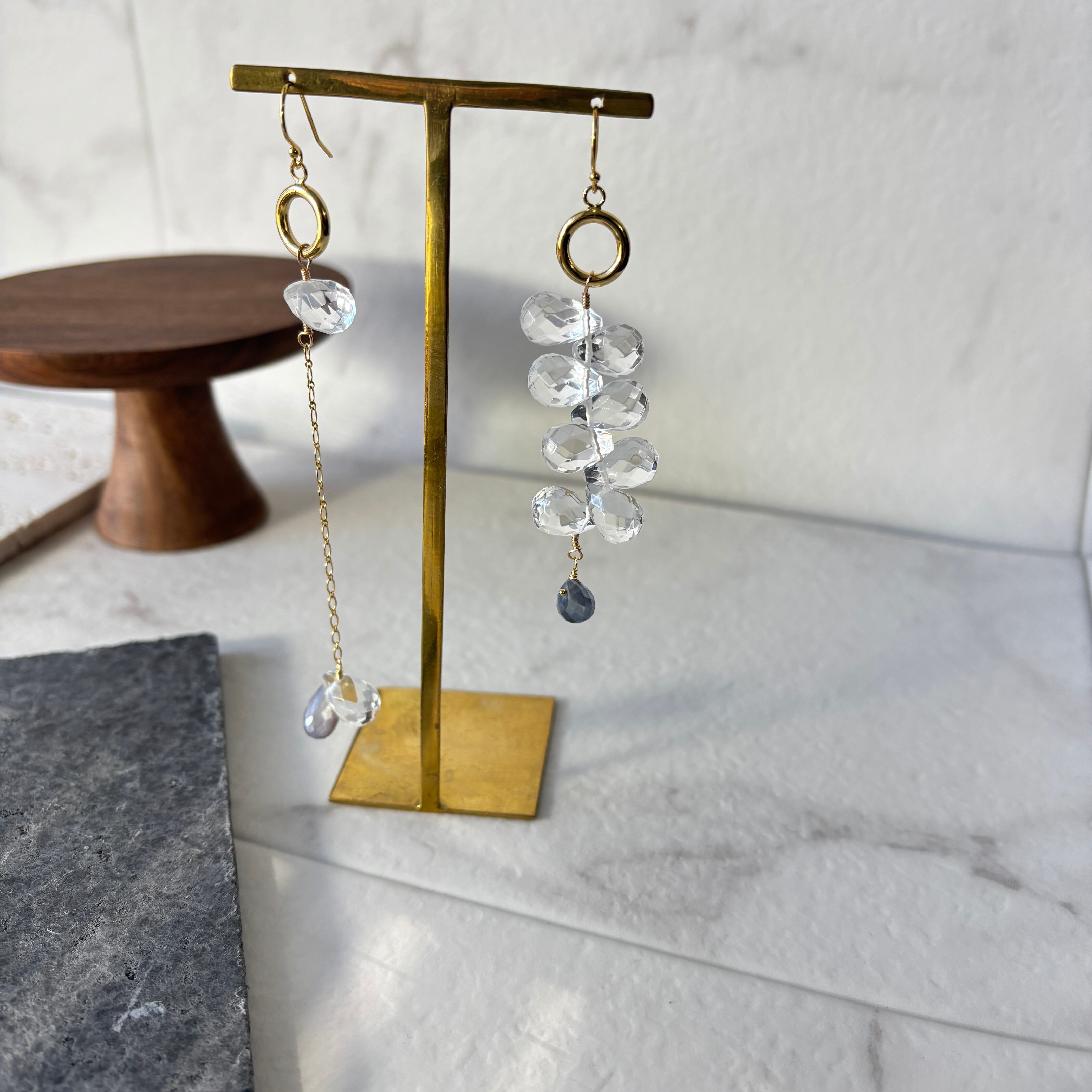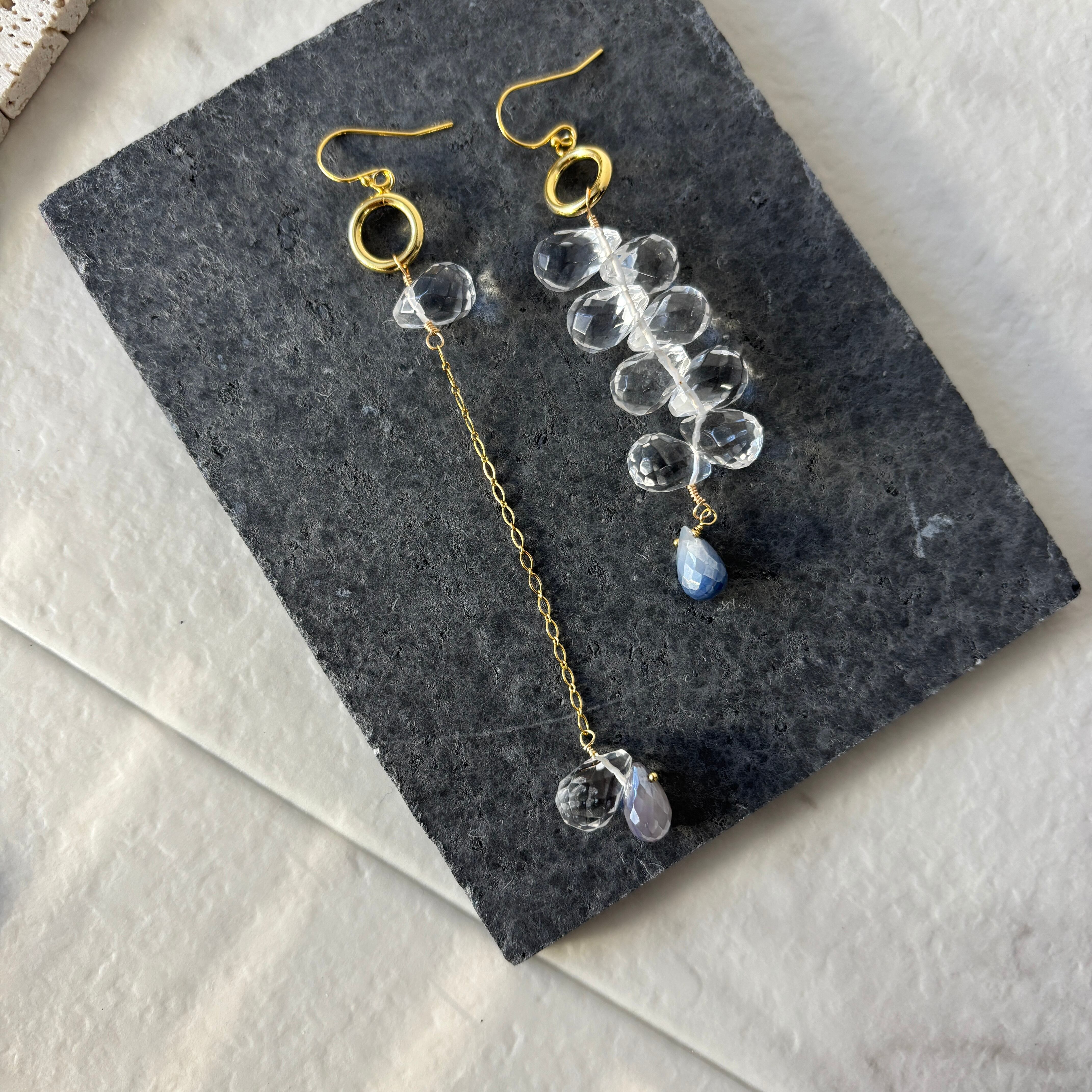 このデザインピアスは、カット水晶を使用した特別な1点物です。オリジナルデザインのアシンメトリーなスタイルが特徴で、シンプルながらも存在感抜群。特別な日のお出かけから普段使いまで、耳元を華やかに彩り、あなたの魅力を一層引き立てるお手伝いができれば嬉しいです。